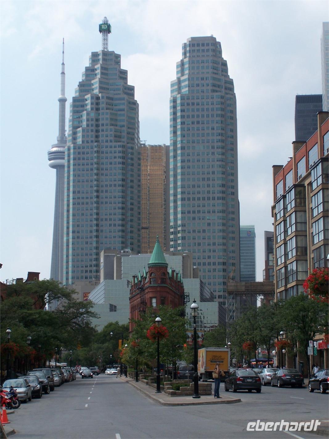 direkt am Ufer des Ontariosees liegt, beherbergt zahlreiche Apartments und Geschäfte, welche aus den alten Speichern entstanden sind. Danach geht es weiter durch die unterschiedlichen Wohngegenden der Stadt. Hier finden sich mitten im Stadtzentrum ärmere Wohngegenden mit zweigeschossigen Häusern. Diese Gemeinschaften haben sich zusammengeschlossen, um nicht durch die großen Immobilienkonzerne plattgemacht zu werden. Es finden vor allem in Richtung Norden aber auch zahlreiche wohlhabende Wohngegenden. Als Beispiel dafür fahren wir durch Rosedale. Nach einem Fotostopp am Casa Loma, dem berühmten Schloss Torontos, fahren wir wieder Richtung Ontariosee. Ein Teil der Gruppe entscheidet sich das Royal Ontario Museum zu besuchen. Ein Andere Teil waagt die Auffahrt auf den 553 m hohen CN-Tower. Mit den übrigen Gästen unternehme ich einen Spaziergang zum St. Lawrence Market. Für den Nachmittag haben wir uns zu einer Fahrt auf Centre Island verabredet. Die Insel im Ontariosee ist der Stadt vorgelagert. Von hier aus genießt man einen sagenhaften Blick auf die Silhouette der Millionenstadt.