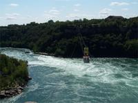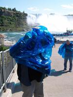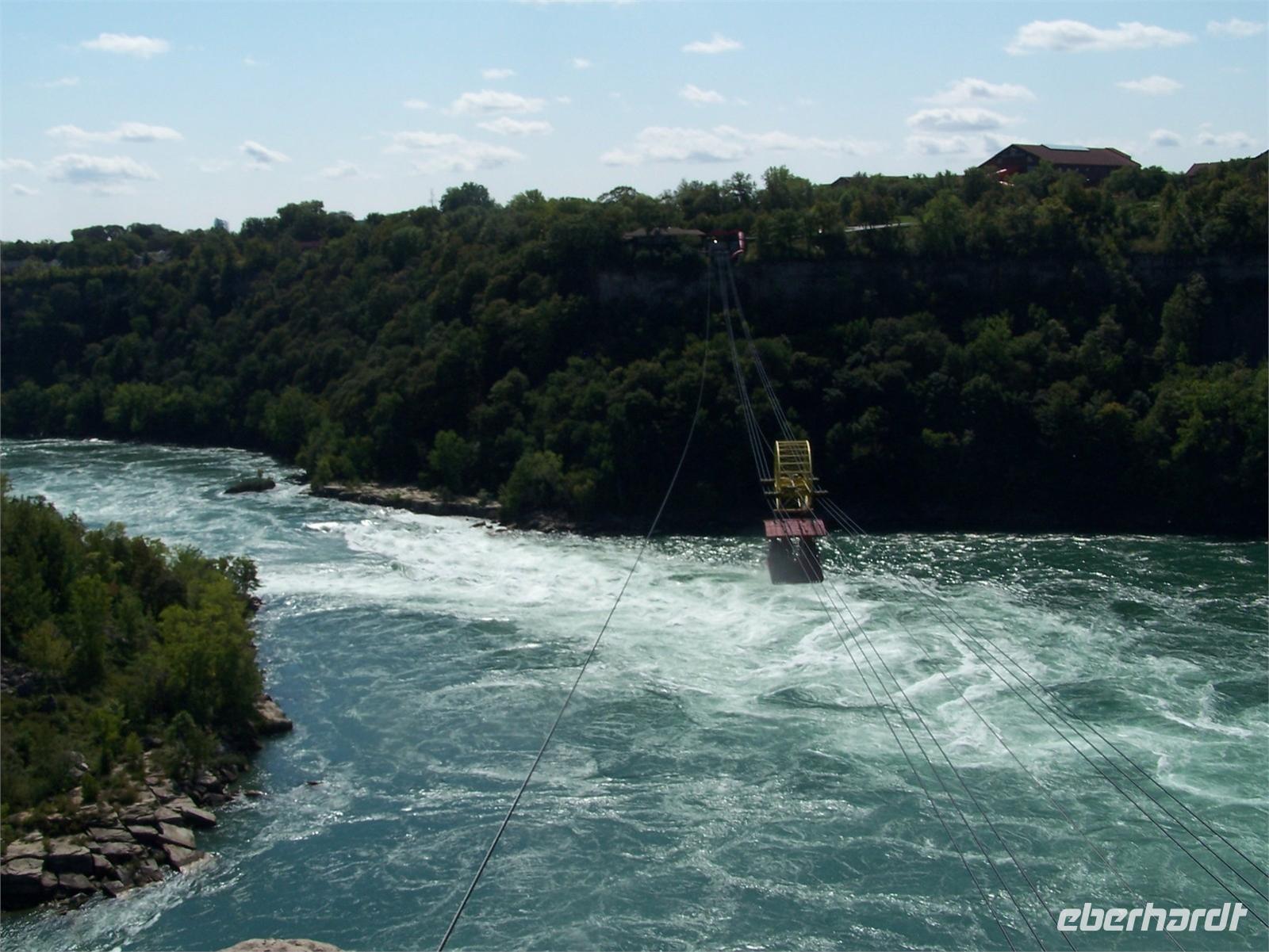 Doch bevor wir zu den Fällen vorstoßen stoppen wir an der spanischen Gondel, welche über den so genannten Whirlpool verläuft. Getragen durch sechs Halteseile führt die Gondel seit 1916 über das Gewässer. Wir verzichten auf eine Fahrt und erreichen über den Niagara-Parkway die Fälle. Von weiten kündigen bereits Casinos und große Hotels dieses Naturschauspiel an. Für uns ist zunächst eine Fahrt mit der Maid of the Mist geplant. Diese Gesellschaft bietet seit 1846 fahrten direkt an die Fälle an. Ausgestattet mit einem blauen Regenponcho, den jeder Fahrgast kostenfrei bekommen, gehen wir an Bord. Wir haben uns mental darauf eingestellt nass zuwerden. Das Wetter ist wie in den letzten Tagen recht warm. Das Boot fährt zunächst vorbei an den amerikanischen Fällen. Fotografieren ist schwierig, falls man keine Wasserfeste Kamera dabei hat. Danach geht es zu den kanadischen Fällen. Wrr fahren bis in an die Fälle heran und es wird schon etwas feuchter.