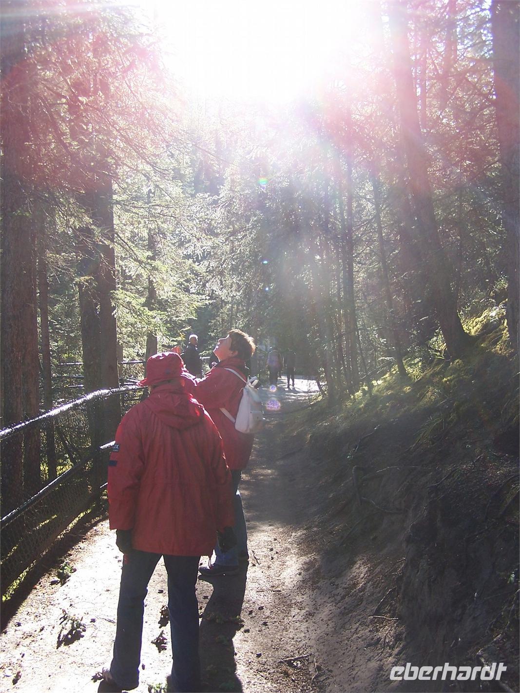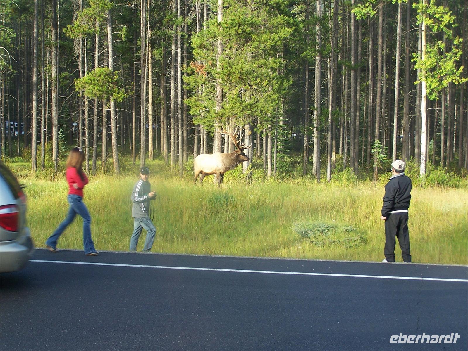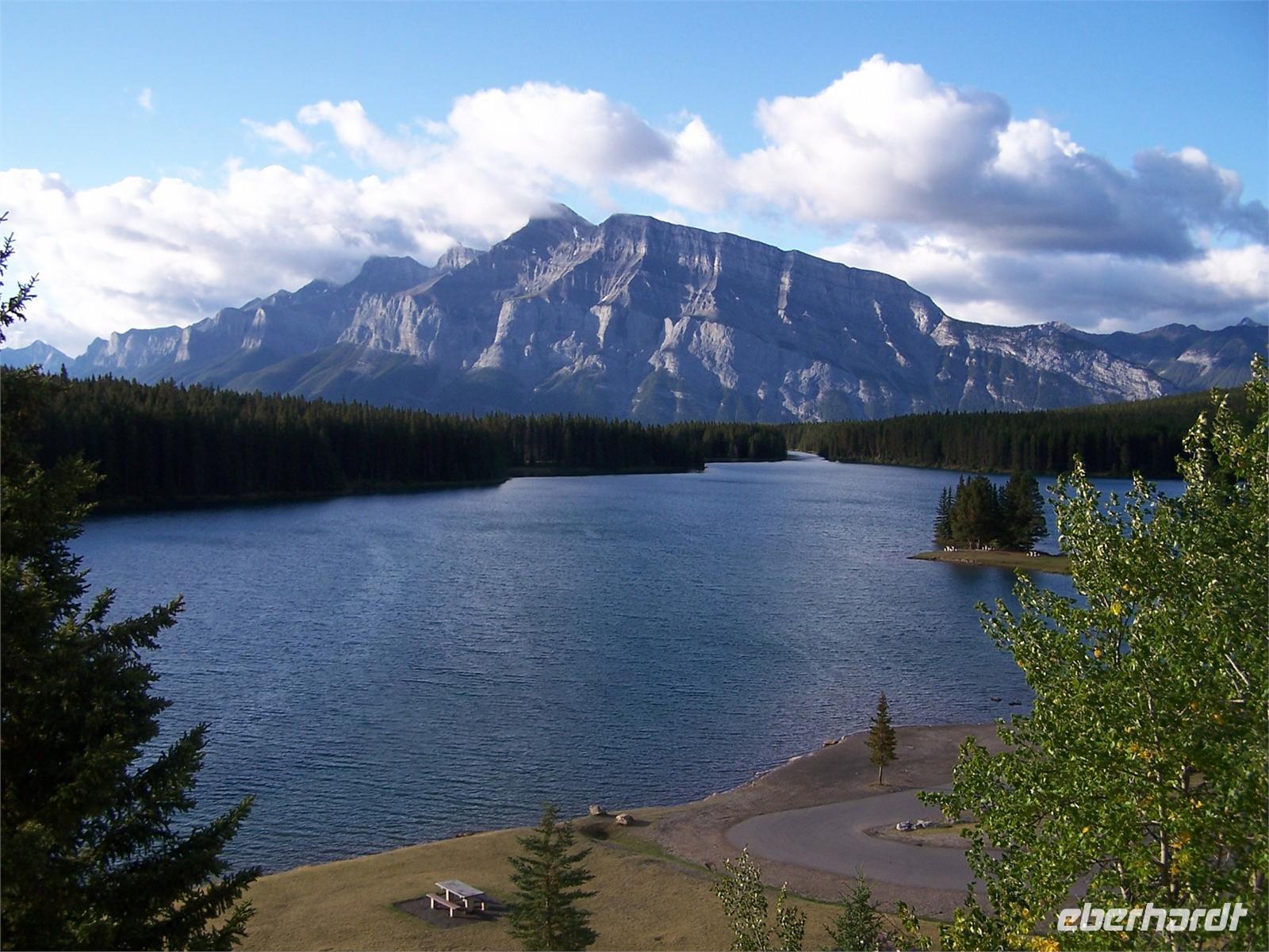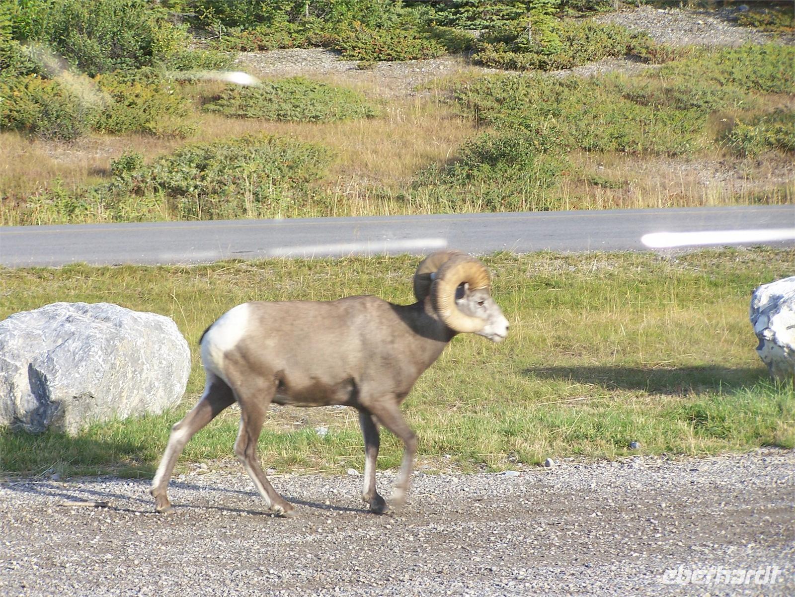 Wir fahren zunächst zum Two Jack Lake. Und gleich beim ersten Abstecher vom Highway ein Treffer! Wir sehen zwei Dickhornschafe, die es sich am Rastplatz in der Nähe des Sees gemütlich gemacht haben. Sie lassen sich von uns und anderen Besuchern nicht aus der Ruhe bringen. Jetzt sind alle wach. Jeder schaut gespannt in den Wald und auf die Lichtungen während weiter nach Lake Louise fahren. Auf dem Weg dorthin macht unser Reiseleiter den Vorschlag bei dem schönen Wetter (immerhin 16°C, bewölkt) nicht picknicken wollen. Gesagt getan. In Lake Louise steuern wir einen Supermarkt an und jeder deckt sich nach Bedarf mit Lebensmitteln ein. Nach dem Einkauf setzen wir unseren Weg fort in den Yoho-Nationalpark. Ein Stopp an den Spiraltunneln ist natürlich nur imposant, wenn gerade ein Zug die Tunnel passiert. Wir haben leider Pech - kein Zug! Das Wetter ist immernoch gut. Unser heutiger Picknickplatz ist nur mit einem kleinen Bus, wie dem unseren, erreichbar. Bastiann hat heute den Rastplatz am Takakkawfall für das Mittagessen ausgewählt. Einmalig! Wir sind fast allein und direkt in der Wildnis. Ganz gemütlich essen wir und freuen uns über diesen ausgesprochen schönen Platz. Danach spazieren wir noch bis zu den Fällen. Die Wege sind gut befestigt und für jeden problemlos machbar. Ebenfalls für den naturverbundenen Pauschaltouristen geeignet war die Wanderung im Johnston-Canyon. Wir haben zirka 1 Stunde und 30 Minuten Zeit. Das genügt, um gemütlich bis zum ersten Wasserfall zu spazieren. Nach einer kurzen Erfrischungspause im Hotel machen wir uns auf zum Abendessen in einem schweizer Restaurant.