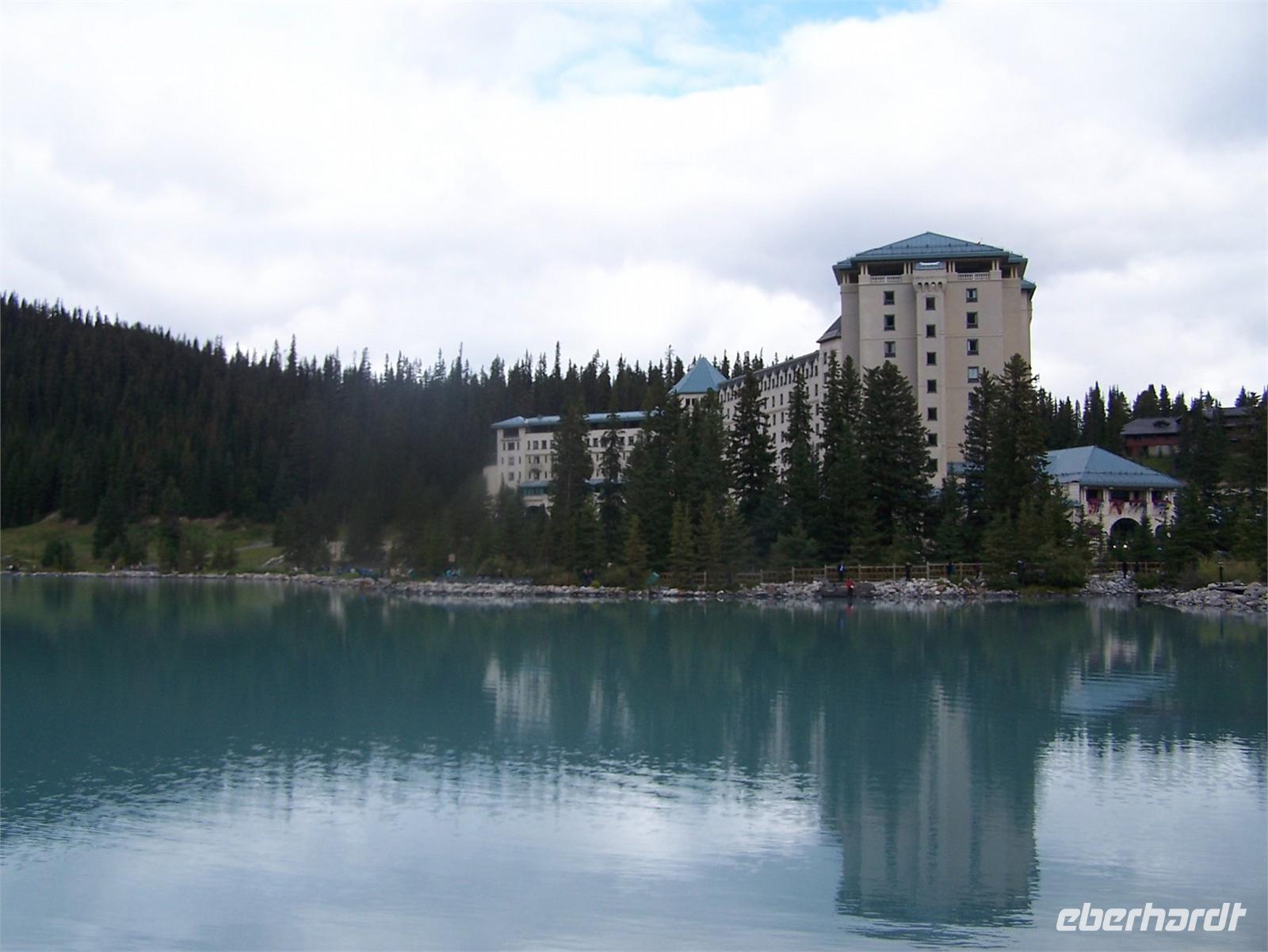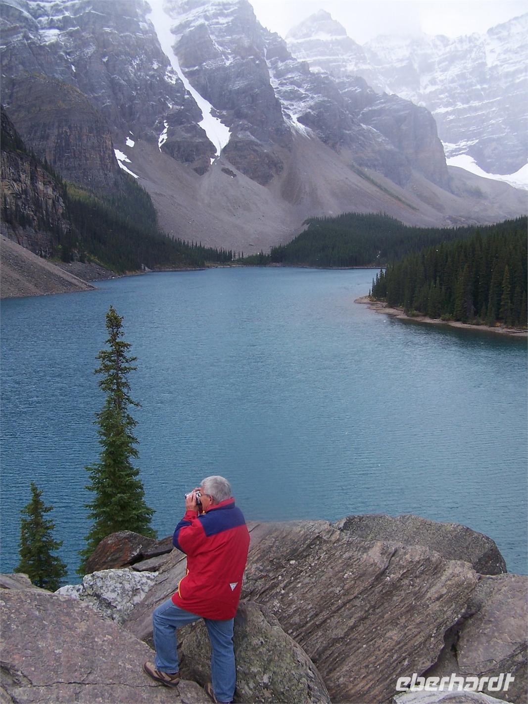 Es ist Wochenende und "ausschlafen" ist angesagt. Wir starten erst um 9 Uhr. Zunächst statten wir dem berühmten Lake Louise einen Besuch ab. Das gleichnamige Städtchen kennen wir schon vom Vortag. Direkt am See gelegen ist das Chateau Lake Louise, ein Luxushotel, dass früher der Kanadischen Eisenbahn gehörte. Das Wetter ist für unseren Besuch nicht ganz ideal. Im Anschluss geht es weiter zu einem See der eigentlich nicht im Programm stand. Der Moraine Lake befindet sich aber unweit unserer heutigen Route. Der Weg lohnt sich. Nur wenige Japaner und Chinesen sämen hier unseren Weg. Das ermöglicht uns endlich die Ruhe in den Bergen zu genießen.