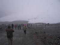 Nach einem kleinen Spaziergang geht es weiter gen Norden. Es zeichnet sich ab, dass das Wetter schlechter werden wird. Wir entscheiden uns trotzdem wieder ein Picknick zu machen. Bastiaan gräbt einen unglaublichen Rastplatz aus. Diesmal sind wir ganz unter uns. Der Blick ist atemberaubend und alle sind ausnahmslos begeistert. Da stört es auch nicht, dass es heute etwas kühler ist (10-12°C, bewölkt). Gestärkt setzen wir unsere Fahrt fort. Wir fahren fortan auf dem Icefields-Parkway. Diese Straße zählt wohl zu den schönsten Panoramastraßen Nordamerikas. Die Straße führt unter anderem auch am Athabasca-Gletscher vorbei. Leider sehen wir zunächst vom Gletscher nicht viel. Es ist ziemlich nebelig, weshalb wir uns gegen die Tour mit dem Gletschermobil entscheiden. An Stelle dessen nehmen wir einen Wanderweg, der in die Nähe des Gletschers führt. Einige Gäste entscheiden sich stattdessen einen Kaffee im Besucherzentrum zu trinken. Nachdem wir zirka 10 Minuten unterwegs waren setzt heftiger Schneefall ein. Egal, jetzt sind wir einmal unterwegs und fast alle beißen sich bis zum Rand des Gletschers durch. Die Folgen unseres verschneiten Ausflugs werden uns die nächsten Tage in Form von Schnupfen und Husten begleiten. Wie schnell sich das Wetter in den Bergen ändern kann führt uns Mutter Natur ebenfalls am Gletscher vor Augen. Als wir 14:15 Uhr hier ankamen war kaum ein Blick auf den Gletscher zu erhaschen. Jetzt, etwa eine Stunden später, ist der Blick auf den Gletscher frei.