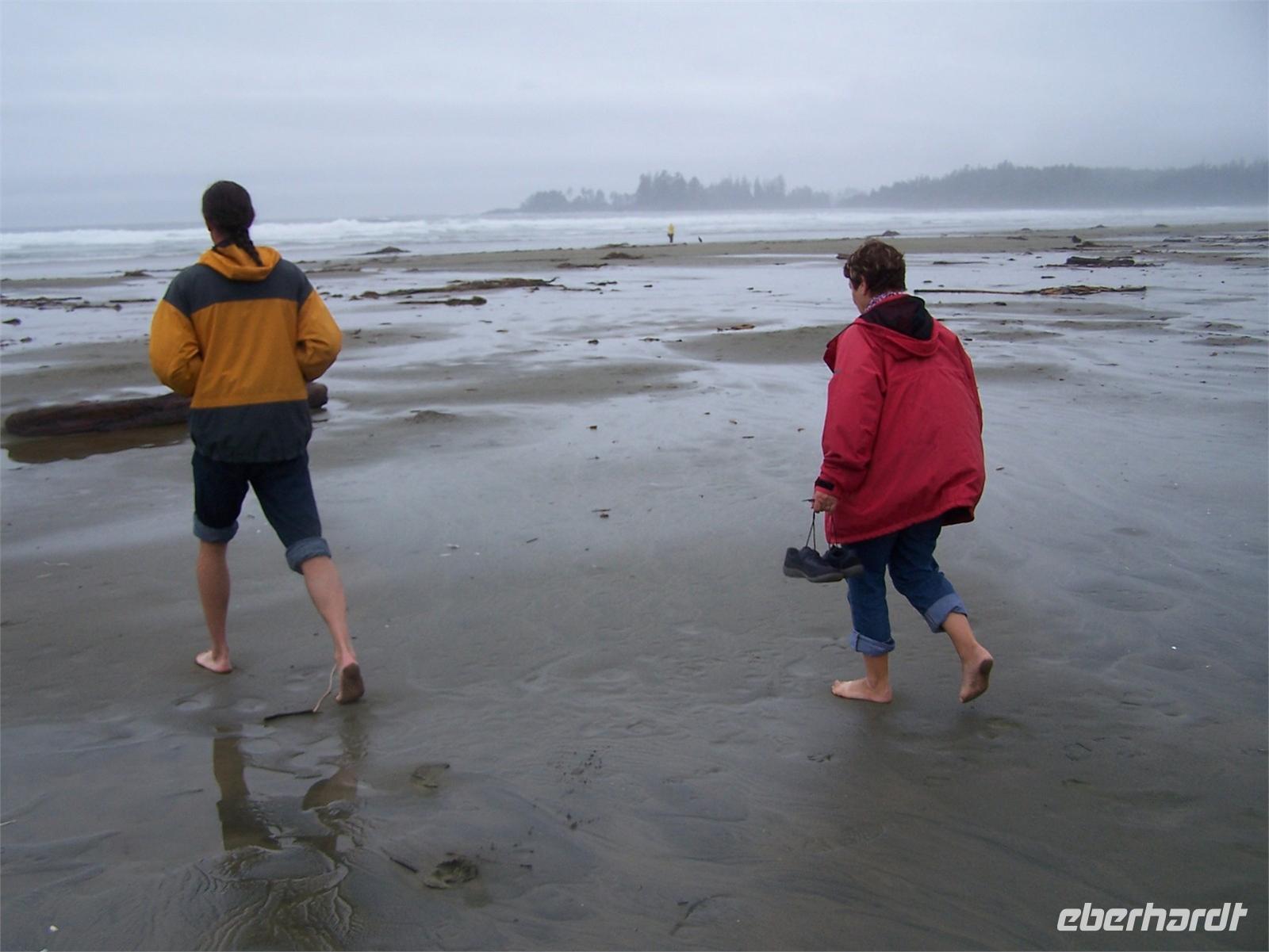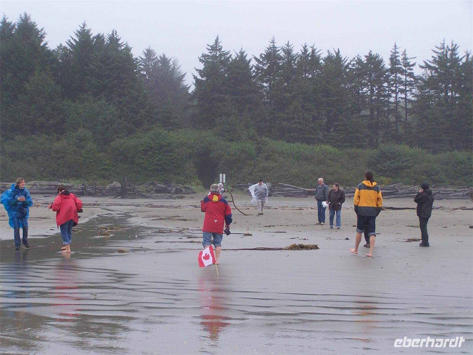 Danach gehts zum Aufwärmen ins Hotel. Der ein oder andere genießt auch mal die freie Zeit, um zur Ruhe zu kommen. Am Nachmittag verabreden wir uns um 14 Uhr für eine Fahrt in das Örtchen Tofino. Alle sind an Bord für den Ausflug nach Tofino. Auch wenn die Information überflüssig ist, aber es regnet immernoch. Tofino bietet als nicht gerade viel. Die Hauptsehenswürdigkeiten sind schnell erkundet. Für uns ist es eher eine Versorgungsfahrt. Viele wollen oder müssen mal zur Bank oder auf die Post. Ebenfalls benötigt wird der Supermarkt, um sich mit Kleinigkeiten für den weiteren Verlauf der Reise einzudecken. Ein lohnenswerter Spaziergang führt uns von Tofino aus zum Tonquin Park. Ein einsamer Strandabschnitt umgeben von Regenwald. Halb vier sind wir wieder zurück am Hotel. Die Chefin des Hauses, Olivia, hat sich Zeit genommen uns etwas über die Geschichte dieses Ort zu erzählen. Mit viel Fantasie und Witzt führt sie uns durch ihr Anwesen. Ich persönlich habe den Eindruck das die Fantasie, die Realität zu weilen überflügelt, aber der guten Stimmung tut das keinen Abbruch.