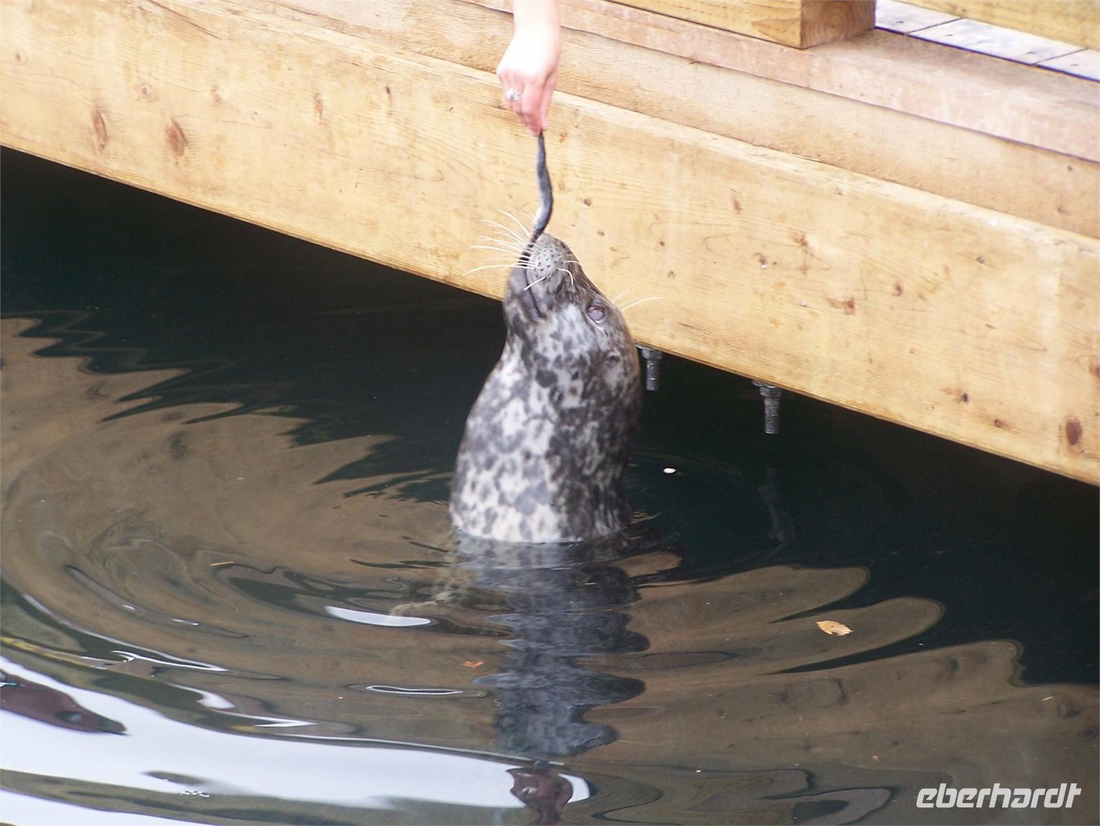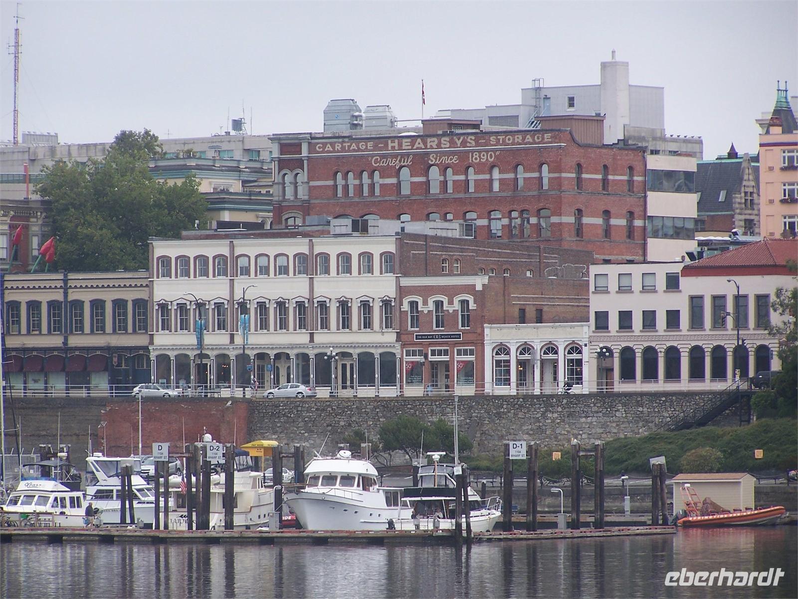Petrus hat uns wieder lieb. Die Sonne scheint über Victoria. Ab und an mischt mal eine Wolke dazwischen, aber das stört uns nach den vergangenen regenreichen Tagen nur wenig. Victoria bietet für jedes Interesse etwas. So ist es auch nicht verwunderlich, dass sich die Gruppe aufteilt. Ein kleiner Teil besucht am Vormittag die Miniaturwelt, ein größerer Teil schließt sich einem Spaziergang durch den Hafen und die Innenstadt von Victoria an. Der Spaziergang führt uns zunächst vorbei am Parlamentsgebäude bis nach Fisher Man´s Wharf. Diese kleine Siedlung von Hausbooten mit einem angeschlossenen Markt begeistert uns sofort. Beim Bummel über die Stege entdecken wir dann sogar noch einen Seehund, der sich an dieser Stelle anscheinend eingerichtet hat. Weiter geht es mit dem Hafentaxi zurück Richtung Canoe Club. Mein Vertrauen gewinnen die kleinen Boote zunächste nicht. In jedes Boot passen maximal 12 Personen. Bastiaan telefoniert kurz und wir bekommen ein eigenes Boot für unsere Gruppe. Von der Anlegestelle am Canoe Club aus erkunden wir weiter zu Fuß die Innenstadt. Zwischen Yates und Fort Street warten zahlreiche Innenhöfe nur darauf entdeckt zu werden.
