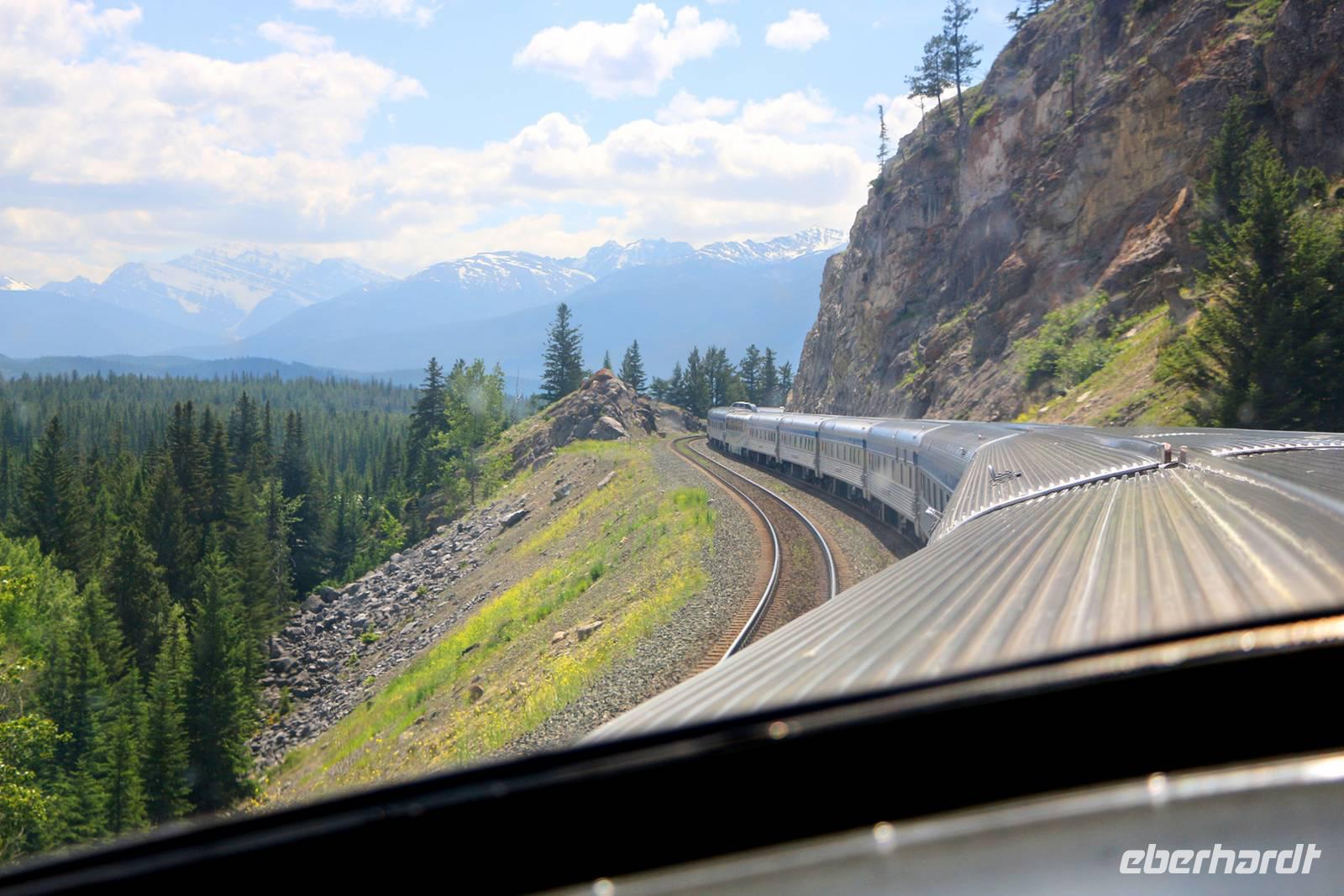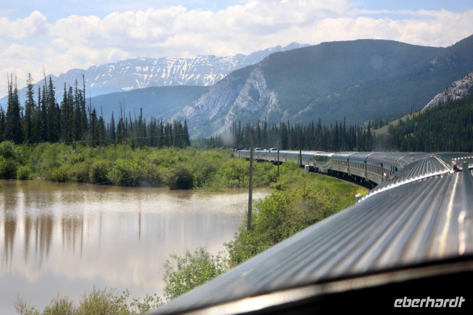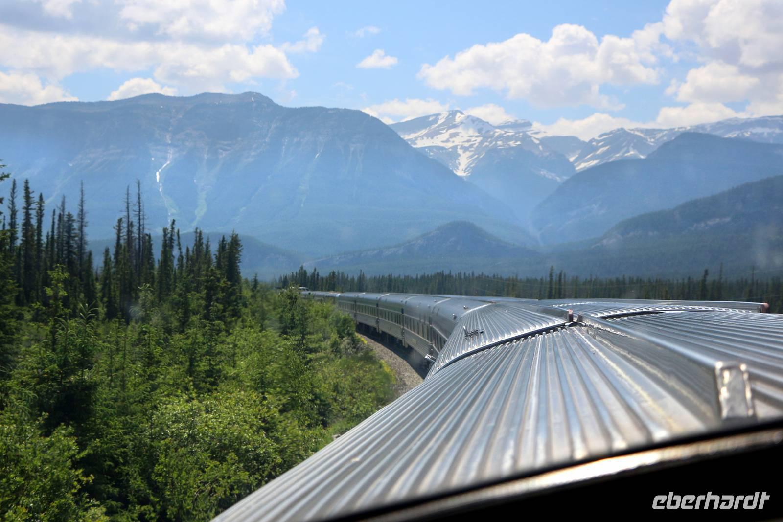 Am Mittag ging es zum Bahnhof von Jasper, wo wir für unsere Weiterfahrt mit dem "Canadian" eincheckten. Um 14.30 Uhr ging unsere Zugfahrt von Jasper nach Vancouver pünktlich los. Über den Yellowhead-Pass verließen wir die Rocky Mountains und fuhren durch die Berglandschaften der Caribou und Revelstoke Mountains in der Provinz British Columbia. Noch eine Nacht verbrachten wir in unseren Schlafabteilen im "Canadian".