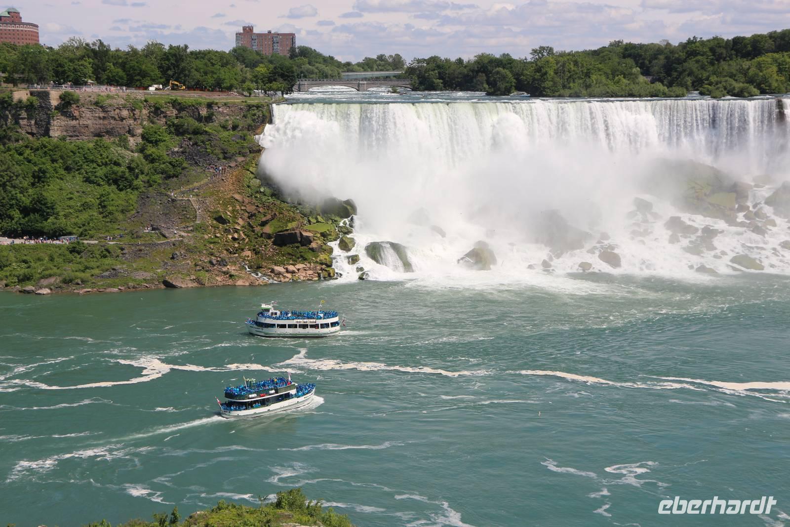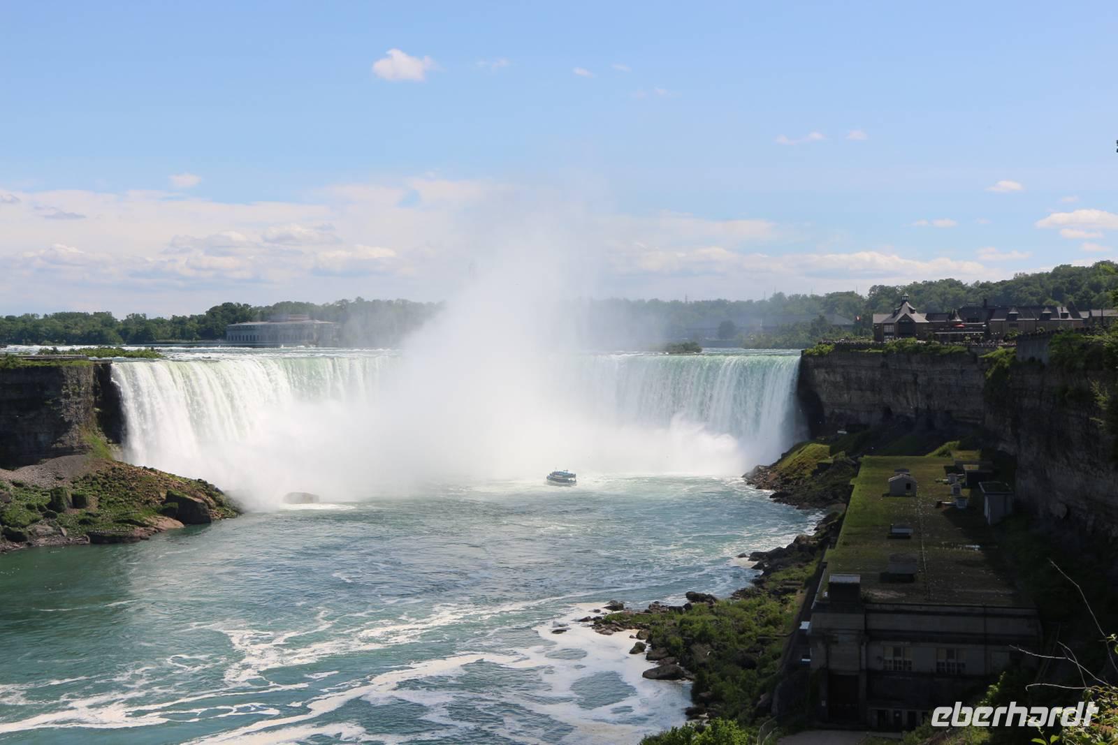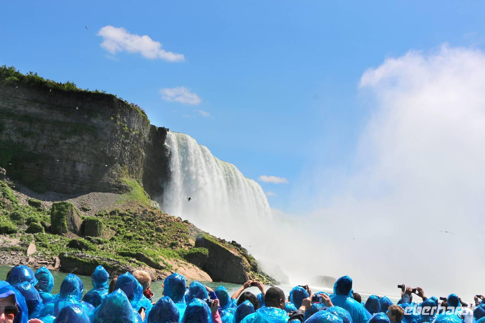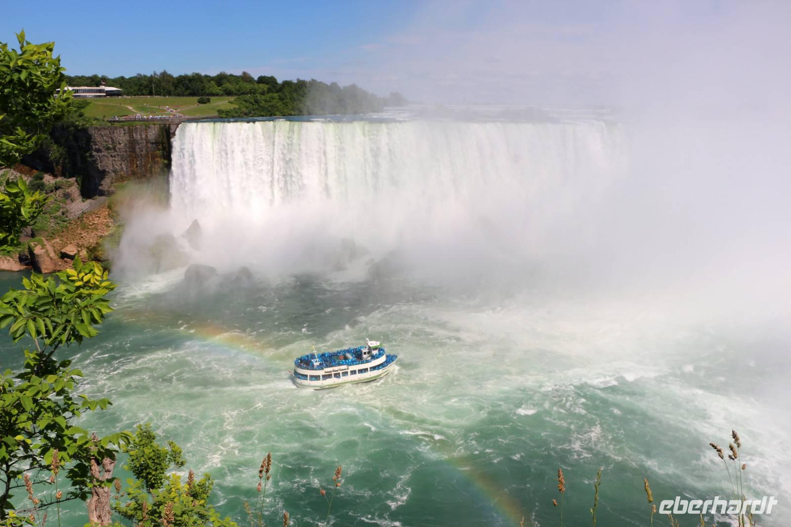 Nach der Mittagspause traten wir unseren Ausflug zu den weltberühmten Niagara-Fällen an. Fast zwei Stunden waren wir mit dem Bus über die Autobahn unterwegs. In Niagara angekommen, mischten wir uns unter die Touristenmenge, die wie wir die Bootsfahrt mit den Schiffen der "Maid of the Mist" (Nebel-Mädchen) unternahmen. Wir wurden mit blauen Regencapes ausgestattet, die wir nachher auch als Souvenir behalten konnten. Die Bootsfahrt führte ganz nah an den geraden amerikanischen Niagara-Fällen vorbei und direkt hinein in die hufeisenförmigen kanadischen Niagara-Fälle. Spätestens jetzt merkten wir den Zweck unserer Regencapes ! Die Bootsfahrt dauerte etwa 20 Minuten und war trotz der vielen Besucher ein tolles Erlebnis, was man in Ost-Kanada nicht verpassen sollte. Die Wucht und das laute Getose der Wasserfälle ist so am besten spürbar. Beim Spaziergang entlang des Flusses bis zur Fallkante konnten wir noch einmal schöne Fotos von den Niagara-Fällen bei blauem Himmel und herrlicher Sonne machen.