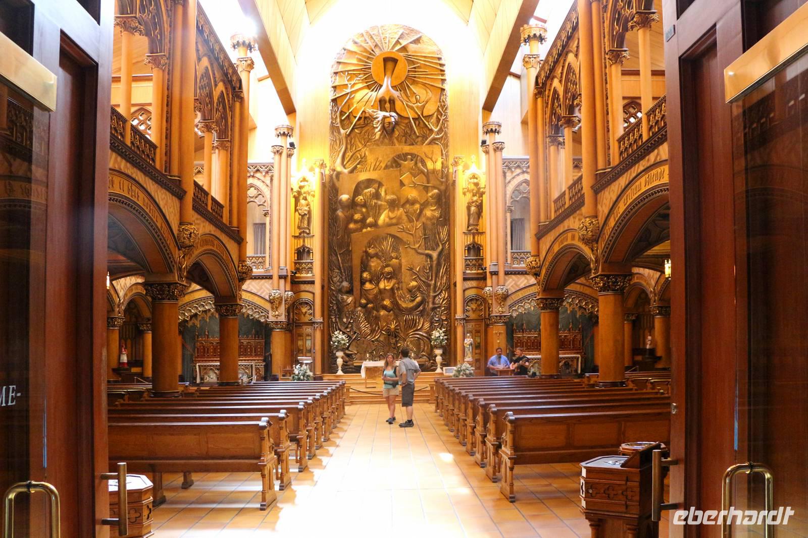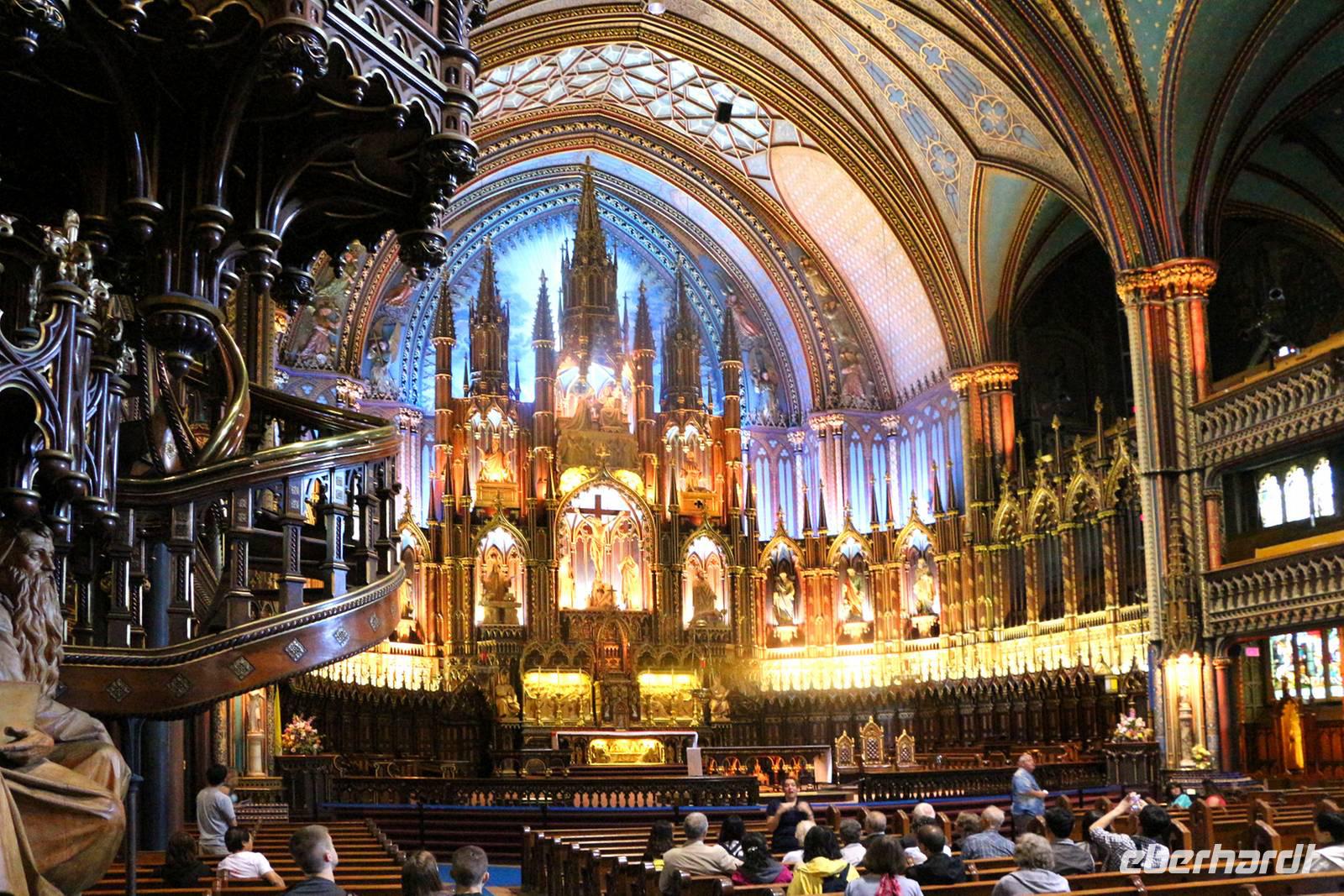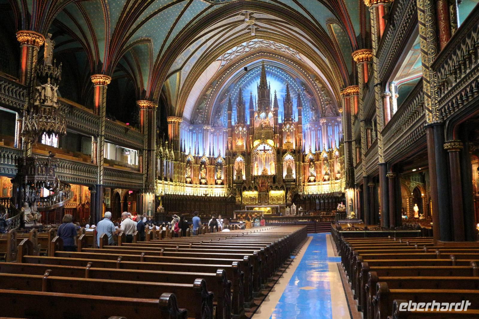 Mit Air Canada flogen wir von Frankfurt/Main nach Montreal und bezogen unser 3-Sterne-Hotel "Le Nouvel" im Zentrum der Stadt, unweit der Haupteinkaufsstraße St. Catherine. Am nächsten Tag begaben wir uns mit unserer kanadischen Reiseleiterin Celine auf Stadtrundfahrt in Montreal. Erstes Ziel war die Basilika Notre Dame, die 1824 bis 1829 im neugotischen Stil am Place d'Armes erbaut wurde. Das Besondere der Kathedrale ist die hölzerne Inneneinrichtung. Bänke, Altar, Treppen und Wanddtafeln bestehen aus reich verzierten Holzschnitzereien. Man kommt sich fast vor wie in einem historischen Opernhaus, als in einer Kirche. Tatsächlich soll die Kirche eine ganz einmalige Akustik haben, sodass hier viele Konzertveranstaltungen Montreals stattfinden. Verpassen sollten Sie auch nicht, einen Blick in die kleinere Holzkapelle nebenan zu werfen - ebenfalls ein Meisterstück der Holzschnitzkunst!