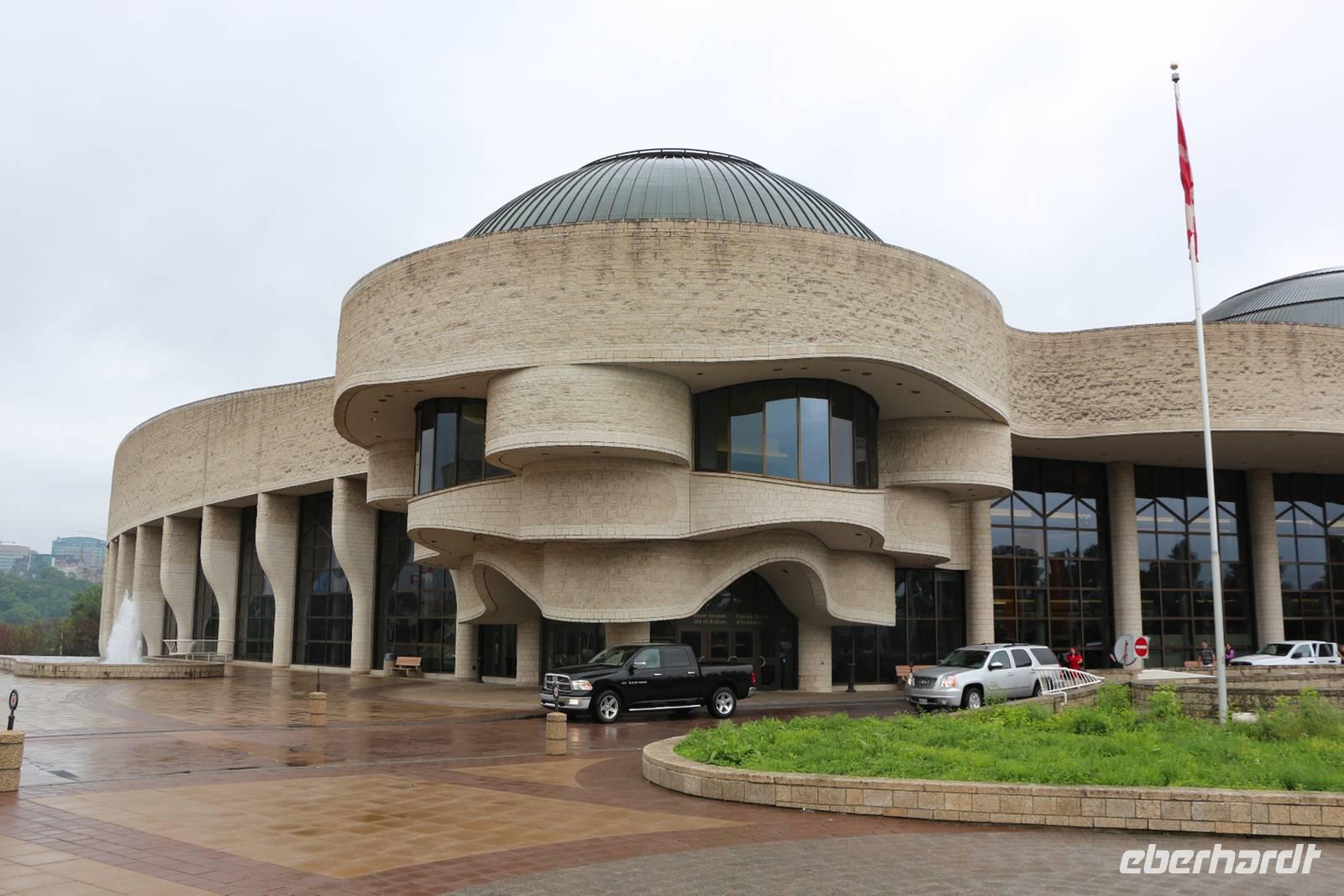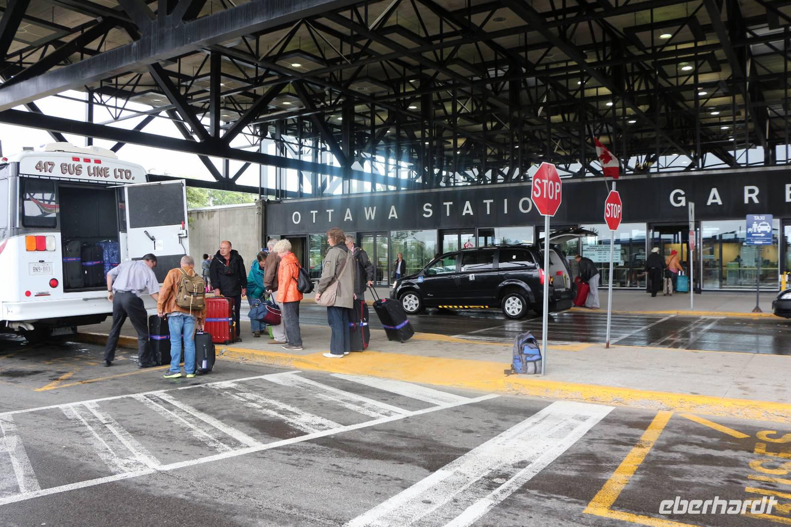 Unsere erste Zugfahrt führte uns im kanadischen Regionalzug "Corridor" von Montreal nach Ottawa. Die Fahrt in dem modernen Zug mit bequemen Sesseln, Bordservice und sogar Wifi-Internetverbindung dauert etwa zwei Stunden. In Ottawa erwartet uns unsere kanadische Reiseleiterin Stephanie. Leider ist das Wetter nicht so gut. Bei Regen begeben wir uns auf Stadtrundfahrt durch Ottawa - die Hauptstadt Kanadas. Zunächst ging es entlang des Rideau-Kanals in die Randbezirke Ottawas mit schönen Wohnhäusern und Botschaftsgebäuden. Zurück in der Innestadt probierten wir am Byward Market die berühmten "Beaver Tails" (Bieberschwänze) - ein in Öl gebackenes Gebäck, was die ovale Form eines Bieberschwanzes hat. Wir fahren am Sitz des Premierministers und am schönen Parlamentsgebäude - gebaut im englischen, viktorianischen Stil - vorbei und über den Ottawa-Fluss hinüber in den Quebecer Stadtteil. Hier befindet sich das Museum of Civilization, jetzt neu Museum of Man genannt, mit seinem Eingang, der einem Indianergesicht gleicht. Von hier hat man eine schöne Sicht auf den gegenüberliegenden Parlamentshügel. In der Eingangshalle des Museums sahen wir uns die Totempfähle der Westküsten-Indianer British Columbiens an. Weitere Besichtigungspunkte waren die Basilika Notre Dame und der Aussichtspunkt, an dem Ottawa- und Gatineau-Fluss zusammenfließen.