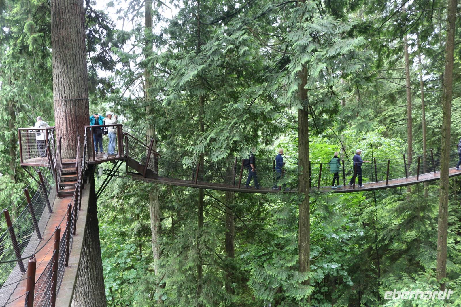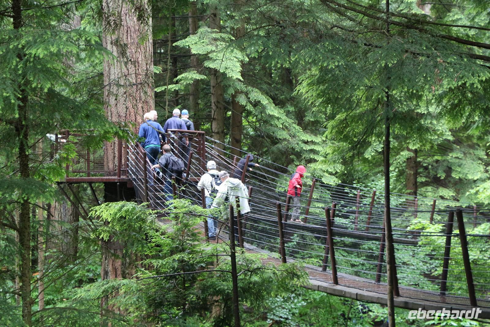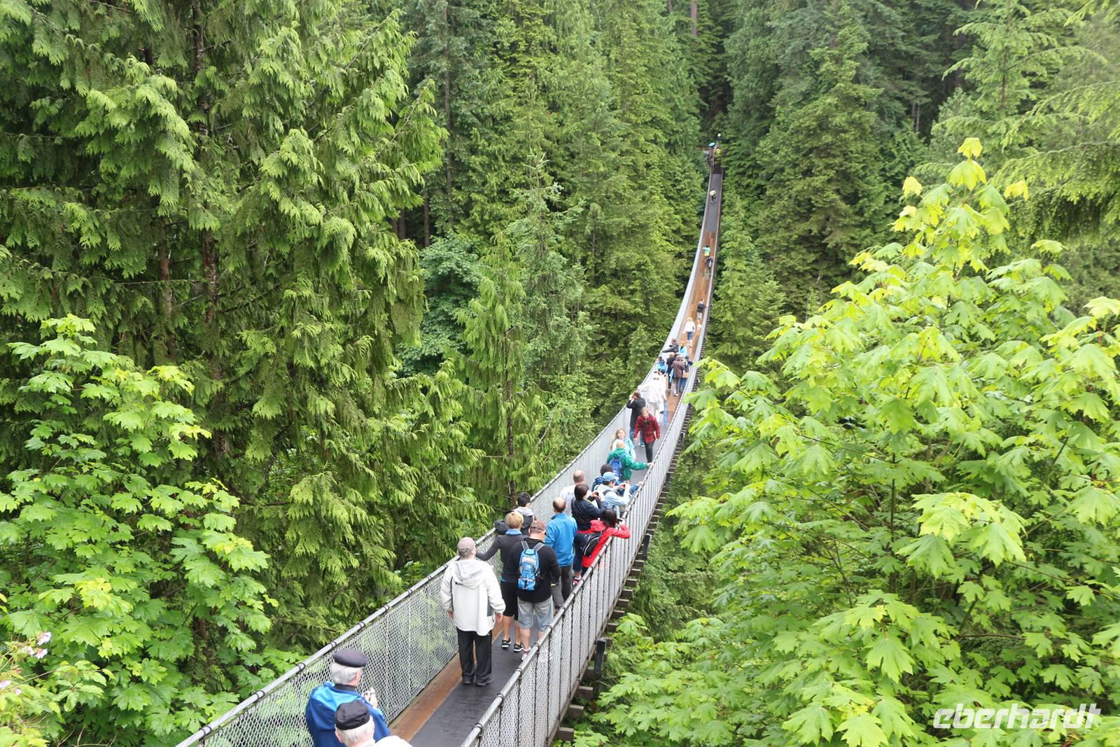 Alle Gäste nahmen heute an unserem fakultativen Ausflug nach Nord-Vancouver teil. Mit dem Bus und unserem Reiseleiter Dieter fuhren wir über die Lion's Gate Bridge zum Capilano Suspension Park. Bei einer kleinen Führung erfuhren wir Wissenswertes zur Geschichte des Parks am Capilano-Fluss und den hier beheimateten Squamish-Indianern. Dann ging es über die 136 Meter lange freischwingende Hängebrücke, 70 Meter über dem Capilano-Fluss. Bei einem Rundgang über die Baumkronenpfade lernten wir noch einmal die Riesenbäume des pazifischen Regenwaldes kennen.