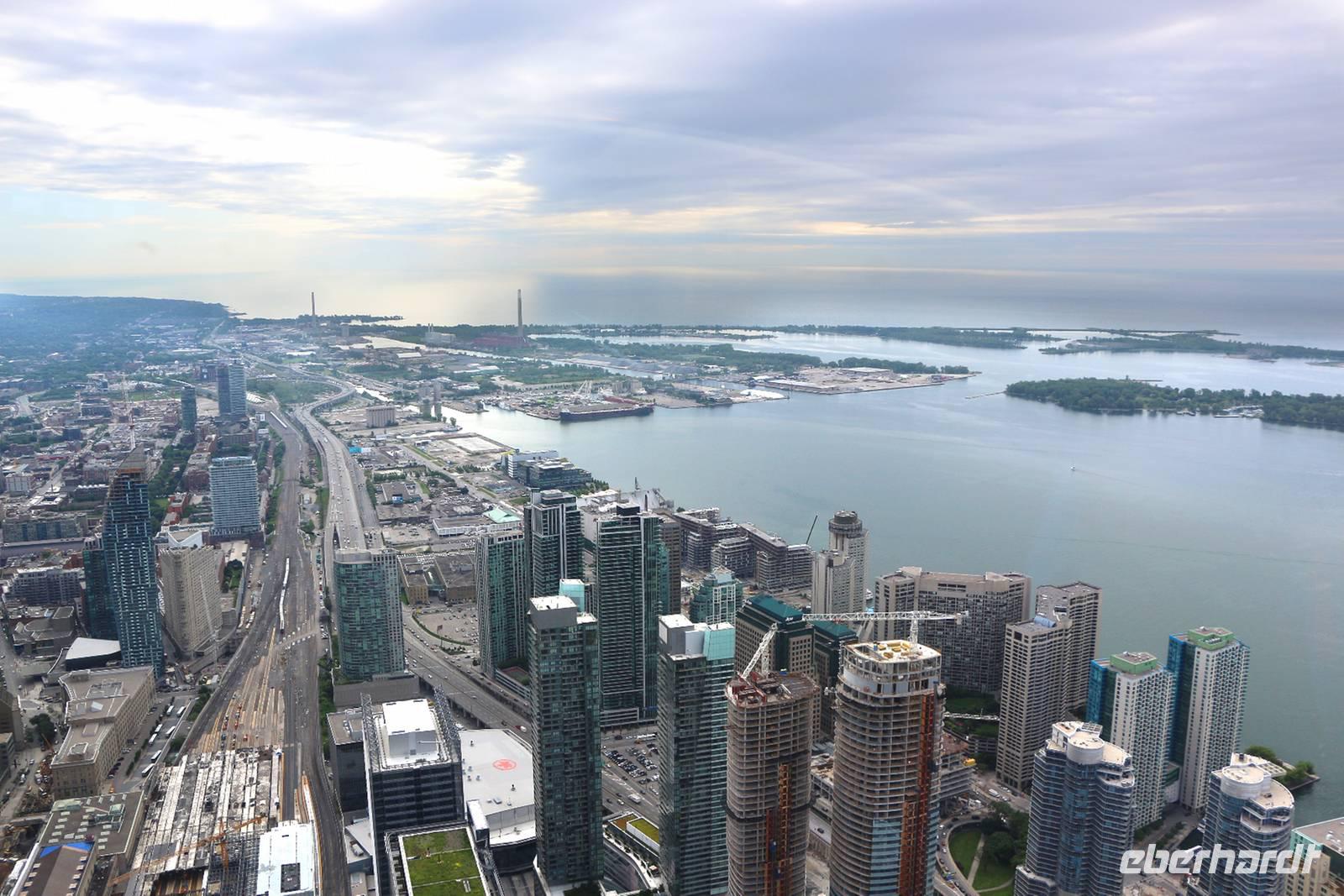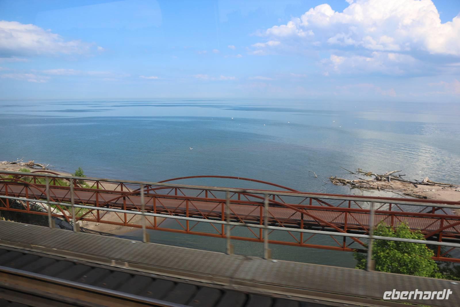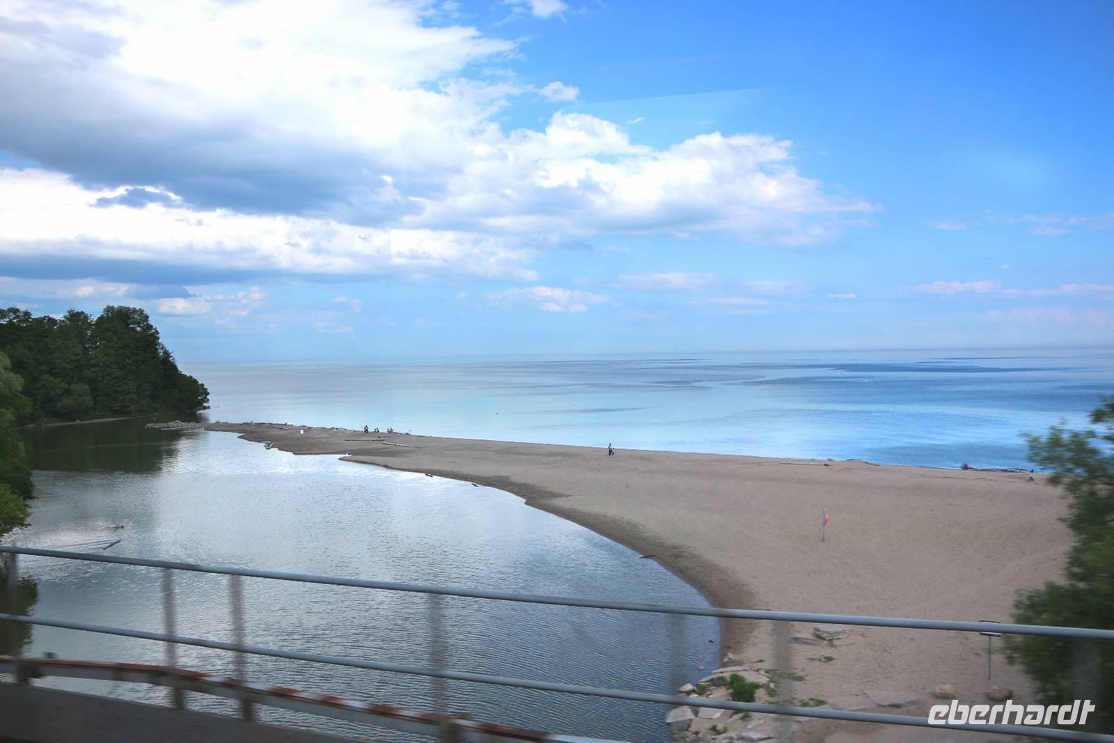 Um die Mittagszeit ging unser Zug (wieder eine Verbindung des "Corridor"-Netzes) von Ottawa nach Toronto am Ontariosee. Die entspannte Zugfahrt dauerte etwa fünf Stunden. Auch hier gab es wieder einen Bordservice, bei dem wir Getränke und Snacks kaufen konnten. Unterwegs sahen wir vor allem ländliche Gebiete, Wälder und Sumpflandschaften. Das letzte Stück der Strecke führte am Ufer des riesigen Ontariosees entlang.