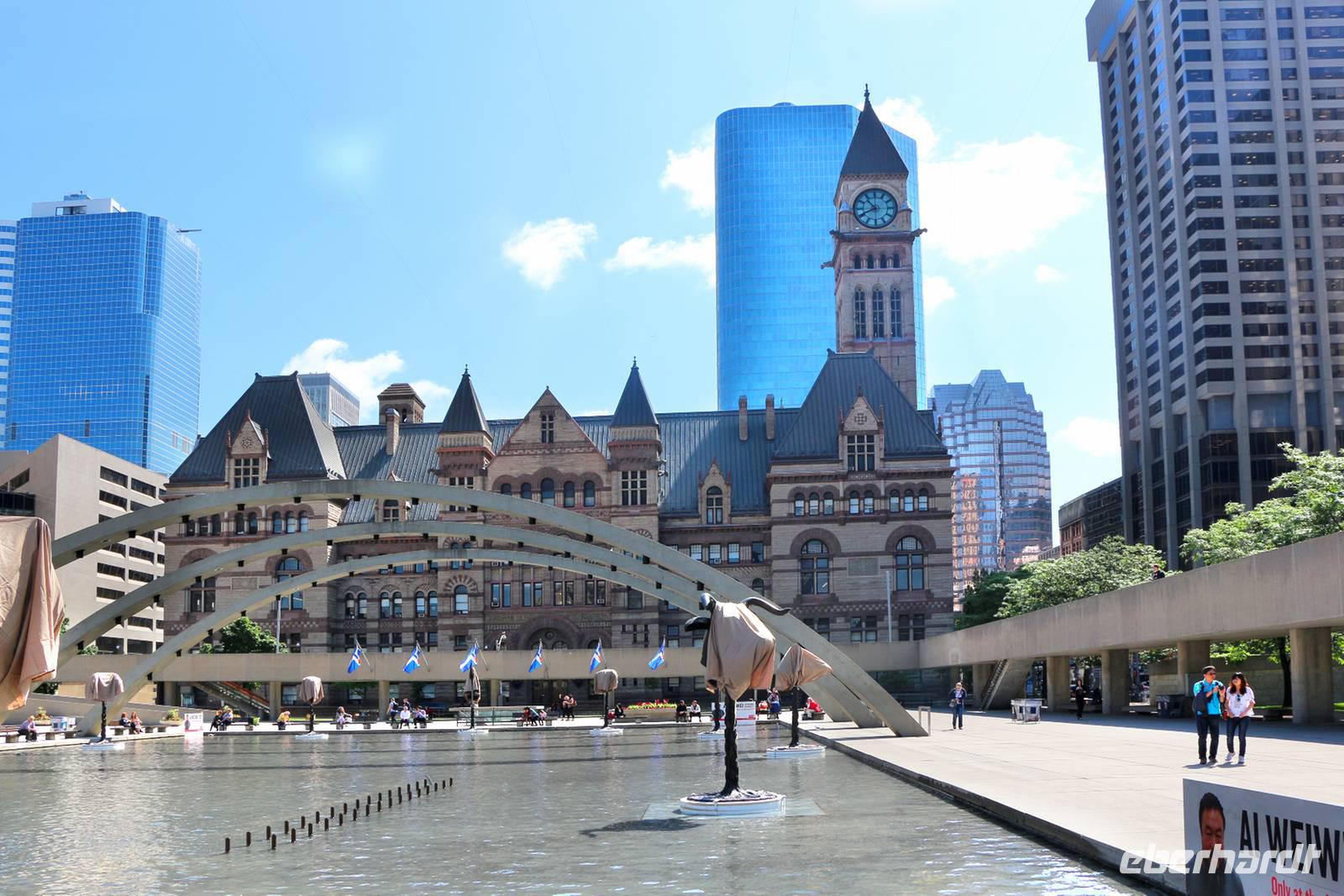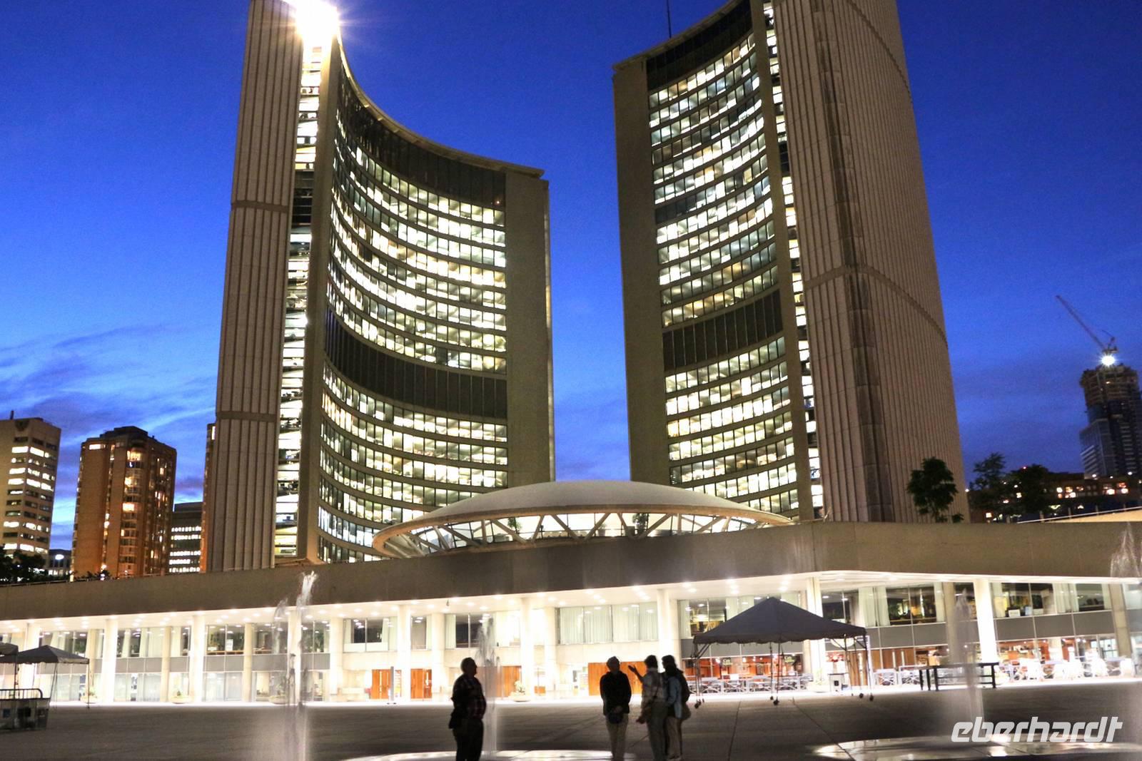 Unsere Stadtrundfahrt führte uns weiter zum St. Lawrence Market, an dem wir das berühmteste Fotomotiv Torontos fotografierten: das historische Bügeleisenhaus aus roten Backsteinen, die zwei Türme des Eaton Centers und den CN Tower im Hintergrund. Weitere Fotostopps legten wir am alten und neuen Rathaus sowie am Parlamentsgebäude ein, bevor unsere Mittagspause am Harbourfront Center (der Hafenfront Tororntos) verbrachten.