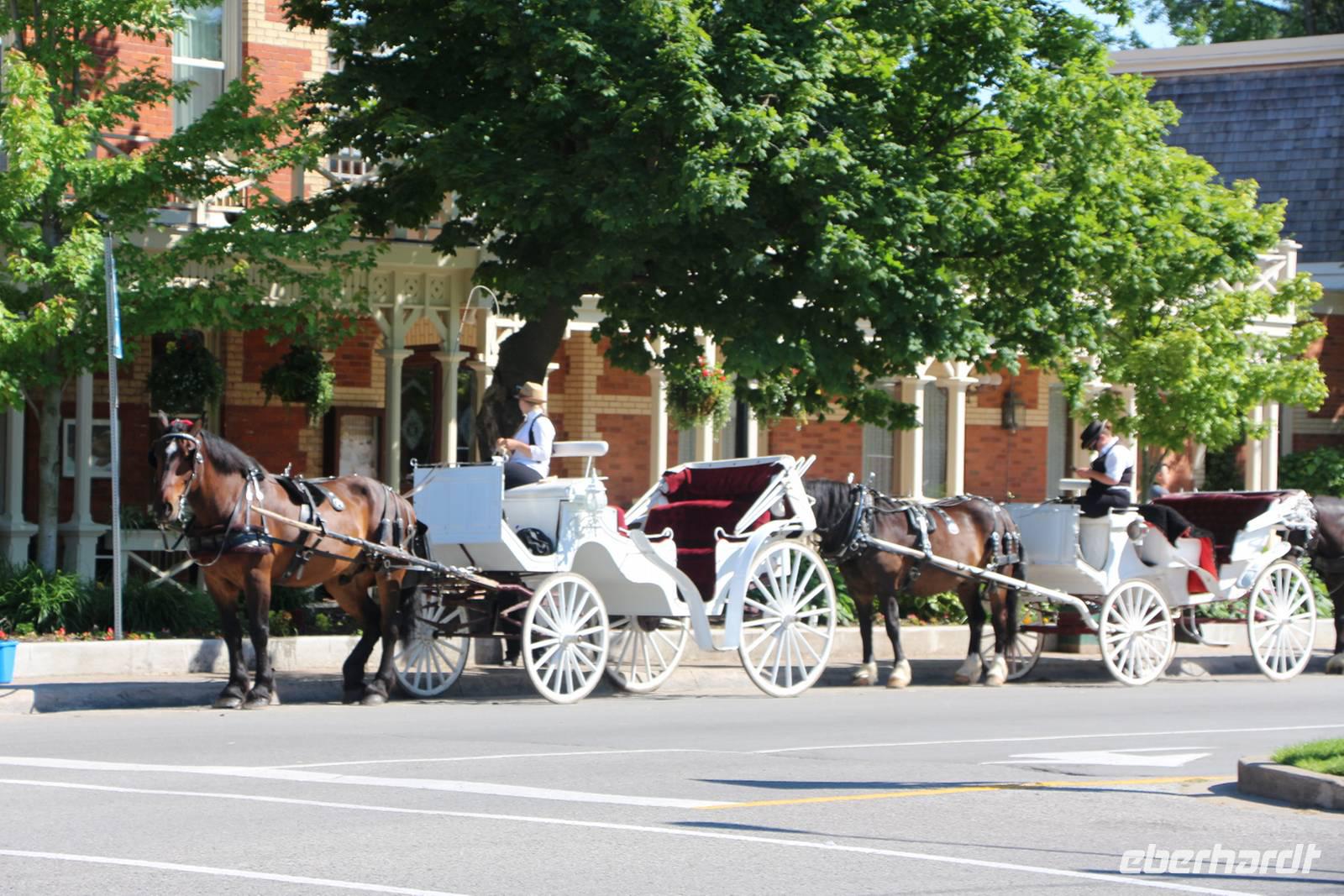Bevor es zurück nach Toronto geht, legen wir noch einen Zwischenstopp in Niagara-on-the-Lake ein. In dem kleinen idyllischen Örtchen scheint die gute alte englische Zeit stehen geblieben zu sein. Wir bummeln entlang der Hauptstraße mit ihren hübschen bunten Holzhäuschen, Cafés und Pferdekutschen.