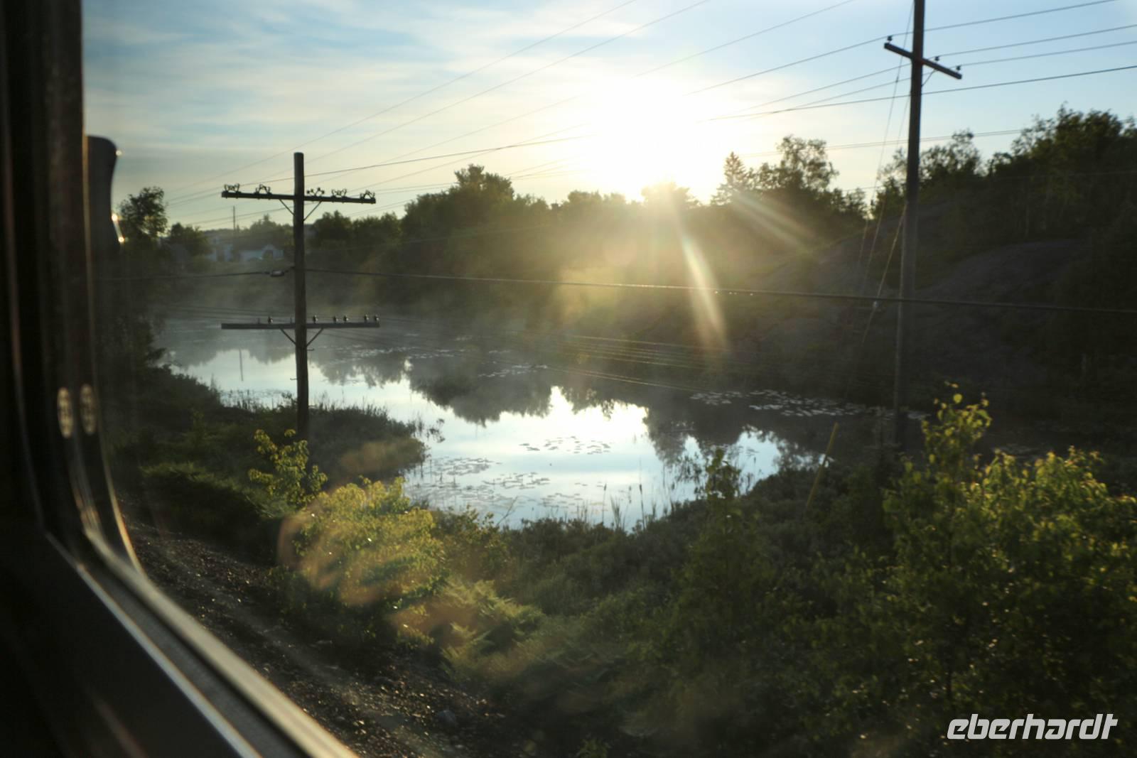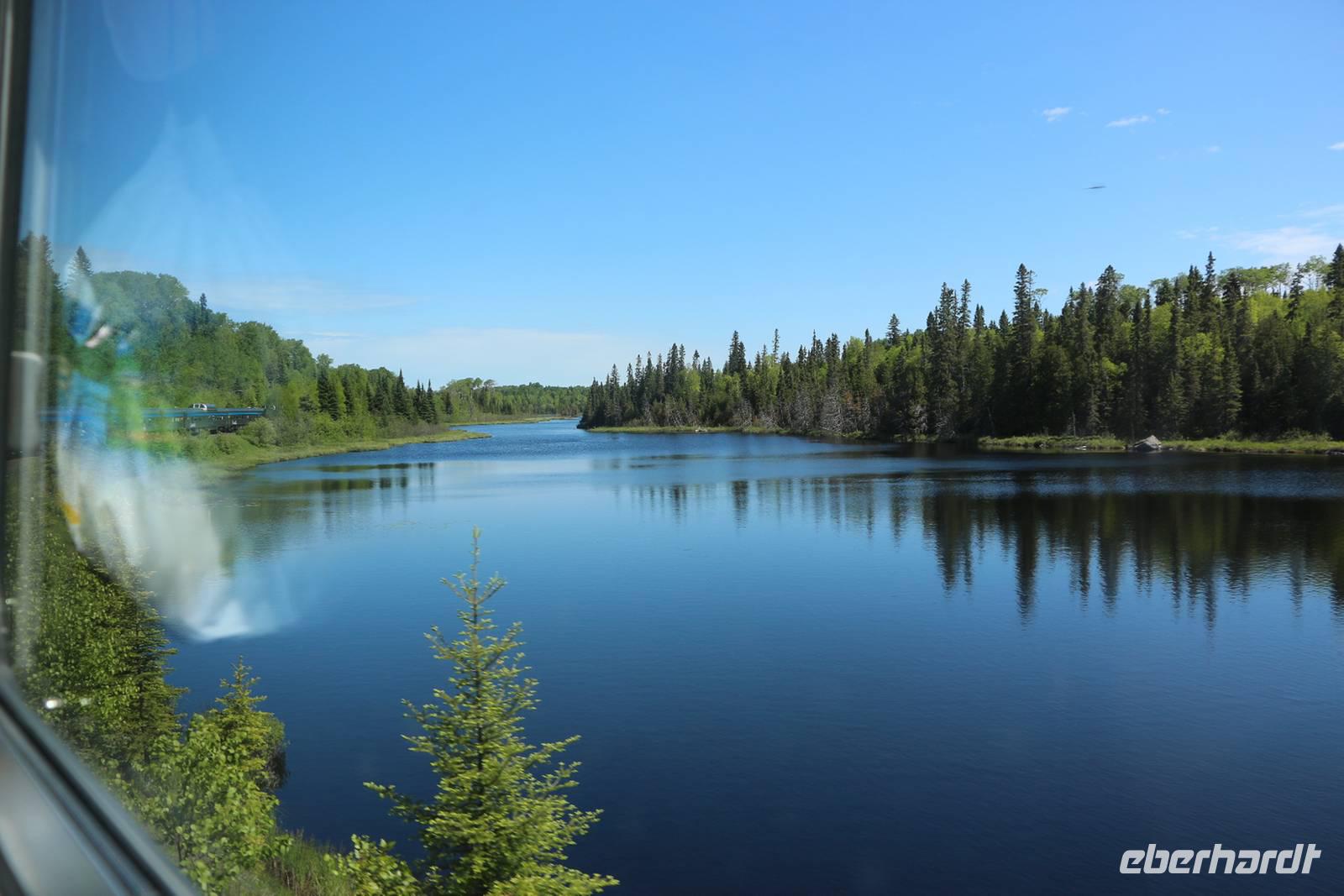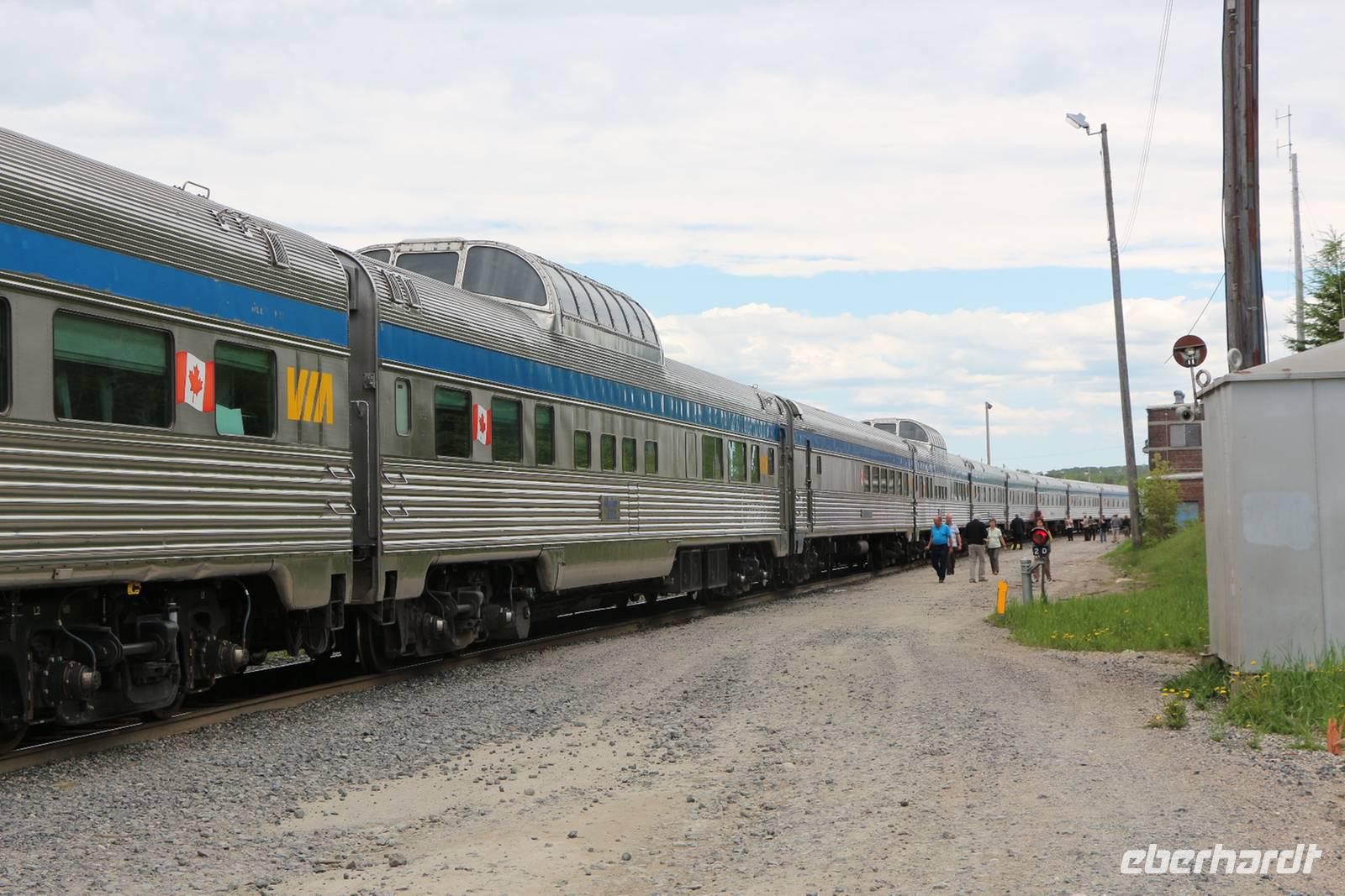 Nachdem wir die Gepäckabgabe und den Check In für unsere Zugreise im Bahnhof von Toronto erfolgreich gemeistert hatten, entspannten wir uns noch bei einem Kaffee in der Panorama-Lounge. Man darf nur zwei bis drei kleine Handgepäckstücke pro Person von max. 11,5 kg mit ins Abteil nehmen, die großen Koffer (max. zwei mit je 23 kg pro Person) müssen für den Gepäckwagen aufgegeben werden. Dann konnten wir unsere Schlafabteile im Canadian beziehen und pünktlich um 22 Uhr fuhren wir in Toronto ab. Die Schlafabteile sind schon ziemlich eng, aber auch irgendwie gemütlich. Ich bezeichne mein Einbett-Abteil immer als "mein kleines Schlafnest". In jedem Abteil gibt es ein Waschbecken und eine Toilette, etwas Stauraum für das Gepäck, ein großes Fenster und zwei bequeme Betten übereinander. Am Tag kann man die Betten vom Kabinen-Stewart hochklappen lassen und es kommen zwei Sessel zum Vorschein. In den sogenannten Activity Cars (den Panoramawagen) trifft man sich zum gemütlichen Beisammensein oder zum Genießen der Aussicht aus den erhöhten Panoramafenstern. In den Speisewagen (Dining Cars) werden Frühstück, Mittagessen und Abendmenü serviert. Es gibt nichts Schöneres, als beim leckeren 3-Gang-Menü oder abends in seinem "Schlafnest" die vorbeiziehende Natur Kanadas zu beobachten! Es ist schon etwas Besonderes, Kanada per Zug zu "erfahren"!