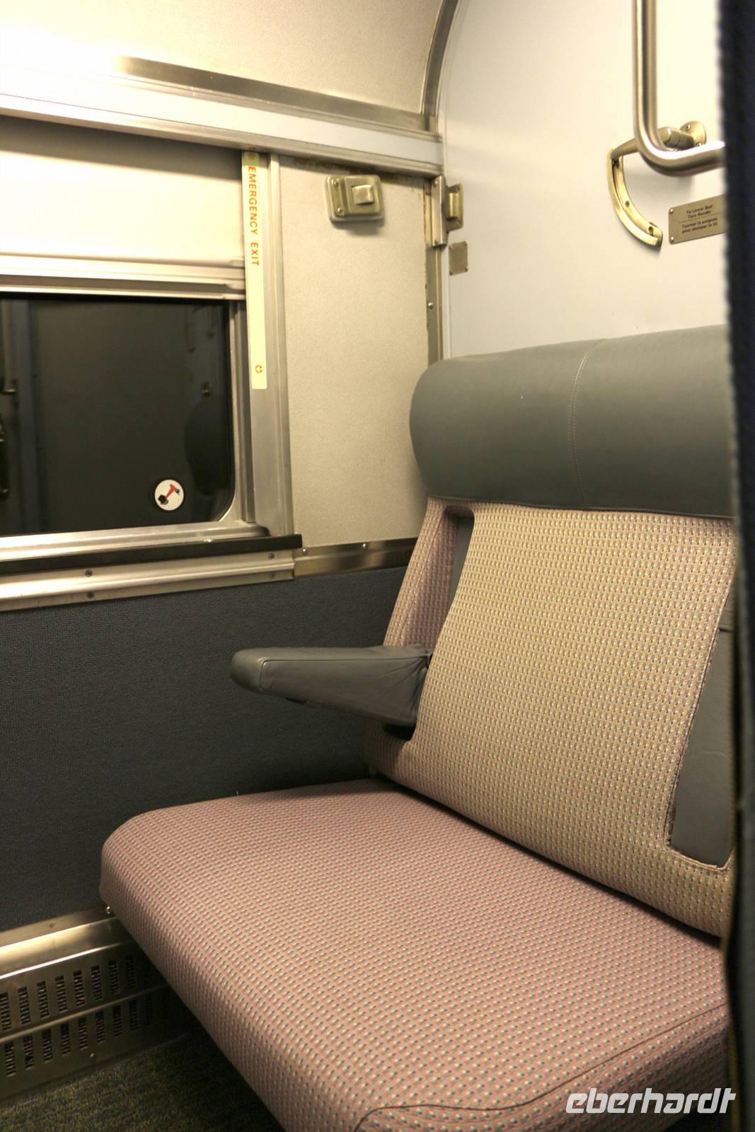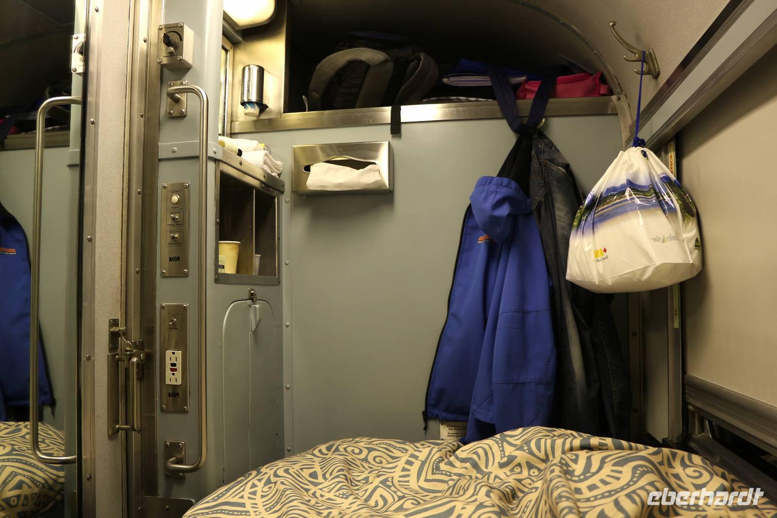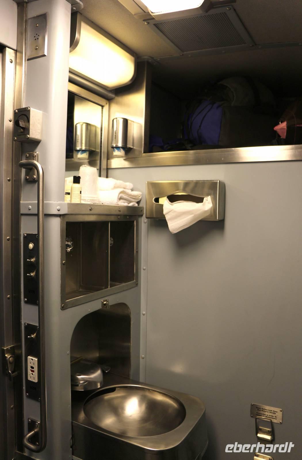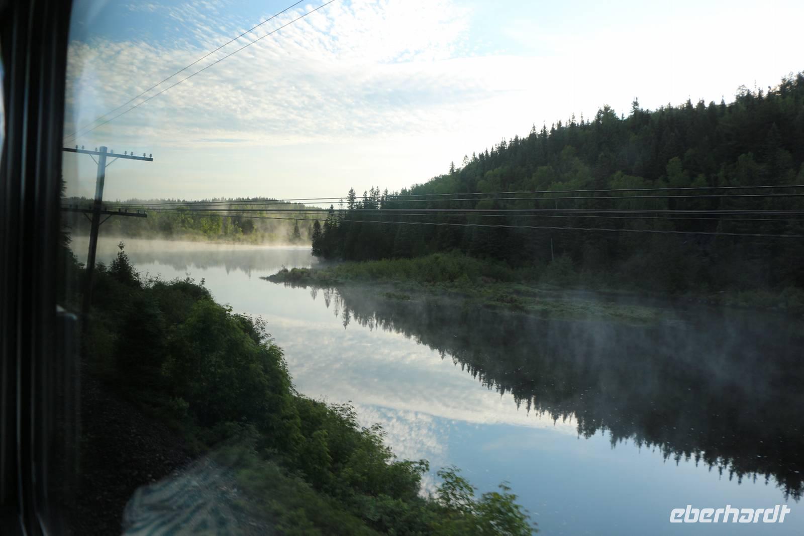 Nachdem wir die Gepäckabgabe und den Check In für unsere Zugreise im Bahnhof von Toronto erfolgreich gemeistert hatten, entspannten wir uns noch bei einem Kaffee in der Panorama-Lounge. Man darf nur zwei bis drei kleine Handgepäckstücke pro Person von max. 11,5 kg mit ins Abteil nehmen, die großen Koffer (max. zwei mit je 23 kg pro Person) müssen für den Gepäckwagen aufgegeben werden. Dann konnten wir unsere Schlafabteile im Canadian beziehen und pünktlich um 22 Uhr fuhren wir in Toronto ab. Die Schlafabteile sind schon ziemlich eng, aber auch irgendwie gemütlich. Ich bezeichne mein Einbett-Abteil immer als "mein kleines Schlafnest". In jedem Abteil gibt es ein Waschbecken und eine Toilette, etwas Stauraum für das Gepäck, ein großes Fenster und zwei bequeme Betten übereinander. Am Tag kann man die Betten vom Kabinen-Stewart hochklappen lassen und es kommen zwei Sessel zum Vorschein. In den sogenannten Activity Cars (den Panoramawagen) trifft man sich zum gemütlichen Beisammensein oder zum Genießen der Aussicht aus den erhöhten Panoramafenstern. In den Speisewagen (Dining Cars) werden Frühstück, Mittagessen und Abendmenü serviert. Es gibt nichts Schöneres, als beim leckeren 3-Gang-Menü oder abends in seinem "Schlafnest" die vorbeiziehende Natur Kanadas zu beobachten! Es ist schon etwas Besonderes, Kanada per Zug zu "erfahren"!