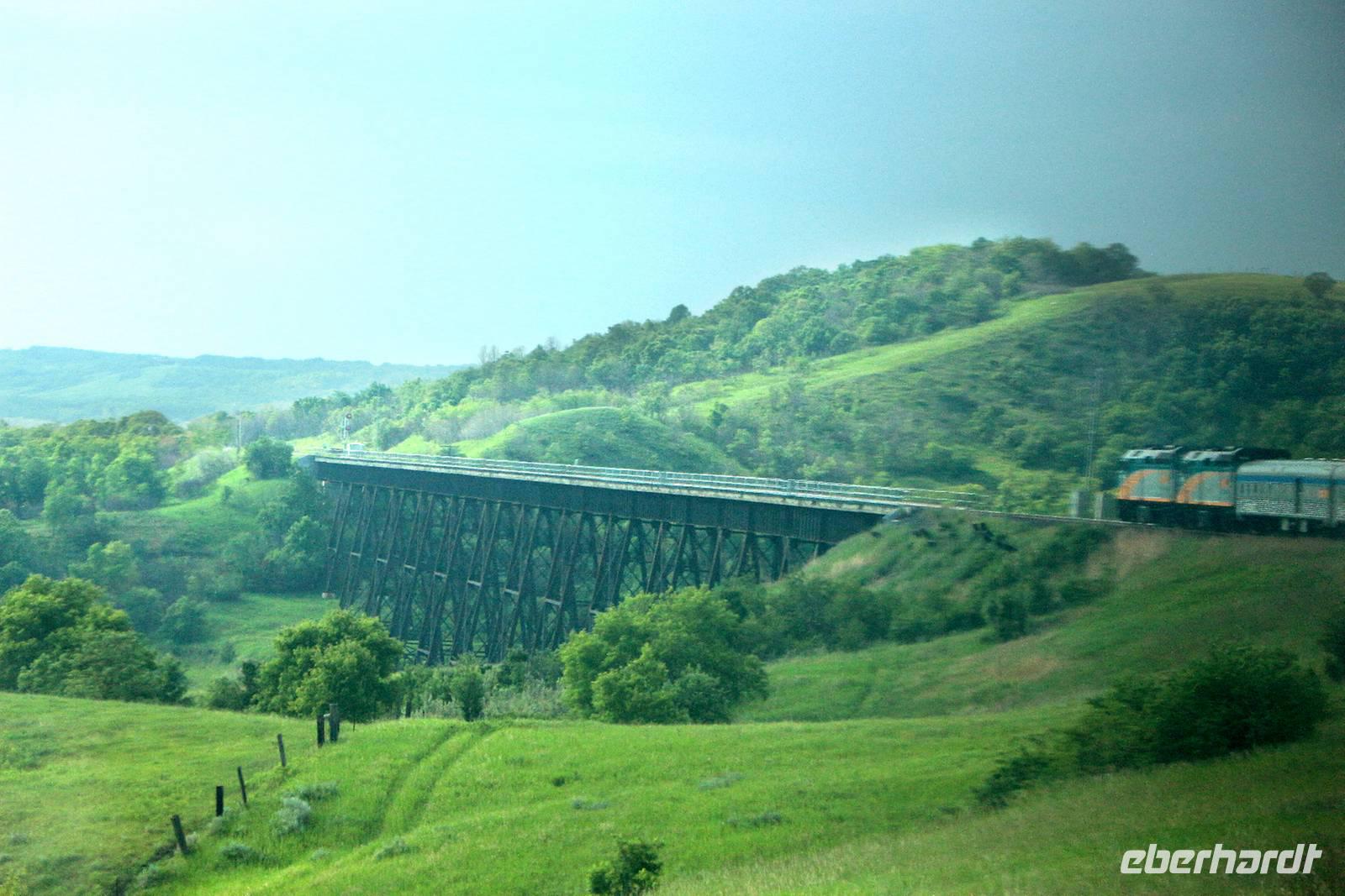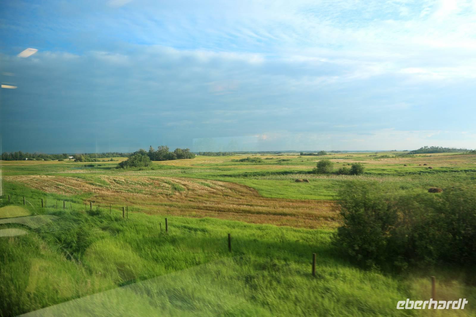 Den ersten Tag verbringen wir komplett im Zug und durchfahren Nord-Ontario mit einem Zwischenstopp in Hornepayne. Weiter geht es in die Provinz Manitoba, in die weiten Prärien Kanadas. Am Morgen des zweiten Tages unserer Zugreise erreichen wir Winnipeg, die Hauptstadt Manitobas. Der "Canadian" hält hier für insgesamt drei Stunden, sodass wir etwas Zeit haben, die Stadt zu erkunden. Gemeinsam unternehmen wir einen Spaziergang entlang des Assiniboine-Flusses bis zum schönen Parlamentsgebäude von Winnipeg (Legislative Building). Im ehemaligen Eisenbahngelände und historischen Handelsplatz der Indianer und Pelzhändler "The Forks" gibt es heute eine Markthalle mit Cafés und Souvenirgeschäften und einen kleinen Aussichtsturm mit Blick über die Flussgabel zwischen Assiniboine und Red River. Zum Mittagessen sind wir schon wieder an Bord des "Canadian" und die Zugreise geht weiter gen Westen durch die weiten Prärien Manitobas und Saskatchewans.