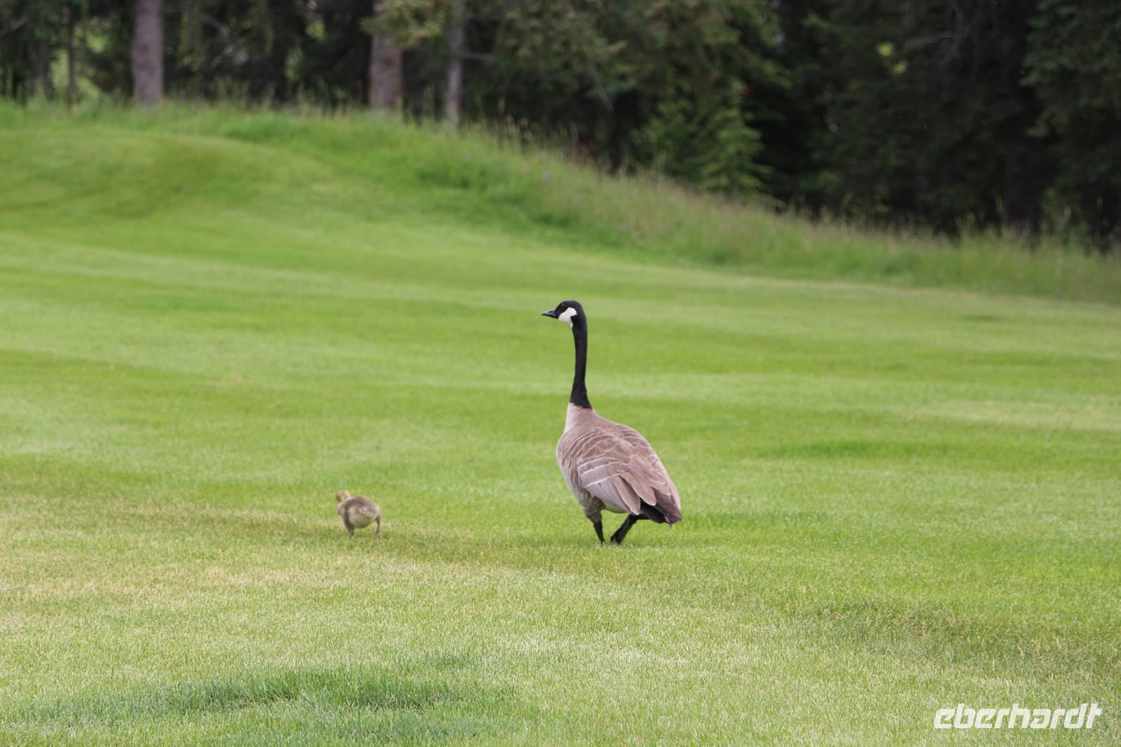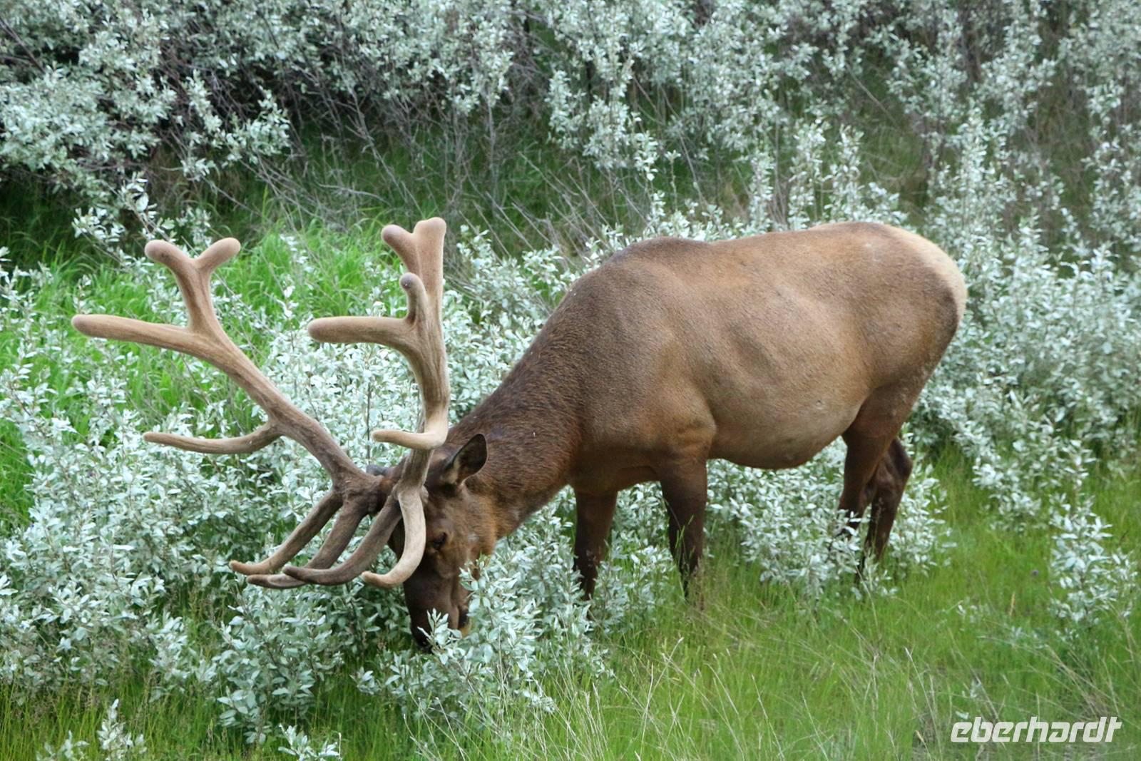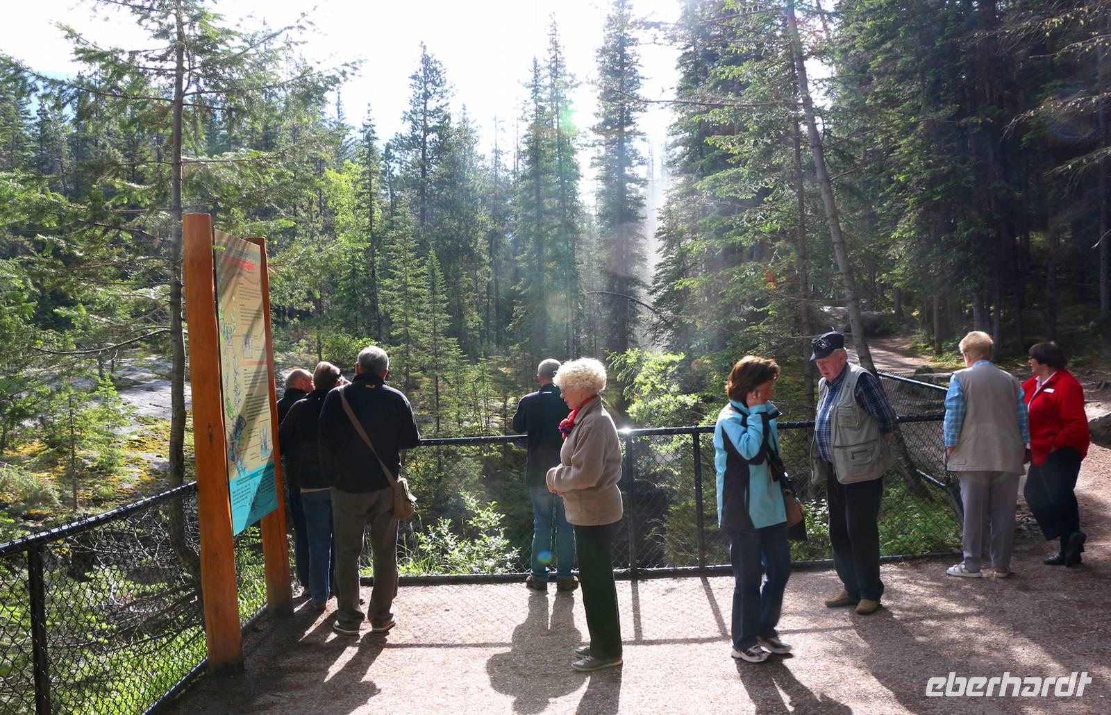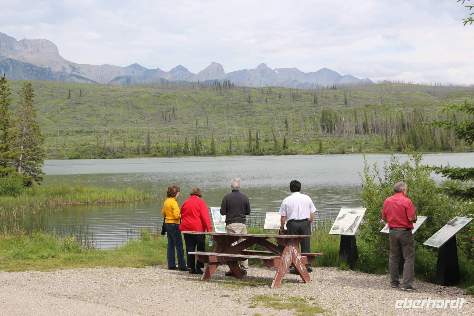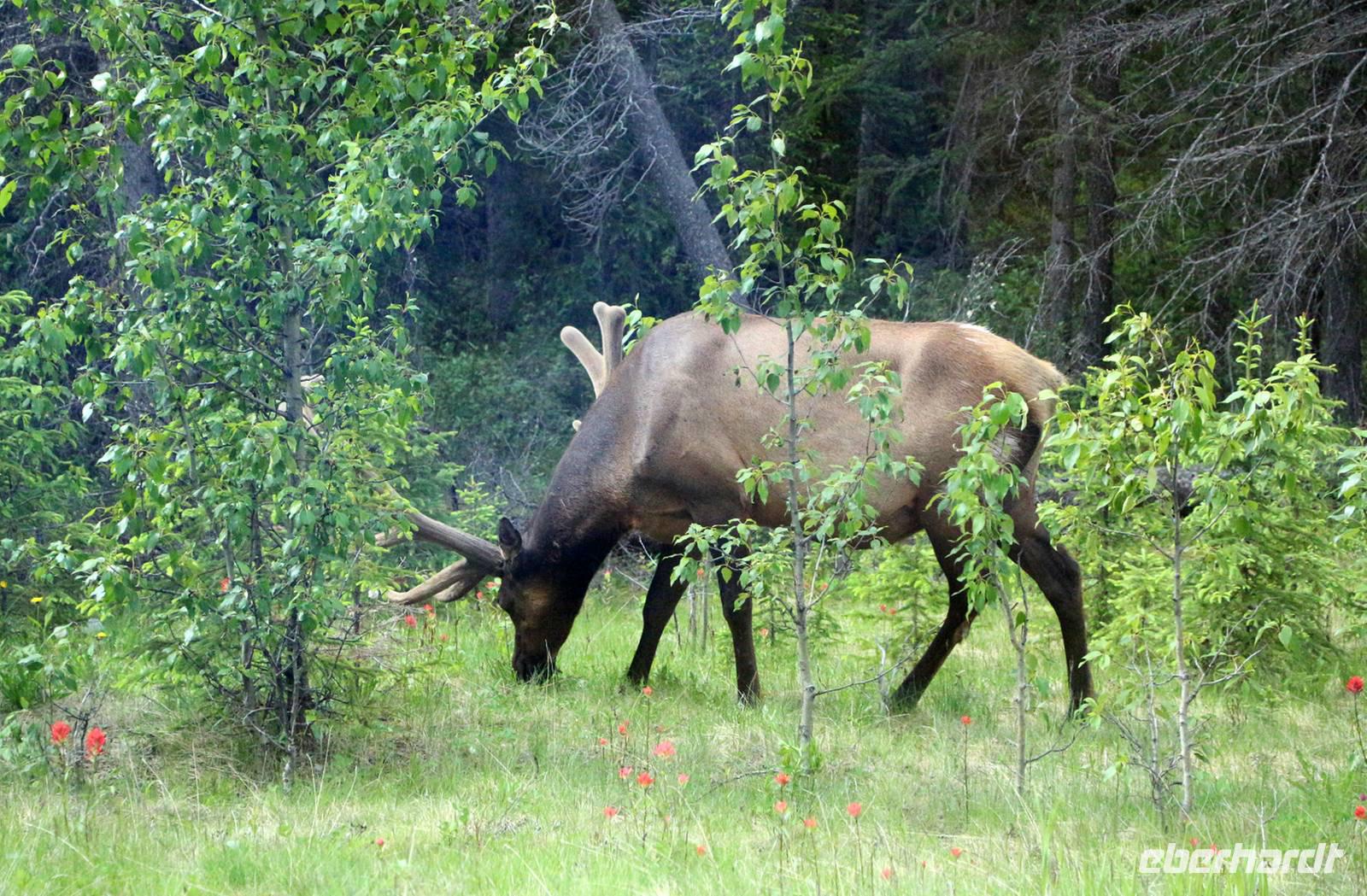Unsere Mittagspause legten wir am Fuße des Mount Robson ein, den mit 3.954 Metern höchsten Berg der Kanadischen Rocky Mountains. Auch hier hatten wir Glück, denn der Gipfel ist nur an wenigen Tagen des Jahres so gut zu sehen. Bevor wir zurück fuhren, besuchten wir die Rearguard Falls. Bis an diese Wasserfälle kommen die Lachse im Spätsommer den Fraser-Fluss hinauf. Bei einem letzten Abstecher zum Talbot Lake in der Nähe von Jasper sahen wir noch einmal Wapiti-Hirsche und Dickhornschafe. Ein erlebnisreicher und wunderbarer Tag ging gemütlich beim gemeinsamen Abendessen zu Ende.