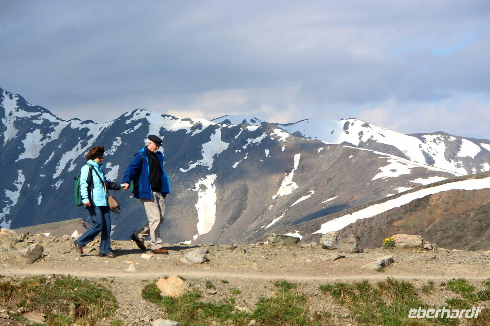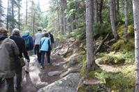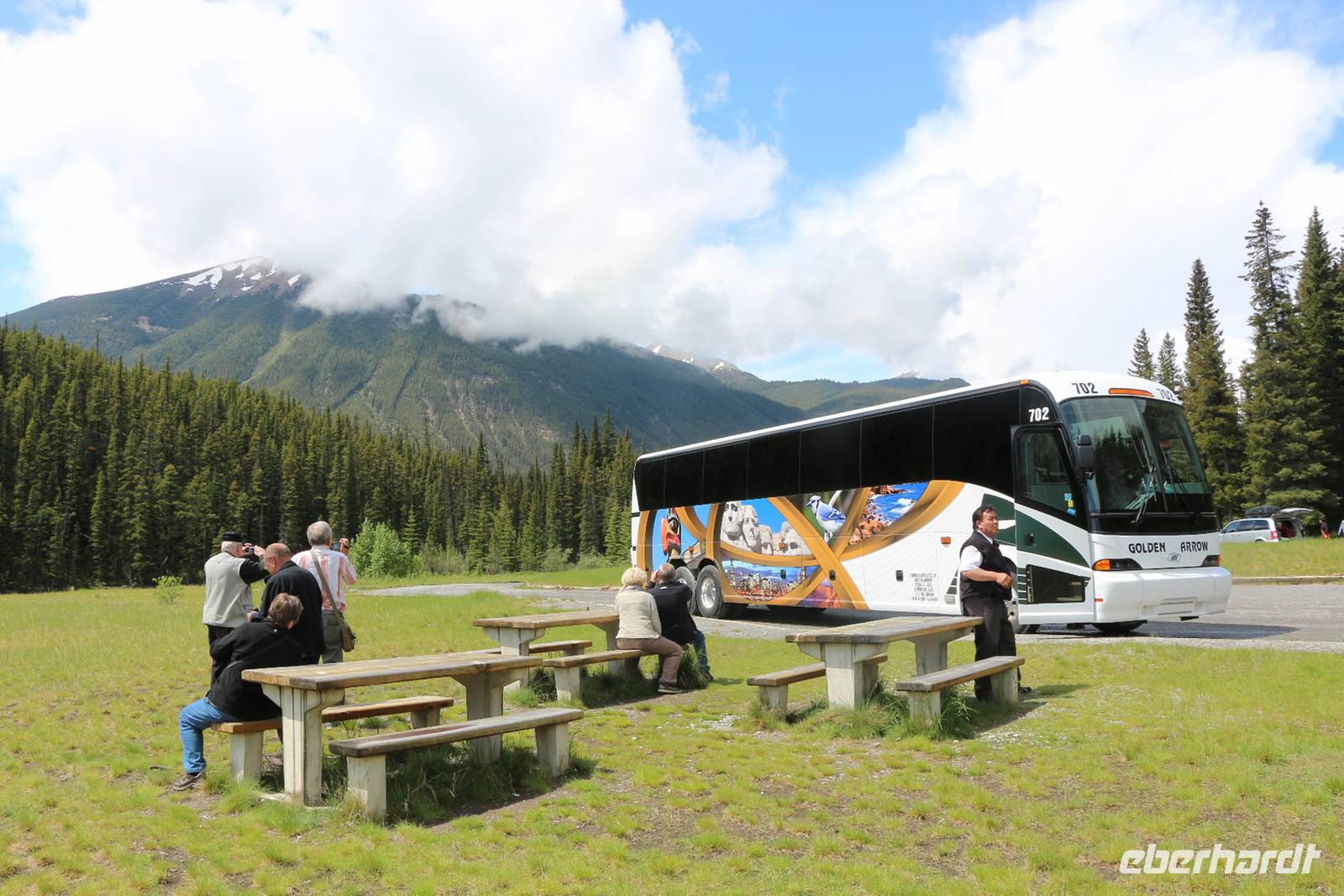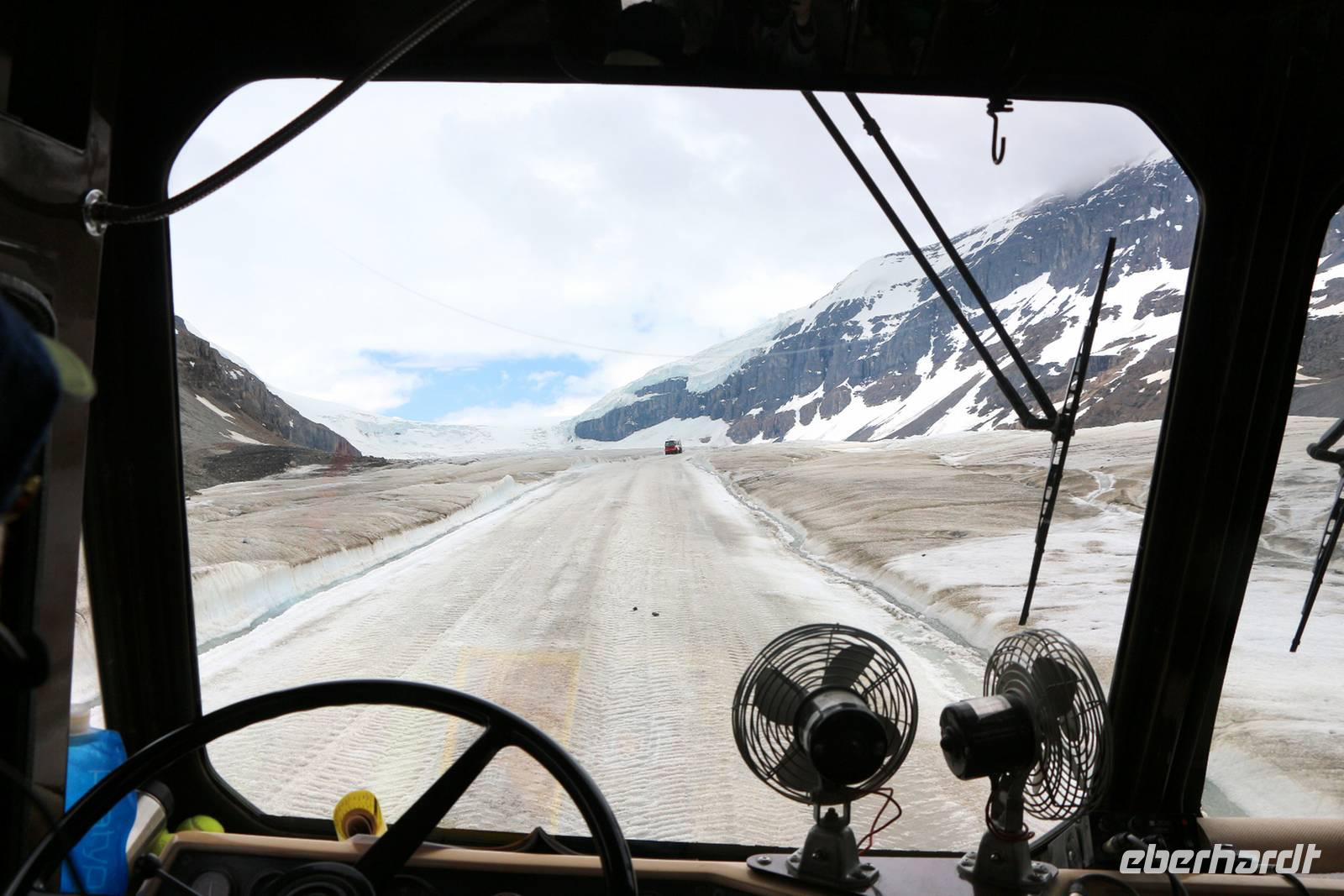 Unser Ganztagesausflug führte uns entlang der Panoramastraße Icefield Parkway in Richtung Banff-Nationalpark. Am Sunwapta Falls Resort kauften wir Sandwiches für ein Mittagspicknick und hübsche Souvenirs ein. Vorbei am Stutfield-Gletscher und am Tangle Fall Wasserfall erreichten wir das Columbia Eisfeld, eines der größten Inland-Eisfelder weltweit südlich des Polarkreises. Fast alle nutzten die fakultative Möglichkeit zur Auffahrt auf den Athabasca-Gletscher. Dabei fuhren wir zunächst mit einem Shuttle-Bus bis zum Gletscherrand und dann mit dem allradbetriebenen Snowcoach direkt über das Jahrtausende alte Gletschereis. Auf dem Gletscher konnten wir etwa 20 Minuten aussteigen, um Fotos aufzunehmen. Warme Kleidung und feste Schuhe sind zu empfehlen.