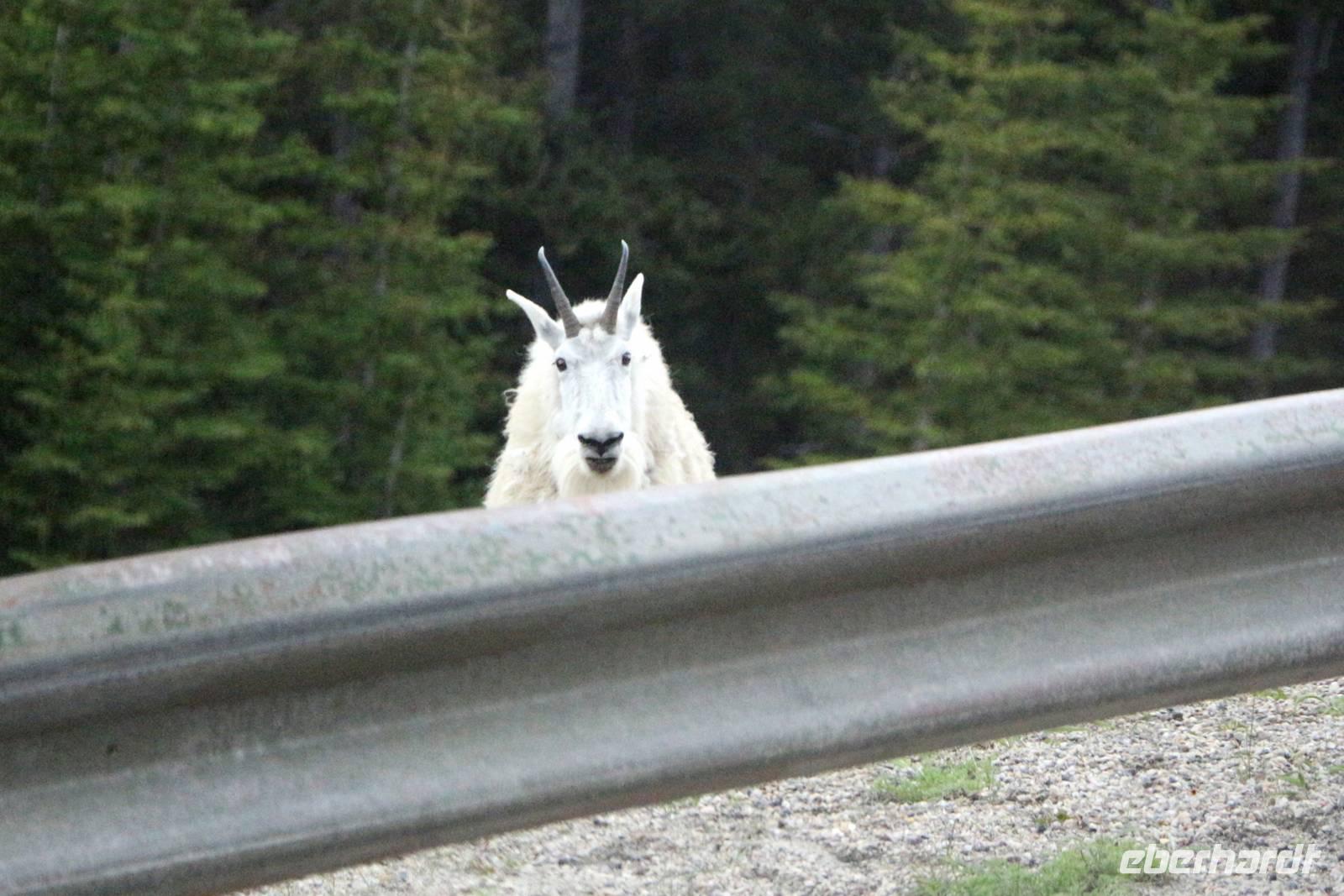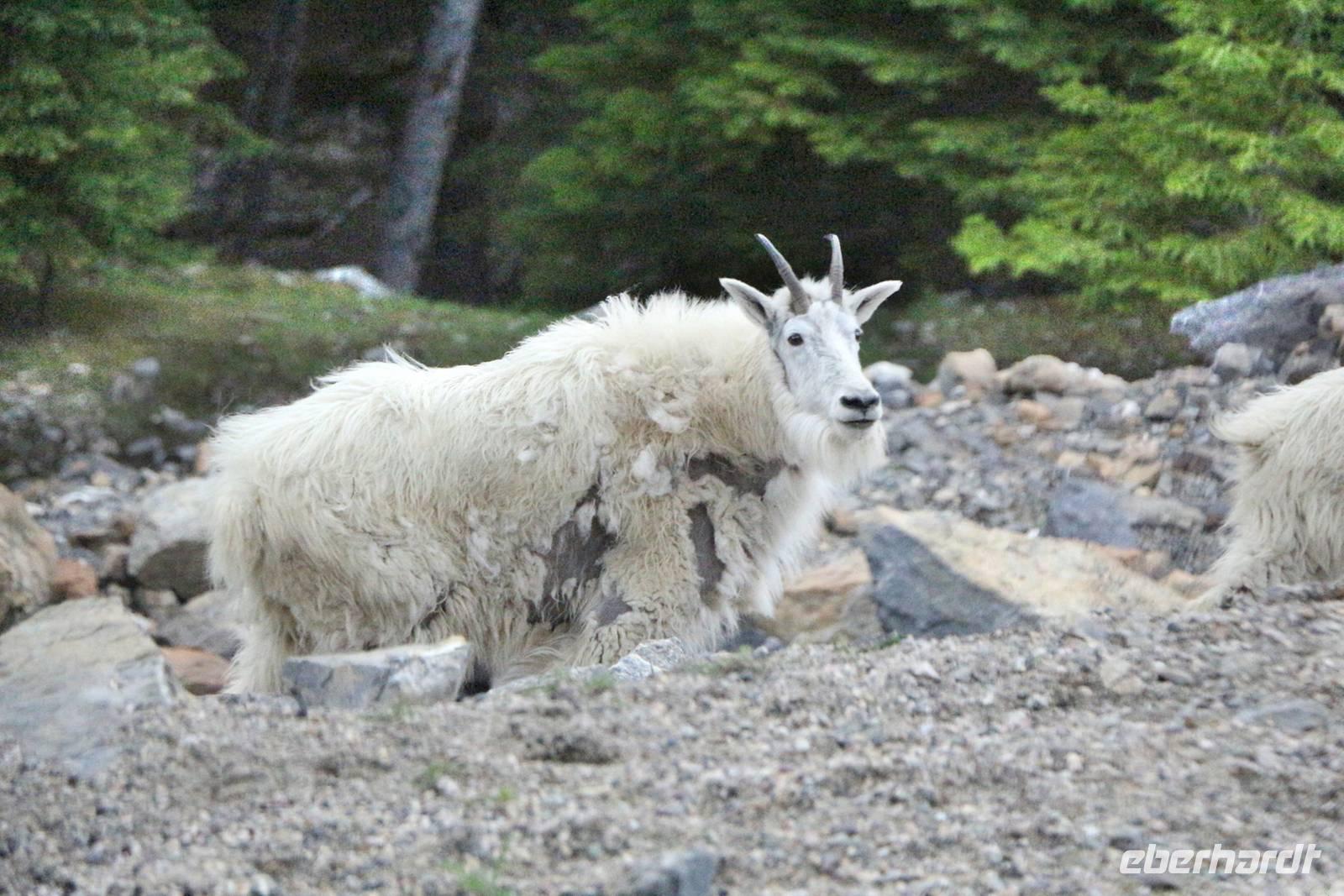 Nach unserem Gletscher-Abenteuer ging es weiter auf dem Icefield Parkway in den Banff-Nationalpark. Wir passieren die „Weinende Wand" mit ihren vielen kleinen Wasserfällen und legten eine Picknick-Pause am Athabasca-Fluss ein. Zum Aufwärmen gab es einen kanadischen Whisky . Gut gestärkt besuchten wir den Bow Lake und den herrlich türkisblauen Peyto Lake im Banff-Nationalpark. Auf der Rückfahrt hatten wir Glück und sahen einige wilde Schneeziegen ganz nah am Straßenrand.