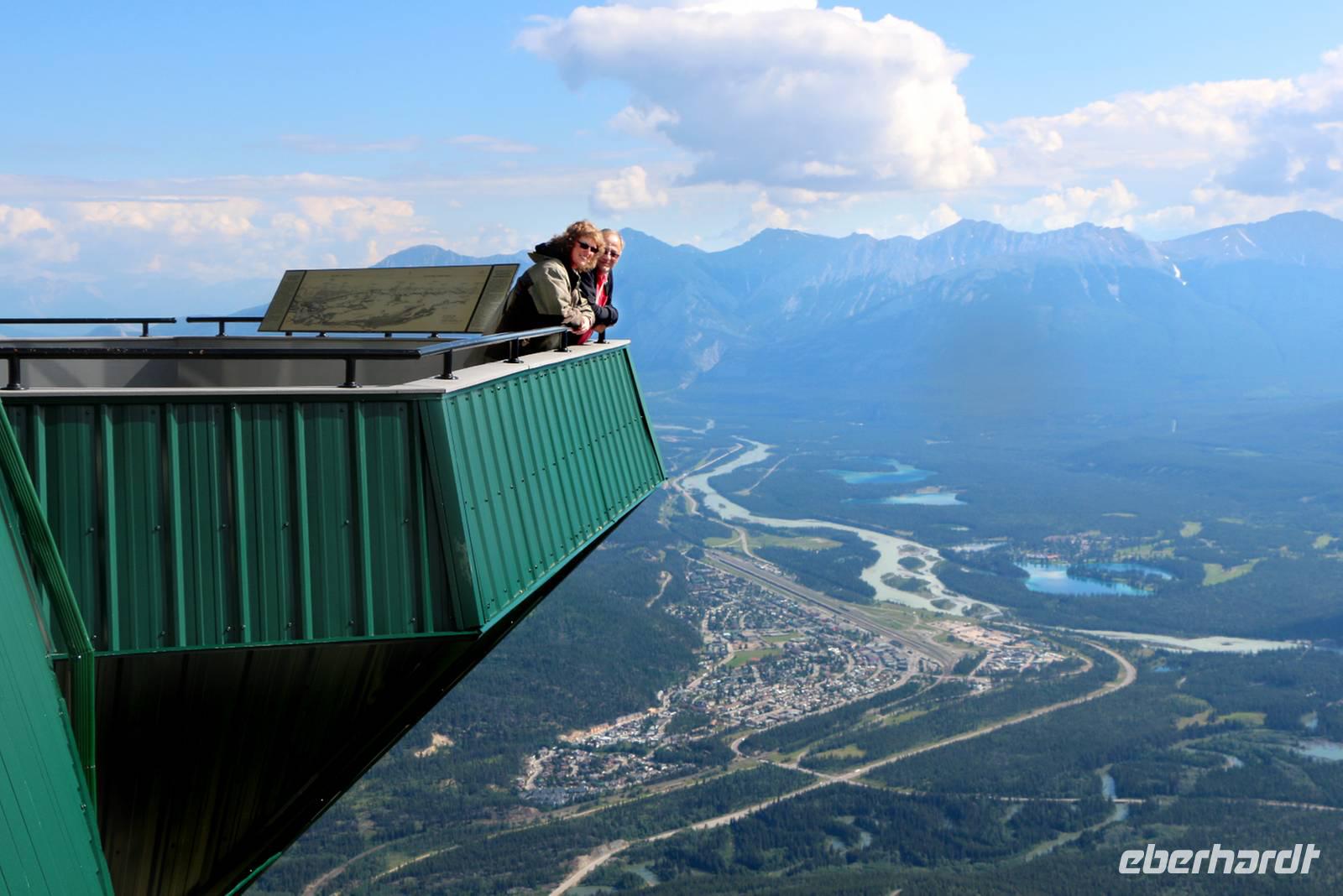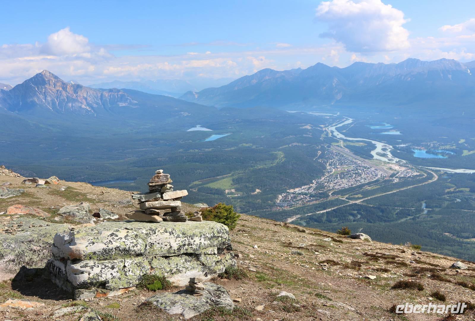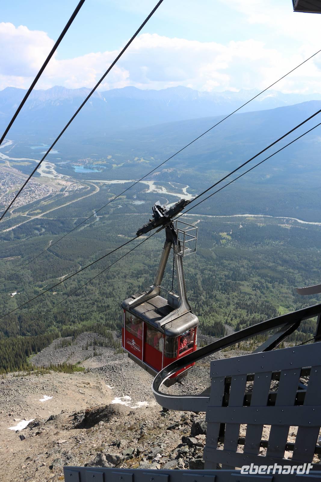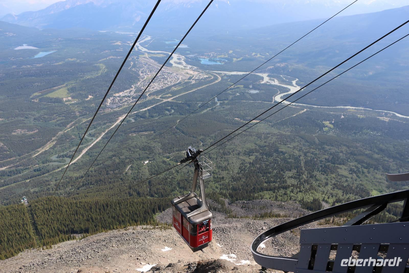 Um einen Eindruck von oben zu bekommen, fuhren wir am Vormittag mit der Jasper Tramway Seilbahn hinauf auf 2.277 Meter Höhe des Whistlers Mountain, dem Hausberg von Jasper. Bei tollem Wetter hatten wir beste Sicht auf Jasper, das Athabasca-Flusstal und die umliegenden Bergketten. Oben an der Bergstation konnten wir ein Stück bergauf wandern und einige Erdhörnchen beobachten. Wenn man Glück hat, kann man hier oben auch Schneehühner und Murmeltiere sehen, nach dessen Pfeifen der Berg seinen Namen "Whistlers" erhielt.