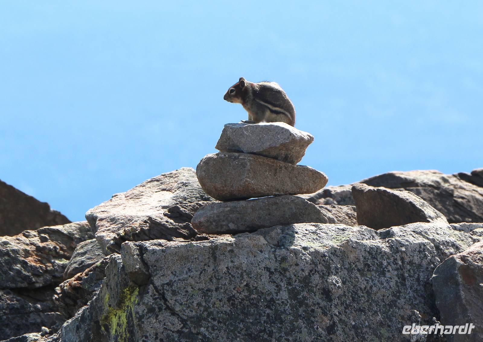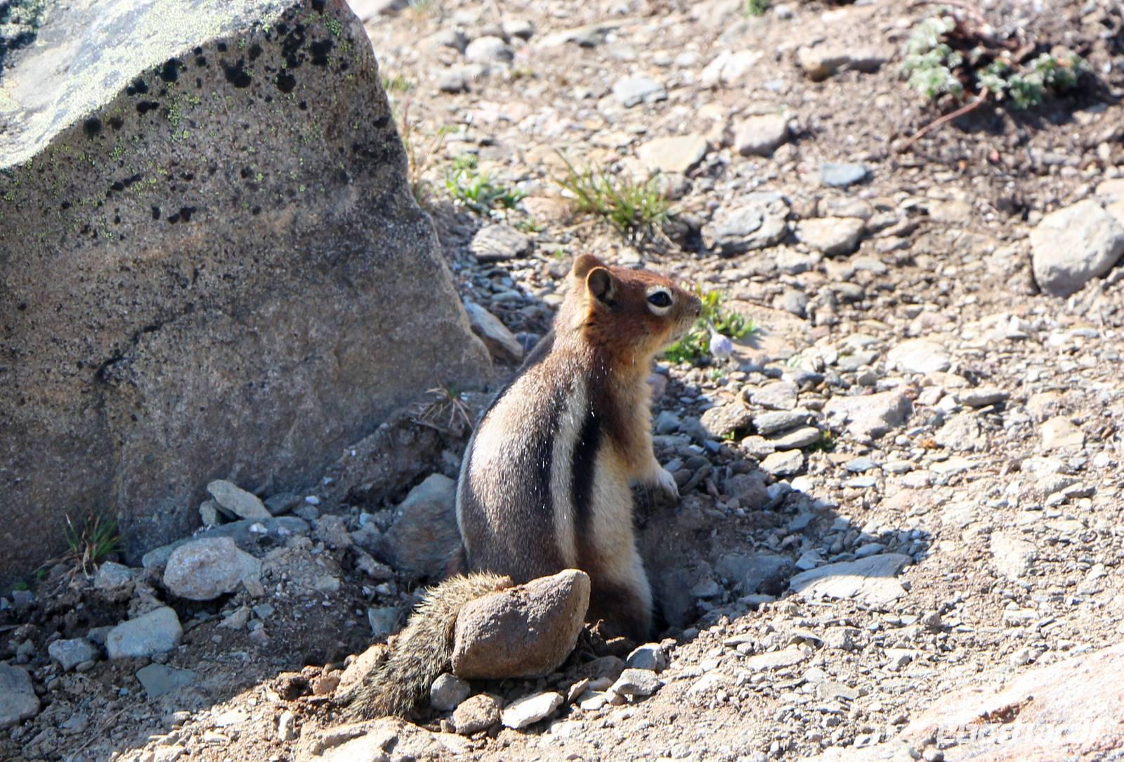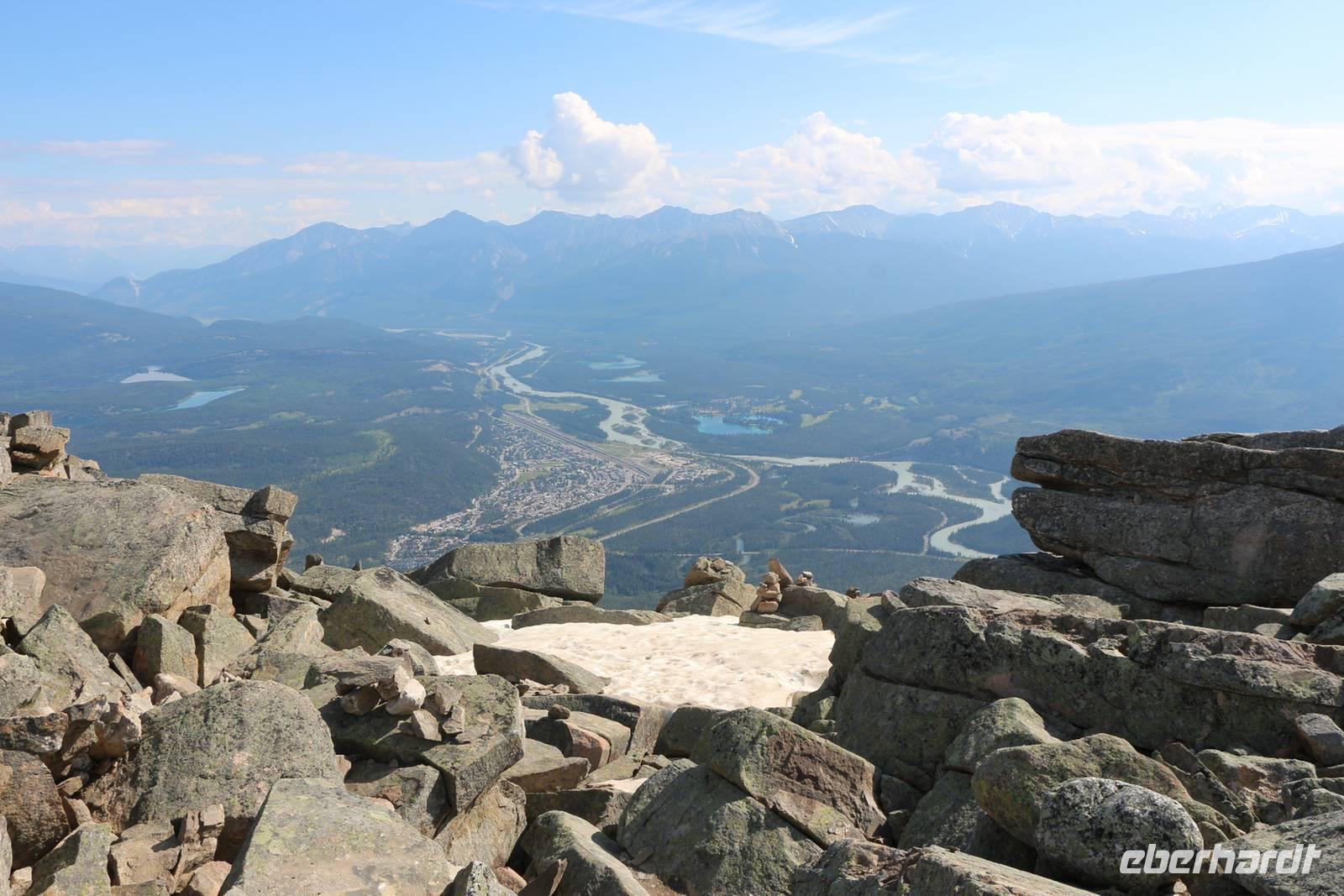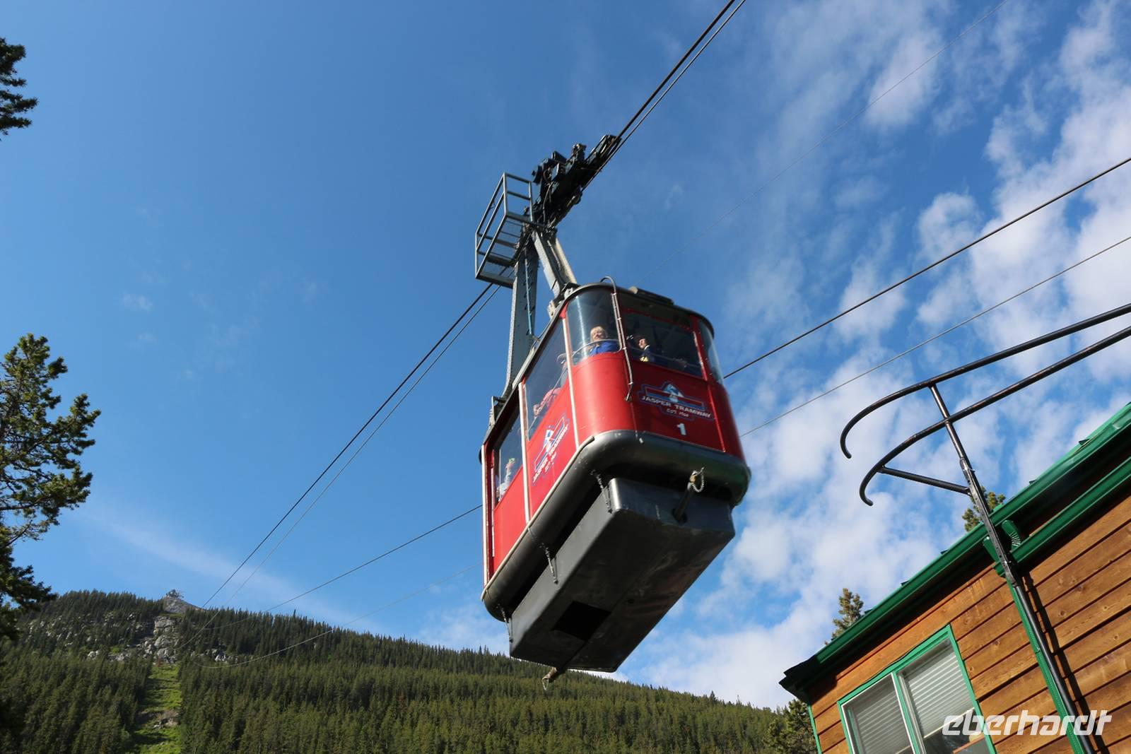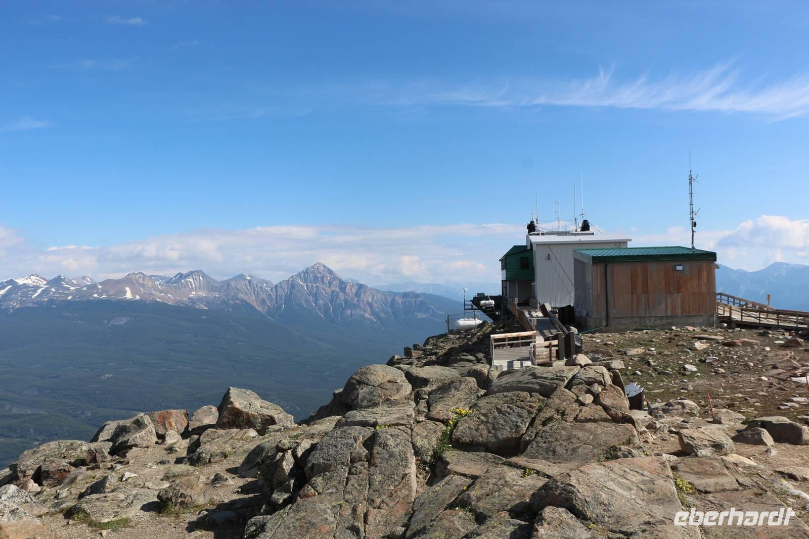 Um einen Eindruck von oben zu bekommen, fuhren wir am Vormittag mit der Jasper Tramway Seilbahn hinauf auf 2.277 Meter Höhe des Whistlers Mountain, dem Hausberg von Jasper. Bei tollem Wetter hatten wir beste Sicht auf Jasper, das Athabasca-Flusstal und die umliegenden Bergketten. Oben an der Bergstation konnten wir ein Stück bergauf wandern und einige Erdhörnchen beobachten. Wenn man Glück hat, kann man hier oben auch Schneehühner und Murmeltiere sehen, nach dessen Pfeifen der Berg seinen Namen "Whistlers" erhielt.