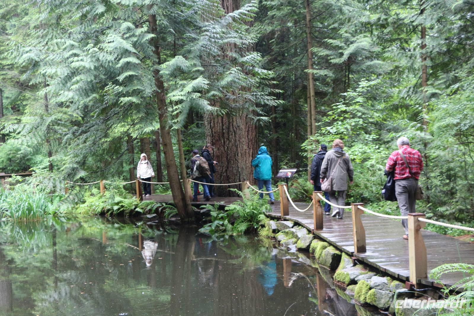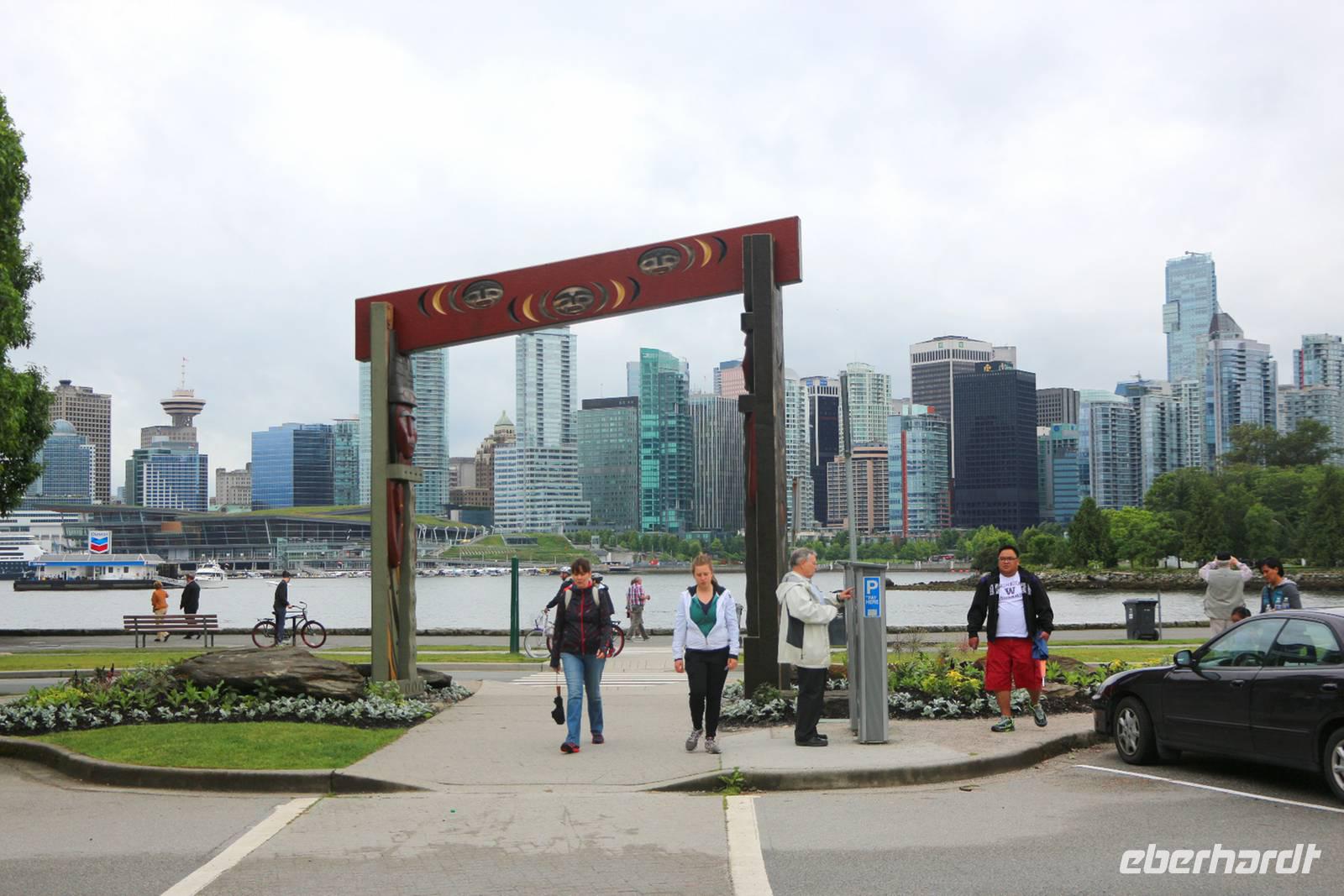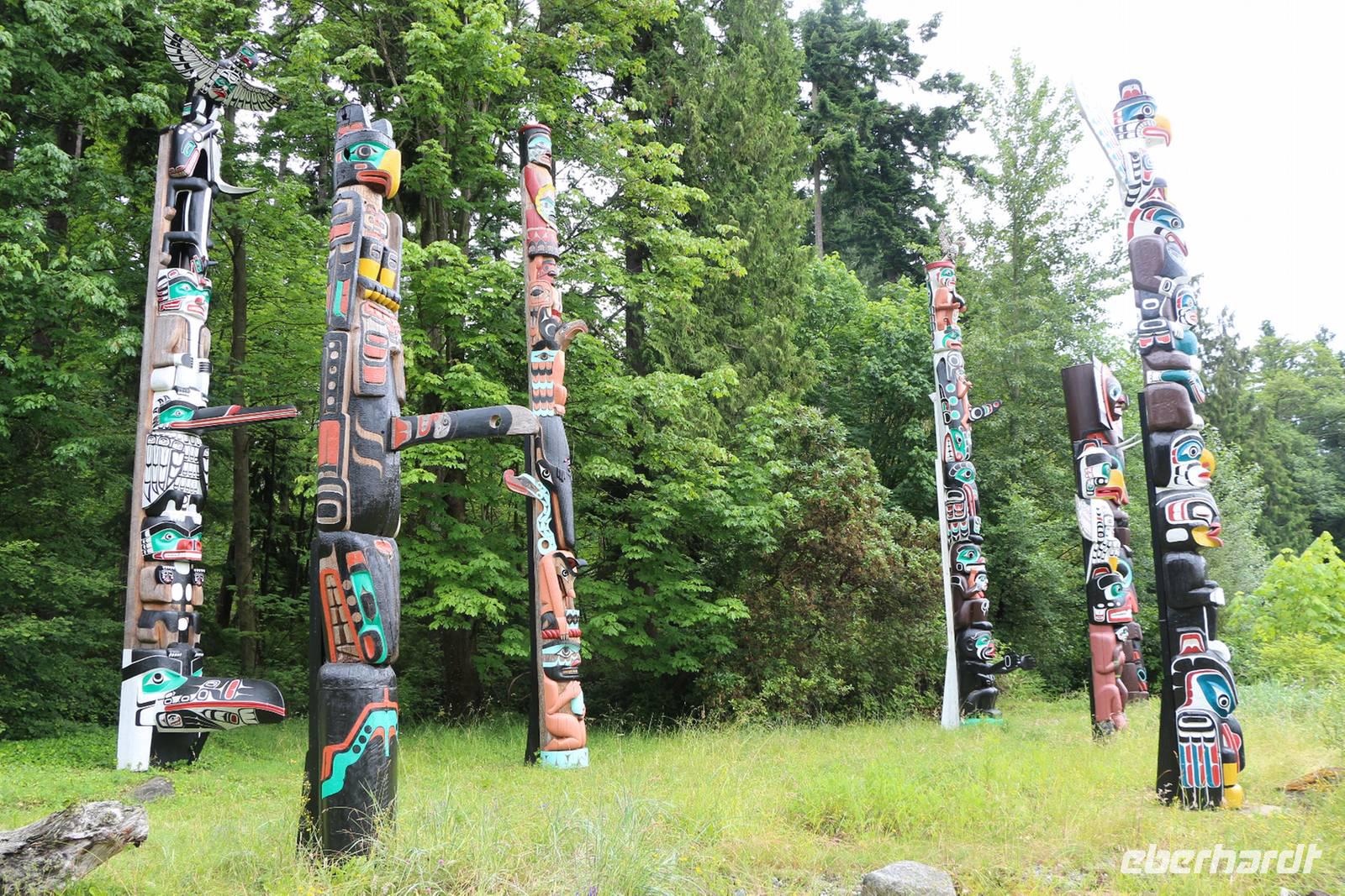 Dann ging es in die "grüne Lunge" Vancouvers, den Stanley Park. Bei einem Fotostopp sahen wir die Totempfahl-Sammlung der Westküsten-Indianer British Columbias und die Lion's Gate Brücke. Bei einer kurzen Wanderung durch den pazifischen Regenwald des Stanley Parks bekamen wir einen Eindruck von den Baumriesen, die einst zu Hunderten auf den unbewohnten Inseln Vancouvers beheimatet waren.