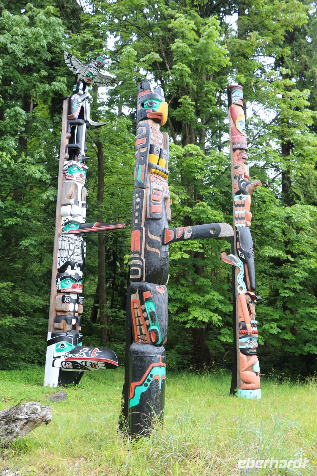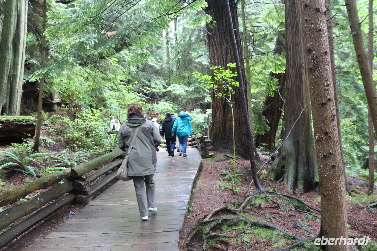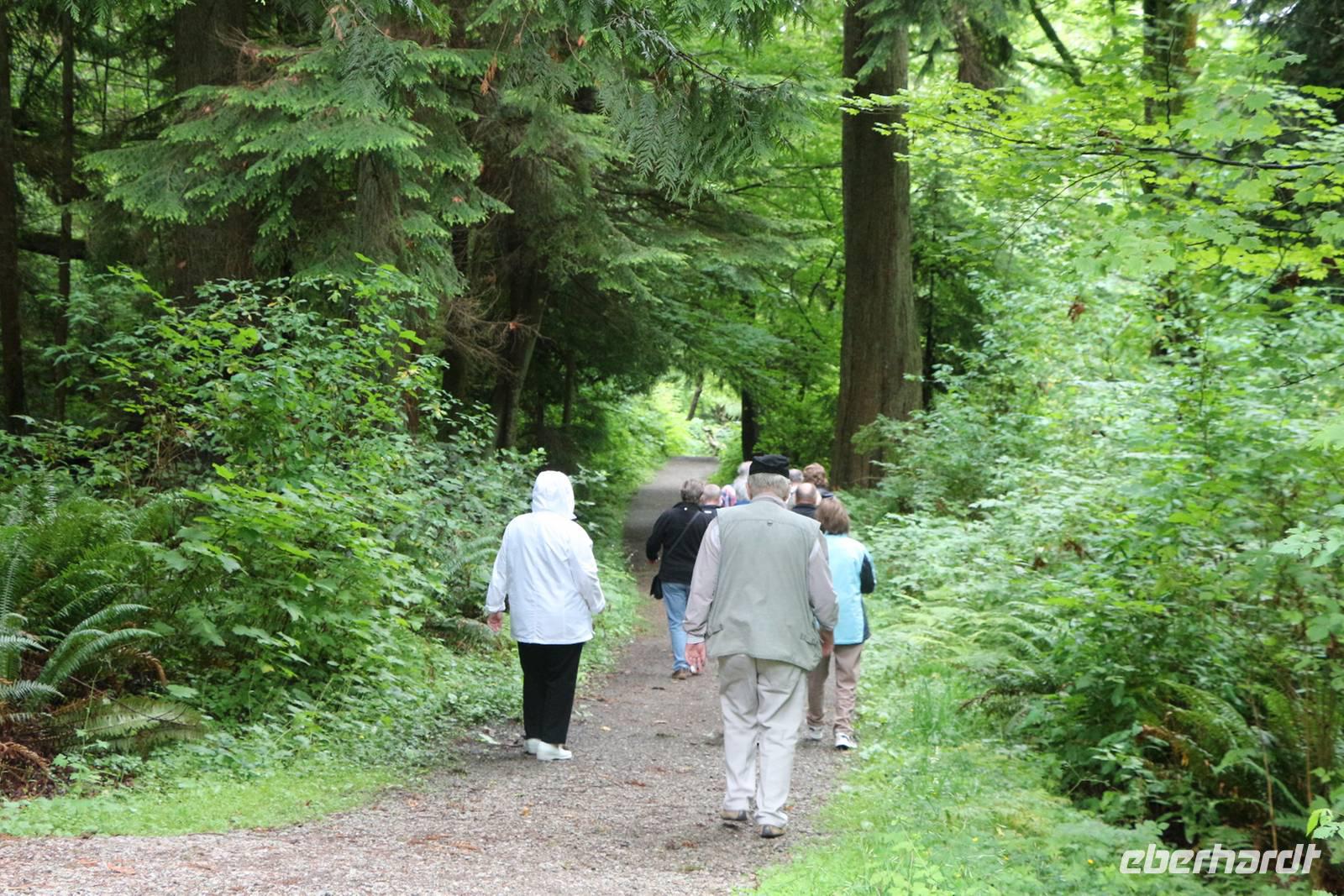 Dann ging es in die "grüne Lunge" Vancouvers, den Stanley Park. Bei einem Fotostopp sahen wir die Totempfahl-Sammlung der Westküsten-Indianer British Columbias und die Lion's Gate Brücke. Bei einer kurzen Wanderung durch den pazifischen Regenwald des Stanley Parks bekamen wir einen Eindruck von den Baumriesen, die einst zu Hunderten auf den unbewohnten Inseln Vancouvers beheimatet waren.