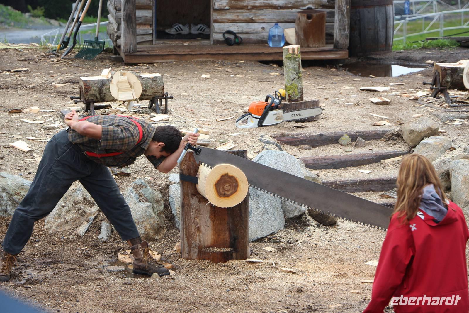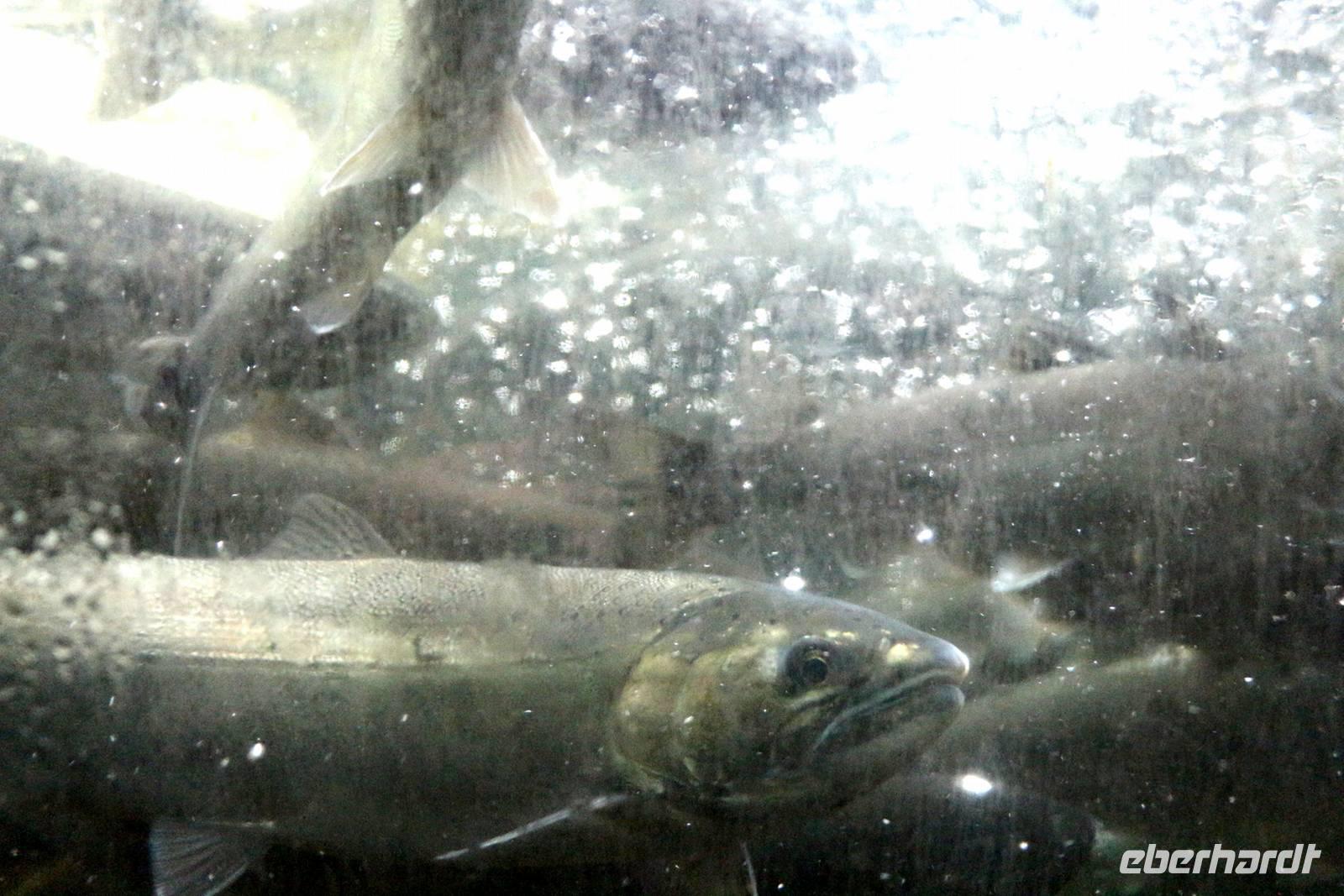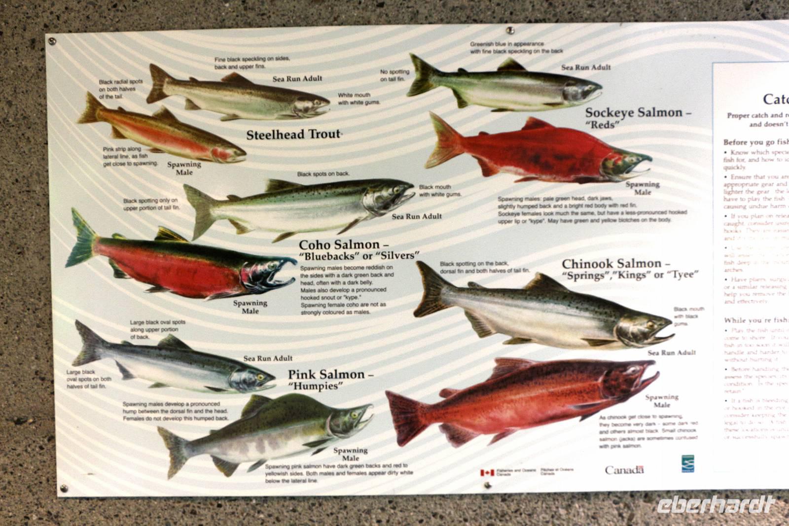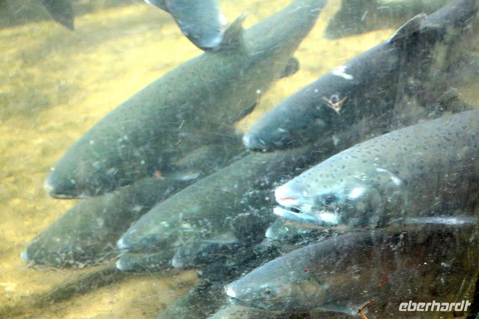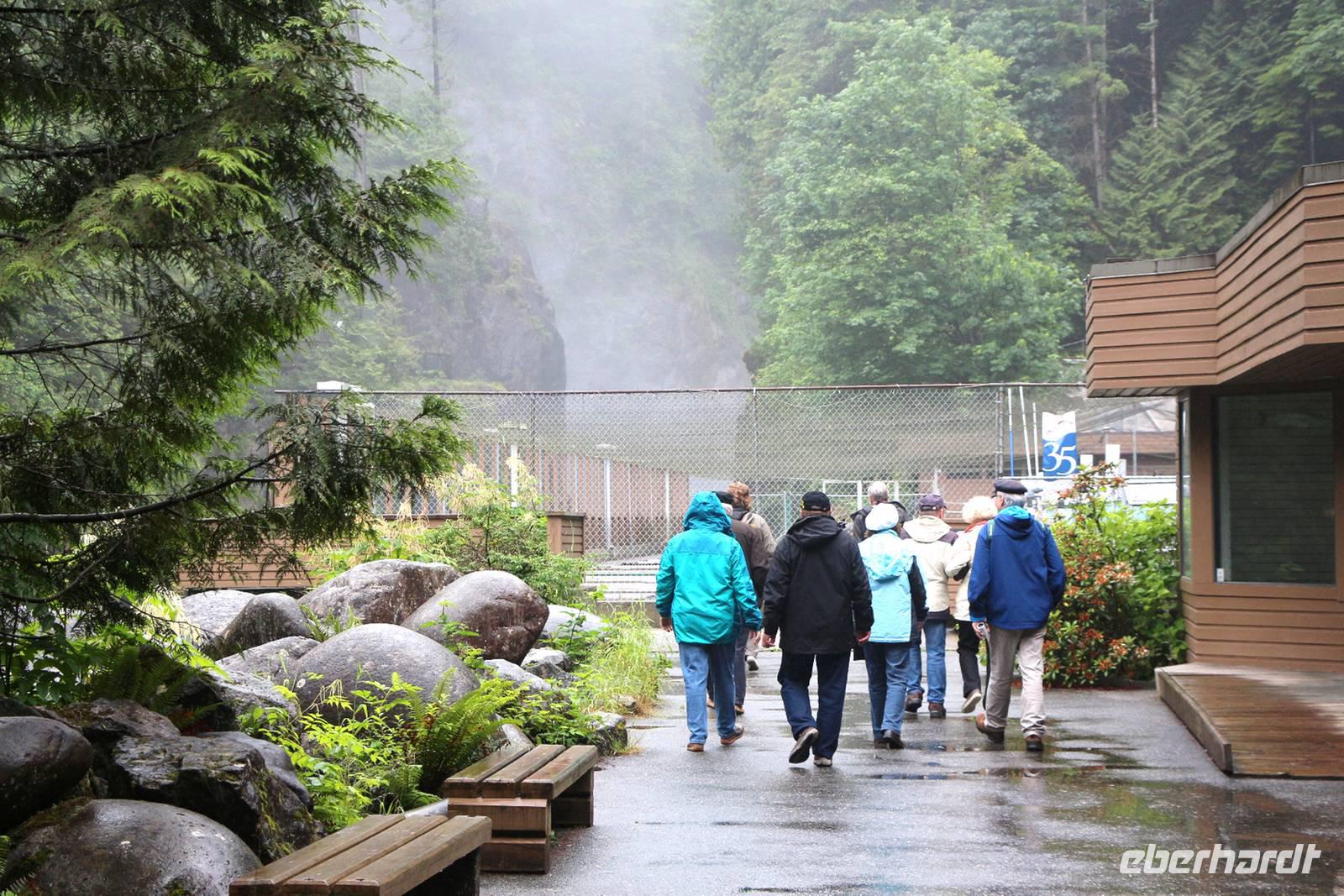 Dann ging es weiter zum Hausberg Vancouvers - dem Grouse Mountain. Mit der Gondelbahn fuhren wir hinauf auf etwa 1.100 Meter Höhe und unternahmen einen Spaziergang zu den verschiedenen Attraktionen: Holzfäller-Show, überlebensgroße Holzschnitzereien und ein Bärengehege mit zwei Grizzly-Bären. Wieder zurück im Tal besuchten wir den Cleveland-Staudamm und eine Lachszuchtstation am Capilano-Fluss, wo wir Lachse bei Sprung über die Lachstreppe beobachten konnten.