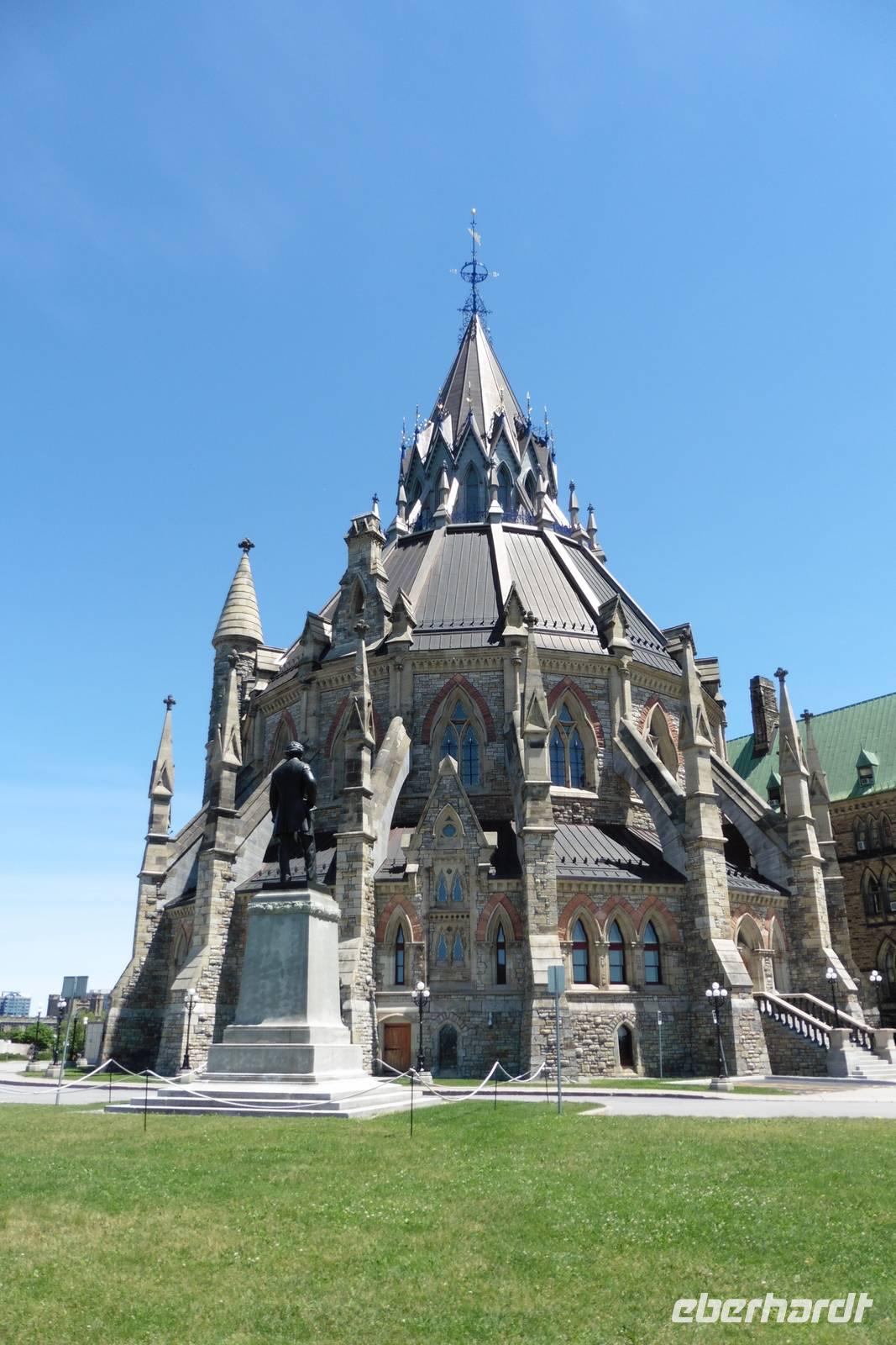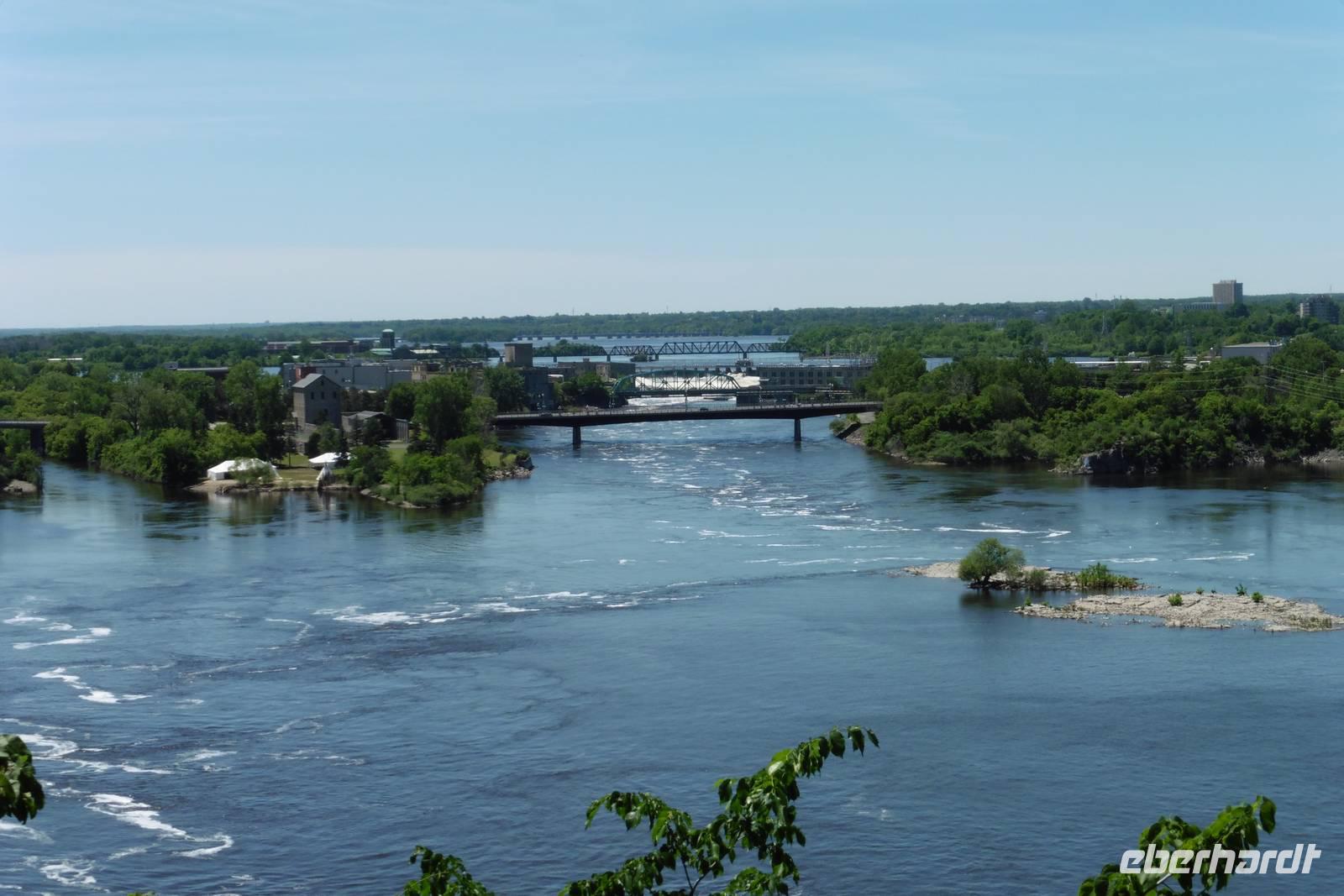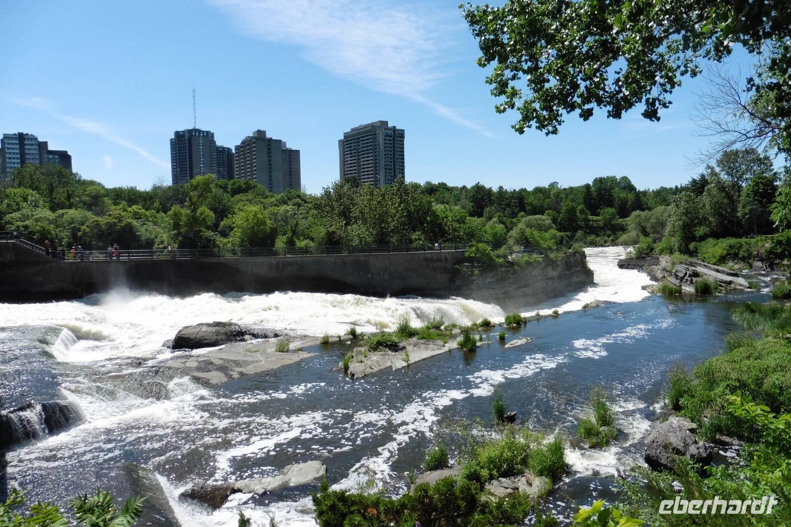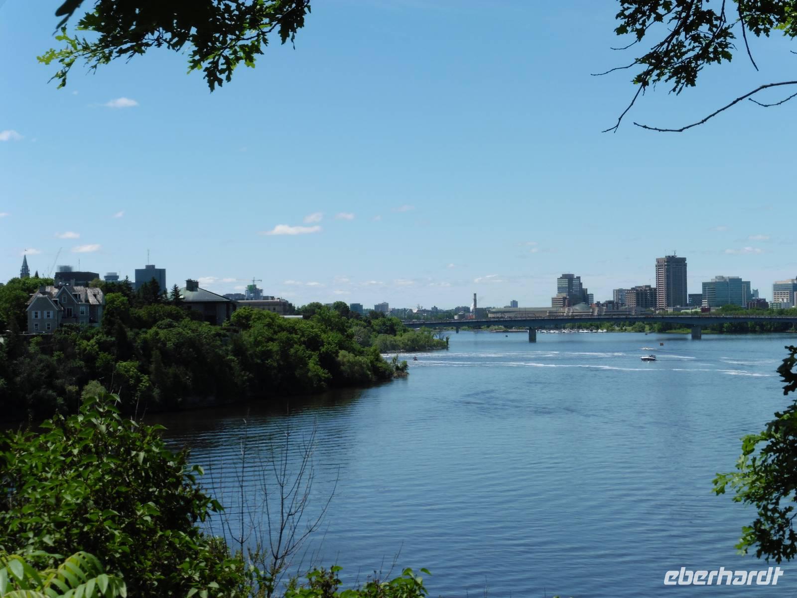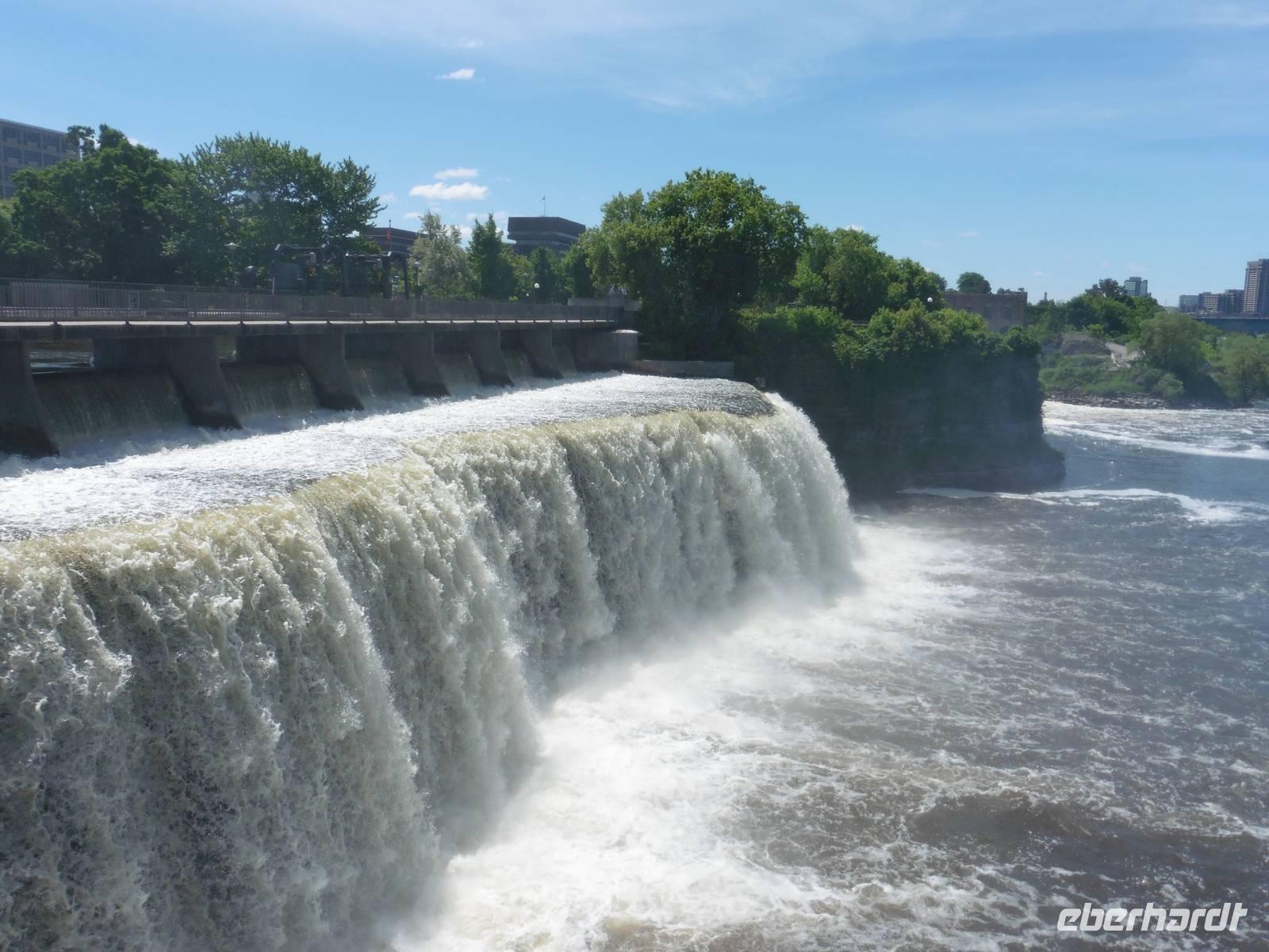 Bei Sonnenschein bringt uns Celine zum Bahnhof. Wir sind ganz gespannt auf unsere erste Strecke mit der kanadischen Eisenbahn. Mit dem Zug Corridor verlassen wir die Provinz Quebec und fahren in die Provinz Ontario in die Hauptstadt Ottawa. Leider ist unsere Reiseleiterin Stephie krank, sodass wir mit Marshal Ottawa kennenlernen. Nach einer kurzen Busfahrt haben wir einen tollen Blick über die grüne Stadt Ottawa mit dem Ottawa River und dem Gatineau River. Zum Mittag halten wir am bekannten Byward Market an. Hier gibt es eine Riesenauswahl an Restaurants und Verkaufsständen. Wir entscheiden uns alle für den Biberschwanz, einen süßen Snack mit Zimt und Zucker - lecker. Frisch gestärkt fahren wir zum schönen Parlamentsgebäude, dem Sitz des Premierministers. Bei strahlendem Sonnenschein spazieren wir um das Gebäude, sehen die Szene der Teaparty und die Bibliothek. Vom Museum of Civilization haben wir noch einmal einen tollen Blick auf das Parlament. Weiter geht es entlang des Rideau Kanals, vorbei an schönen Villen zum Wasserfall.