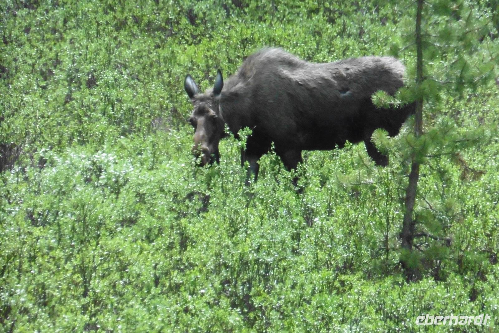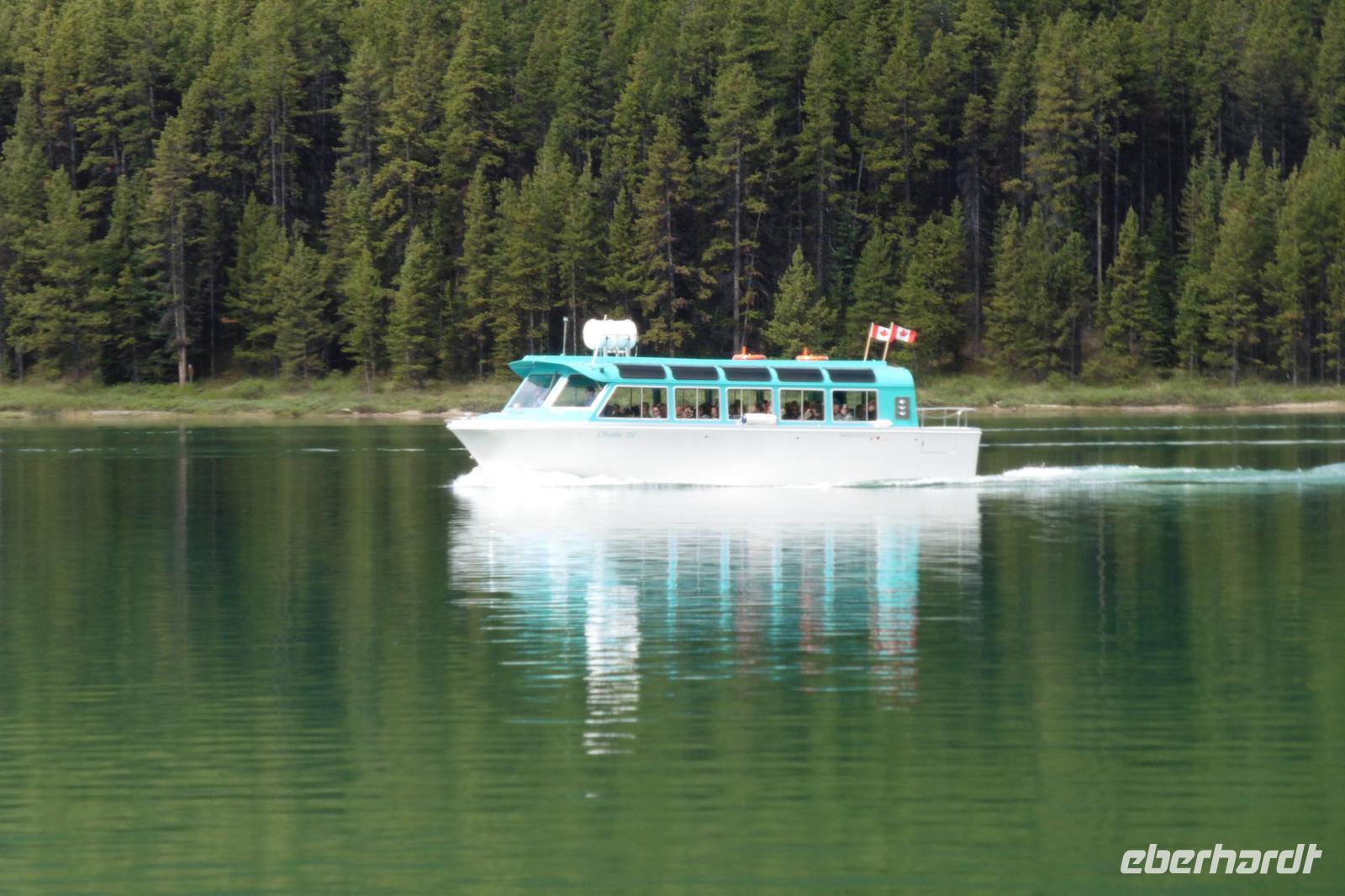 Auf dem Weg zum Maligne Lake halten wir am Medicine Lake auf dem sich die umliegende Bergwelt spiegelt. Für 12.00 Uhr ist unsere Bootsfahrt auf dem Maligne Lake bestellt, somit bleibt uns genügend Zeit, um uns die Beine auf dem Wanderweg entlang des Maligne Sees zu vertreten. Peter zeigt uns dabei unterschiedliche Pflanzen und Bäume. Begleitet werden wir auf unserer Wanderung von Mundharmonikaklängen. Sogar einen eigenen Musiker haben wir dabei. Während der Bootsfahrt dürfen wir auf der Insel Spirit Island aussteigen, schließlich ist es eines der Wahrzeichen der Rocky Mountains. Das WM Spiel Deutschland gegen Ghana verpassen wir heute leider, da wir in der Wildnis nicht einmal ein Handynetz haben. So mancher wird dadurch beim Mittagessen nervös. Wir haben einfach keine Chance die Ergebnisse zu erfahren und müssen warten. Auf dem Weg zum Maligne Canyon entdecken wir Ziegen und einen Elch. Entlang der Kalksteinschlucht unternehmen wir eine kleine Wanderung zu den Wasserfällen und Brücken.
