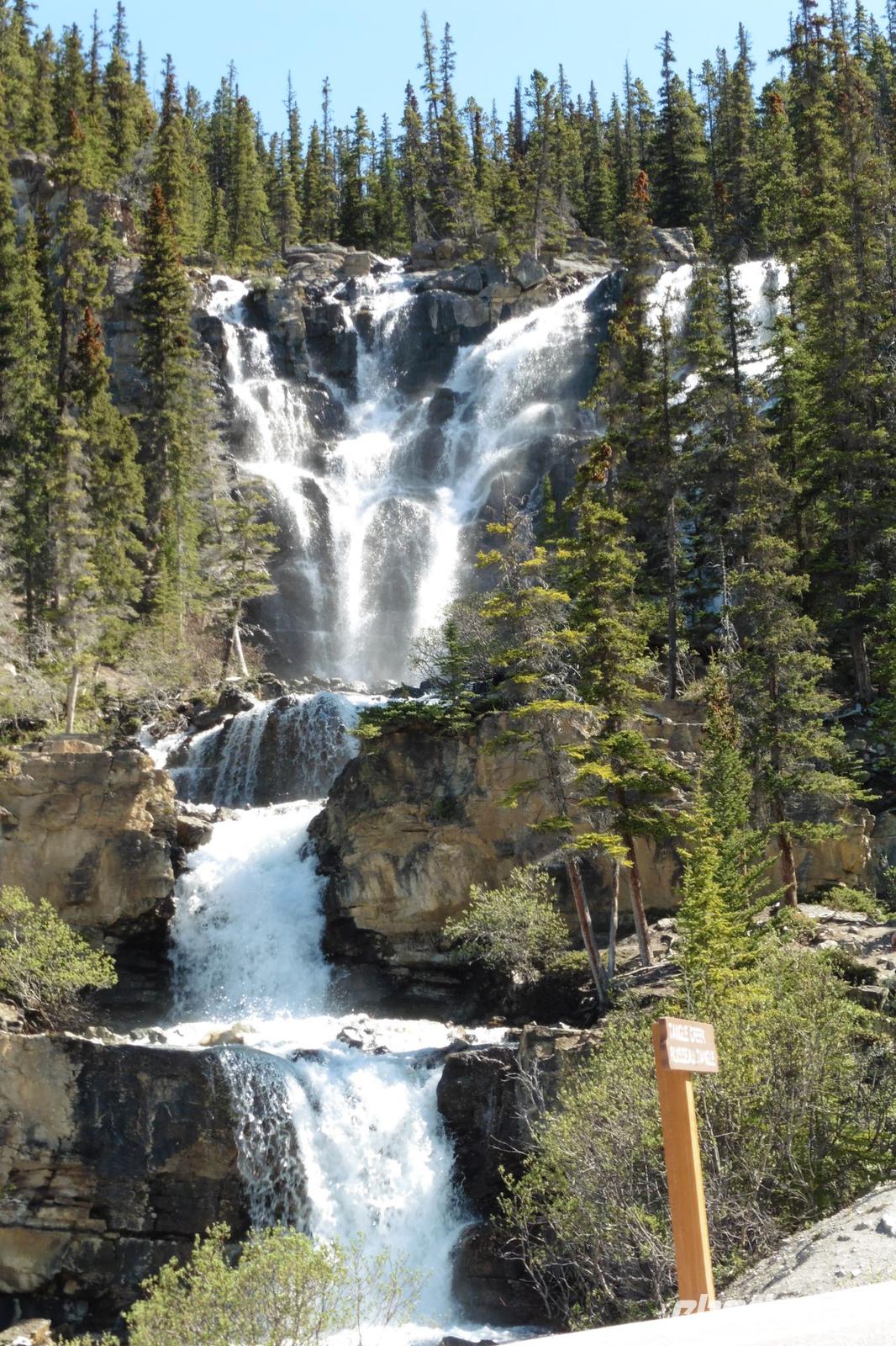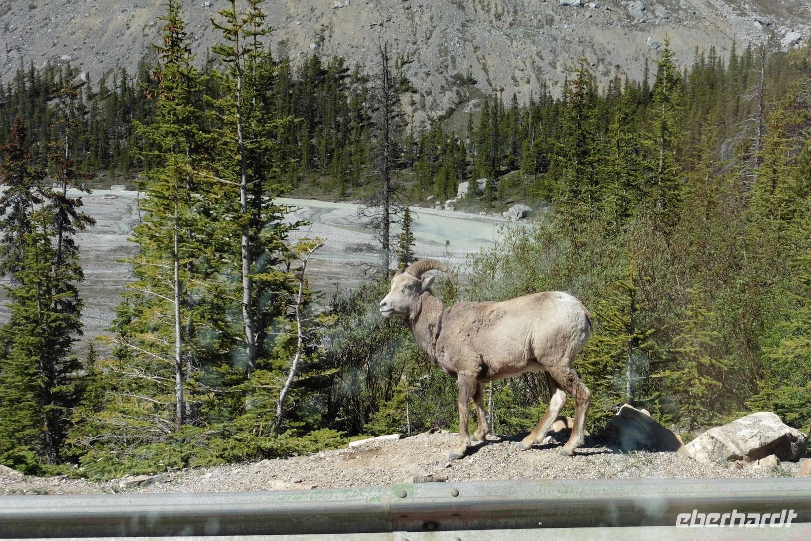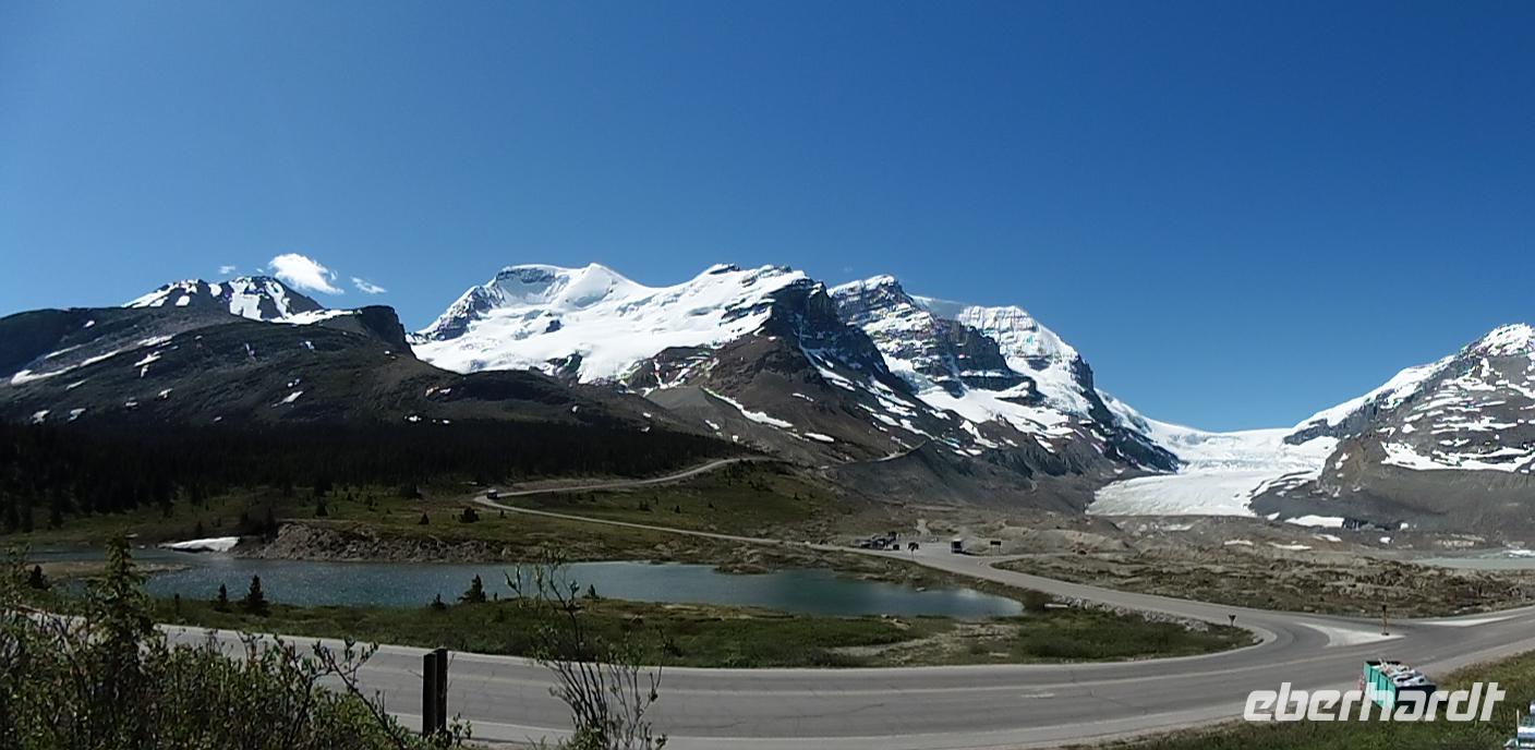 Mit gepackten Koffern und wie immer frisch geputztem Bus starten wir in Richtung Traumstraße der Welt - dem Icefields Parkway. Unseren ersten Stopp legen wir an den Athabasca Fällen ein und unternehmen einen Spaziergang entlang der Fälle. Beim nächsten Halt sehen wir wieder einen Wasserfall - diesmal der Sunwapta Fall. Für einen kurzen Kodak Moment halten wir auch am Tangle Fall. Am Columbia Eisfeld angekommen, laufen wir mit gutem Schuhwerk zur Gletscherzunge. Dort merkt man schon die Kälte und wir sind froh eine gute Jacke dabei zu haben. Mit Geröll bauen wir unsere eigene kleine Pyramide und machen ein Erinnerungsfoto. Langsam und vorsichtig steigen wir nun wieder bergab zum Parkplatz. Nur unser Reiseleiter Peter springt wie eine Gämse über das Geröll.