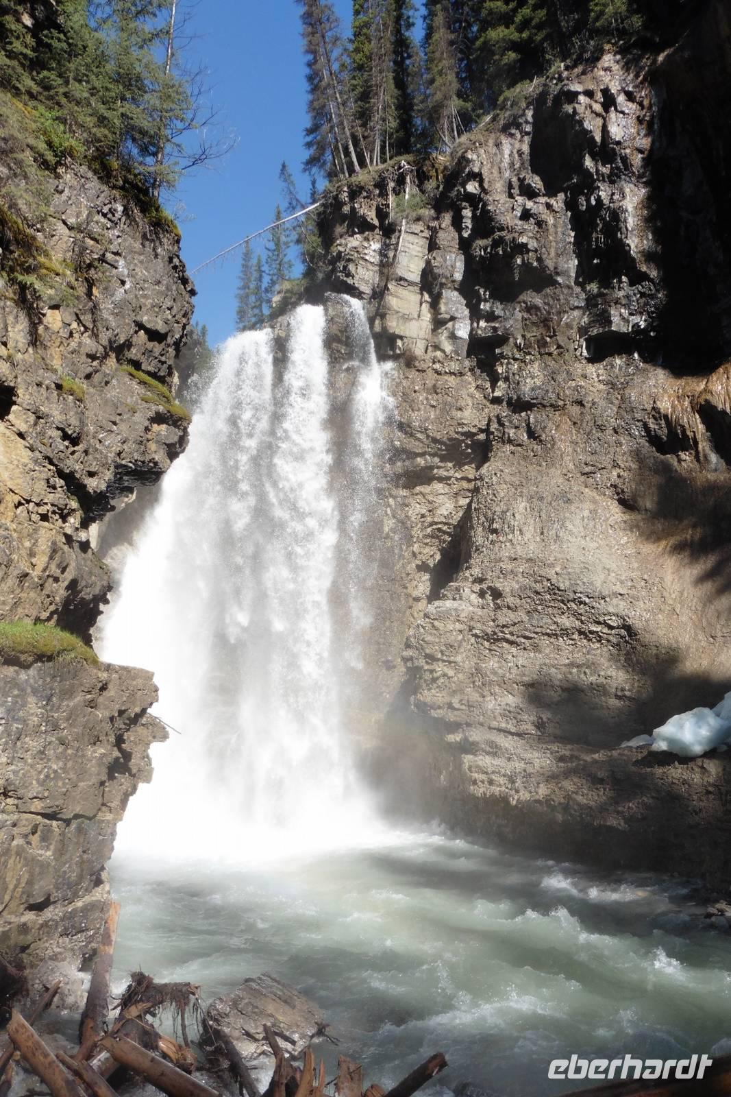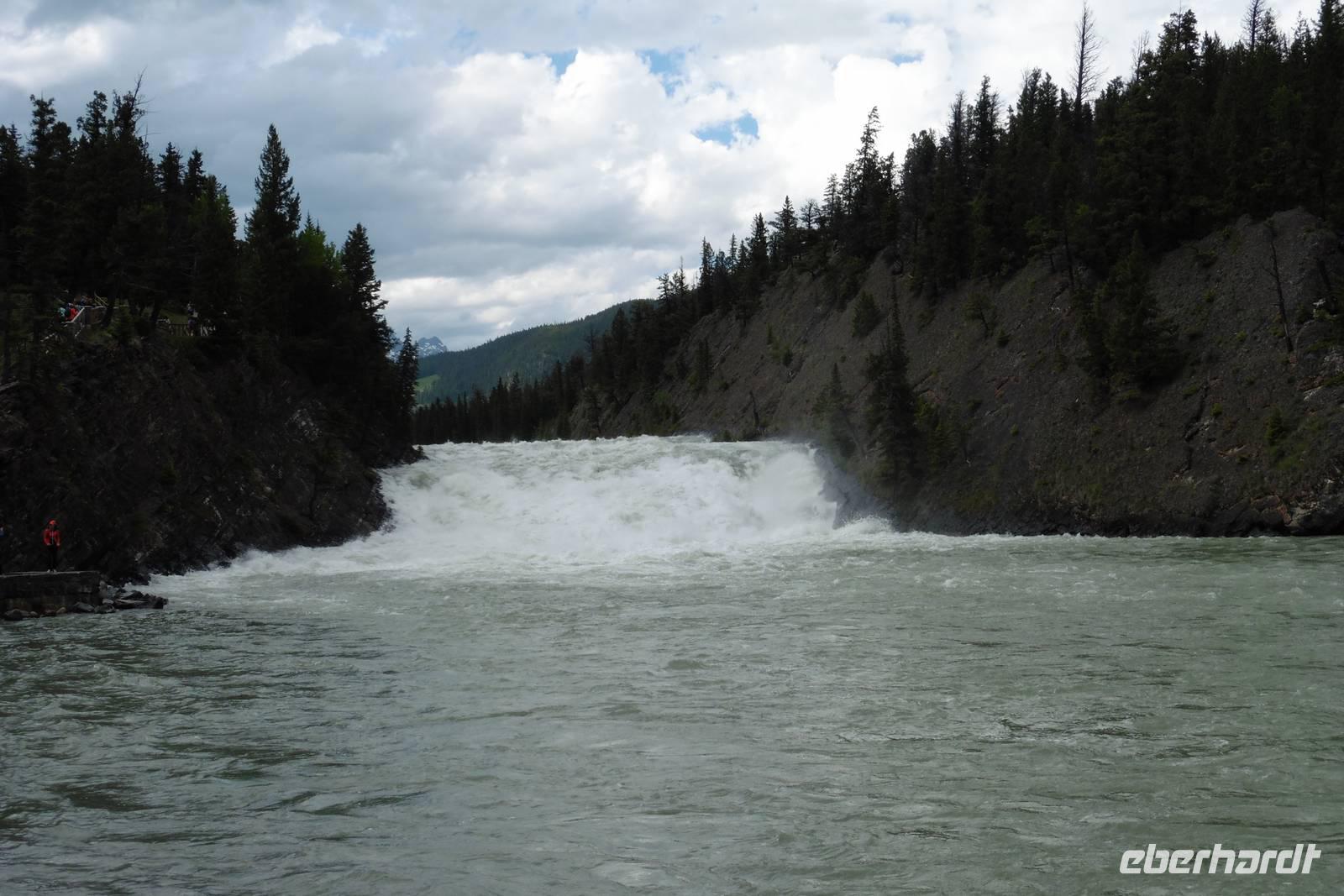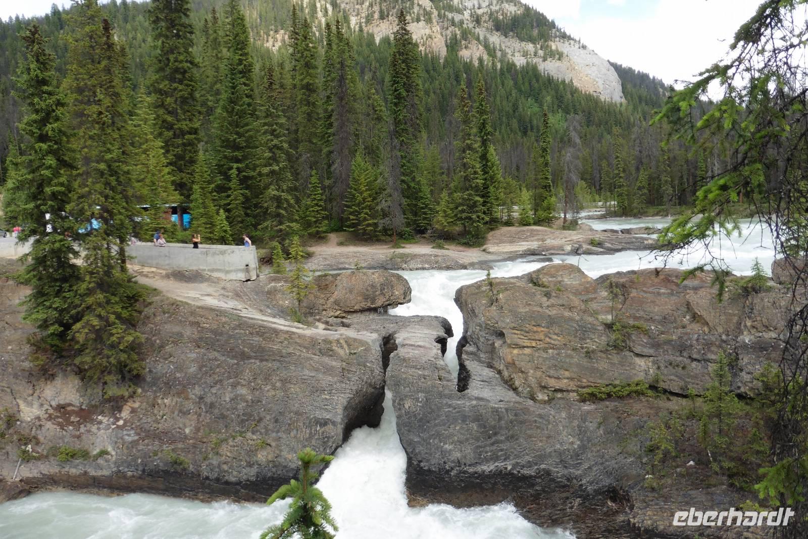 Heute wollen wir Bären in den Nationalparks sehen...Nach einer kurzen Busfahrt erreichen wir den Johnson Canyon. Auf einem gut ausgebauten Wanderweg laufen wir zu den beiden tosenden Wasserfällen, sogar unser Chauffeur Nathan braucht etwas „exercise" und begleitet uns zu Fuß. Am Viewpoint Spiraltunnel halten wir mit dem Bus, um die Kehrtunnel zu sehen, leider fährt zu dieser Zeit kein Zug auf dieser Strecke. Schade. Unsere Mittagspause machen wir am türkis schimmernden Emerald Lake - wieder eine tolle Kulisse. Peter und Nathan nutzen die Zeit um uns einen besonderen Kodak Moment zu bescheren - sie paddeln für uns auf dem See. Auf dem Weg in Richtung Banff halten wir am Kicking Horse River und besichtigen die Natural Bridge, die aus einer Felsbarriere durch den Fluss ausgefräst wurde.