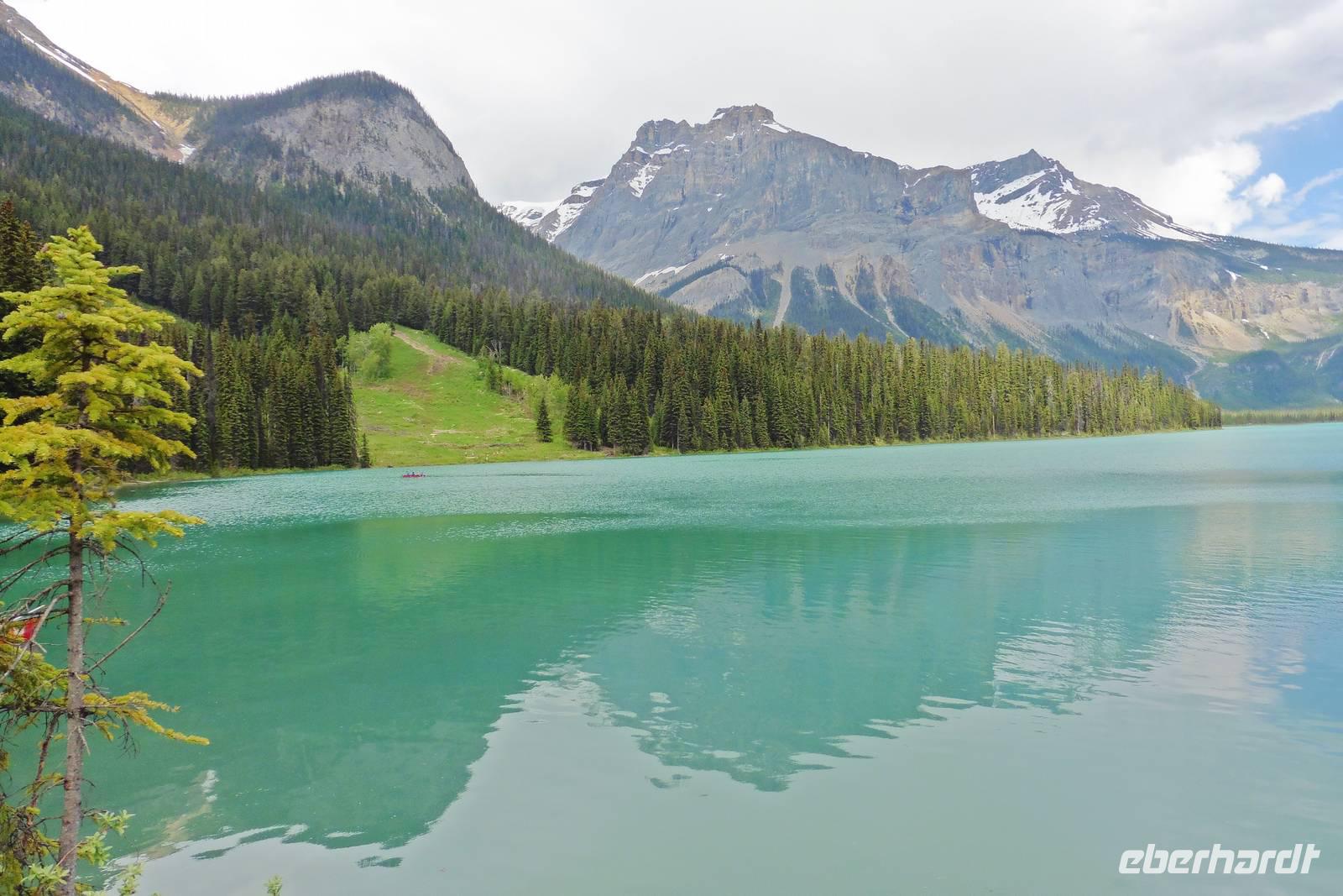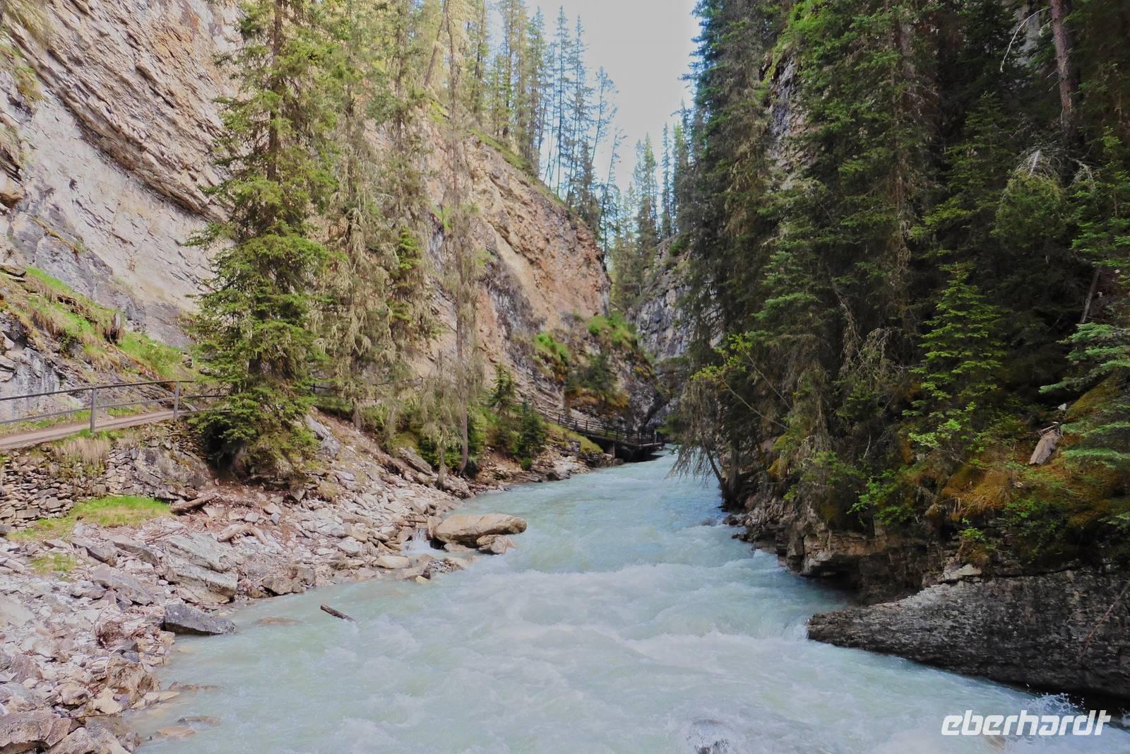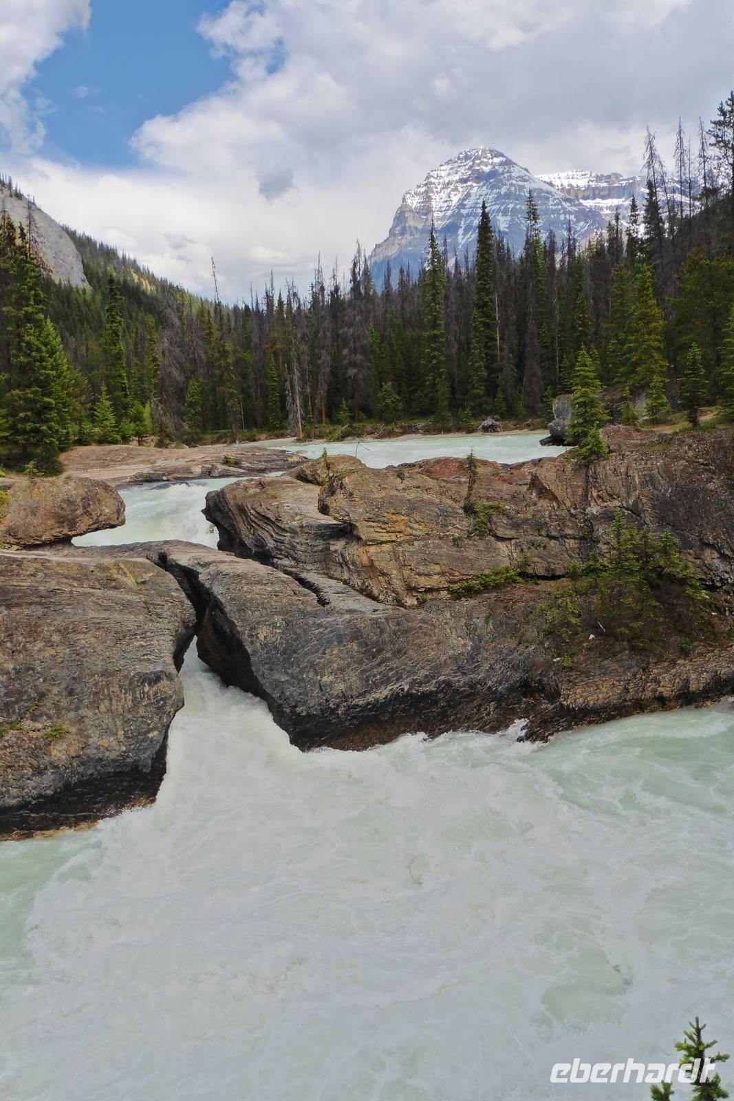 Heute wollen wir Bären in den Nationalparks sehen...Nach einer kurzen Busfahrt erreichen wir den Johnson Canyon. Auf einem gut ausgebauten Wanderweg laufen wir zu den beiden tosenden Wasserfällen, sogar unser Chauffeur Nathan braucht etwas „exercise" und begleitet uns zu Fuß. Am Viewpoint Spiraltunnel halten wir mit dem Bus, um die Kehrtunnel zu sehen, leider fährt zu dieser Zeit kein Zug auf dieser Strecke. Schade. Unsere Mittagspause machen wir am türkis schimmernden Emerald Lake - wieder eine tolle Kulisse. Peter und Nathan nutzen die Zeit um uns einen besonderen Kodak Moment zu bescheren - sie paddeln für uns auf dem See. Auf dem Weg in Richtung Banff halten wir am Kicking Horse River und besichtigen die Natural Bridge, die aus einer Felsbarriere durch den Fluss ausgefräst wurde.