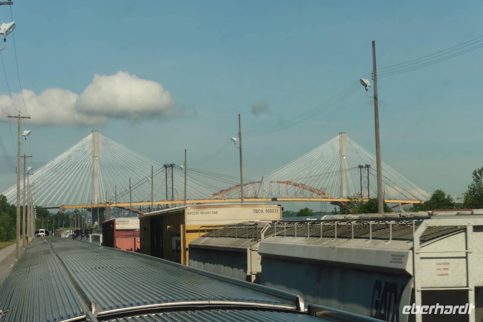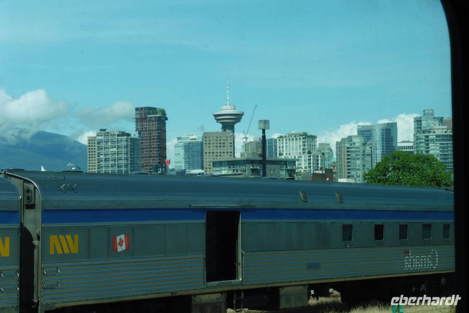 Durch einen längeren Halt in Kamloops hat unser Zug Verspätung. Nach einem zeitigen Frühstück sitzen wir bei strahlendem Sonnenschein im Domecar und bestaunen die vorbeiziehende Landschaft. Unterwegs passieren wir den schnell wachsenden Ort Surrey, der ca. 1 Stunden von Vancouver entfernt liegt. Angeblich sollen dort pro Monat 1200 Menschen einwandern. Bekannt ist der Ort ebenfalls durch die Port Mann Bridge, die mit 65m Breite und 12 Fahrspuren zu den breitesten Brücken der Welt gehört.