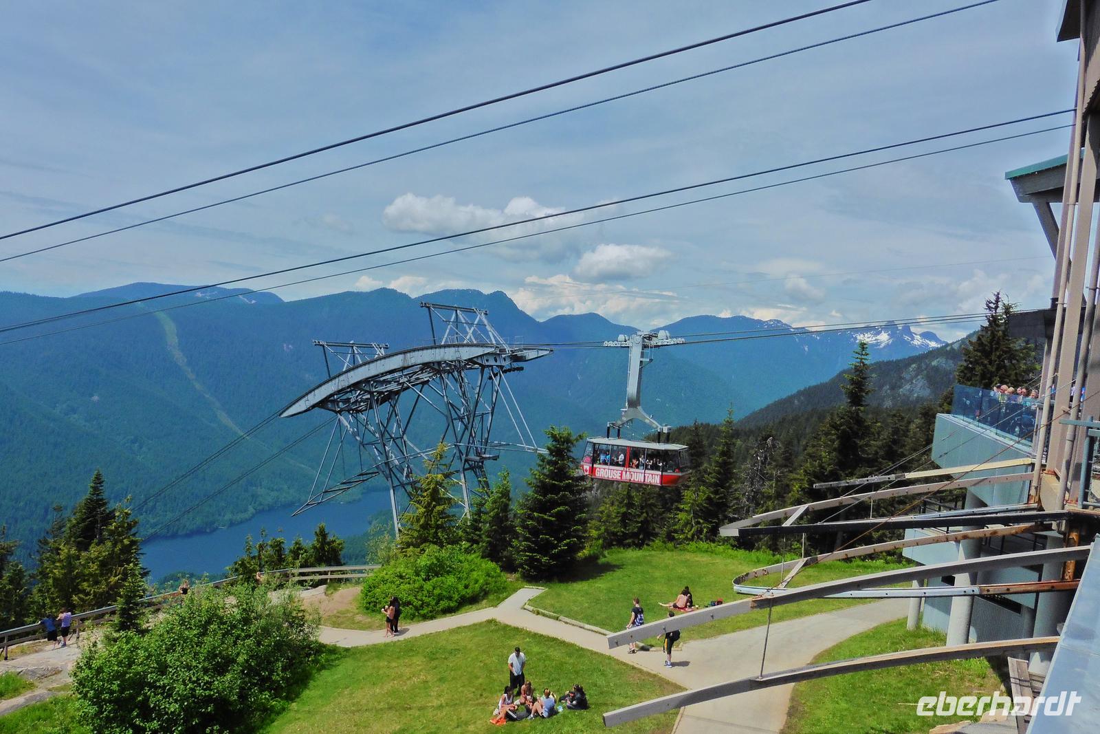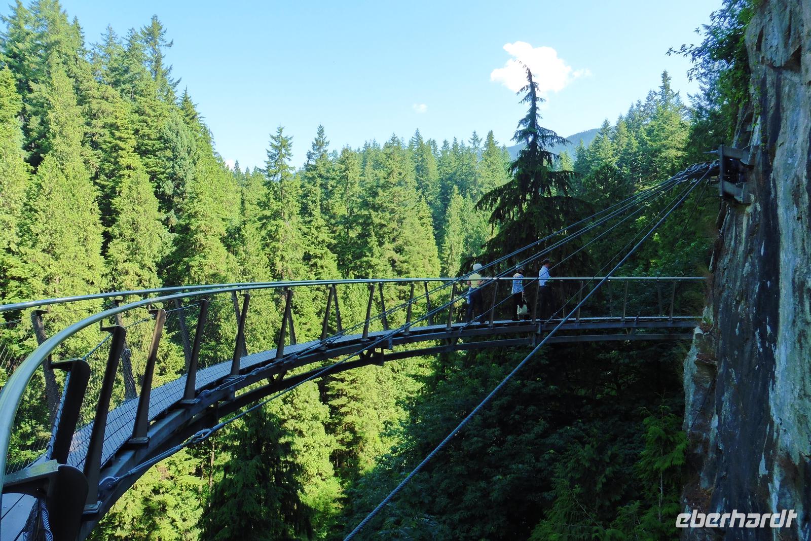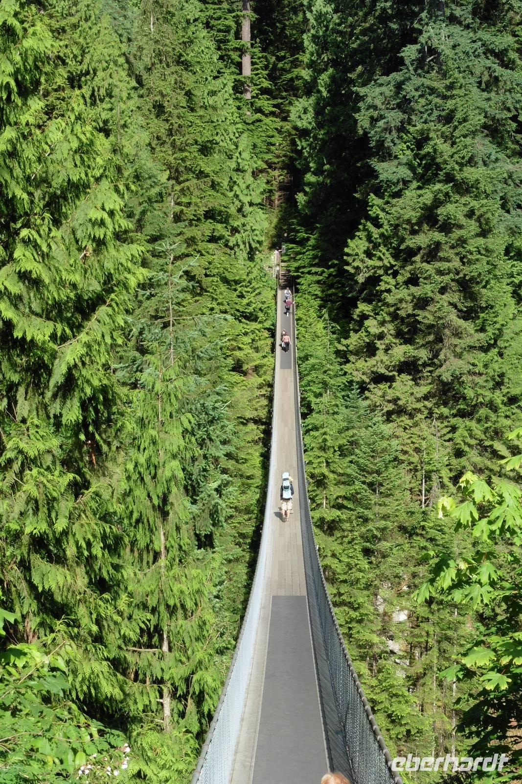 Nach dem Frühstück im Restaurant „Cloud 9" in der 42. Etage des Hotels „Empire Landmark" mit fantastischem Blick über Vancouver fahren wir mit unserer Reiseleiterin Gini in den grünen Norden von Vancouver. Als erste Gruppe an diesem Morgen betreten wir den Capilano Suspension Park. Spazieren dort über die Capilano Suspension Hängebrücke, die den 70m tiefen Canyon überquert, wandern auf dem Baumkronenpfad an den Rotzedern vorbei und testen den Rundgang über den neuen Cliffwalk entlang der Schlucht. Bevor wir wieder in den Bus einsteigen bekommen wir alle von Gini ein Brücken-Zertifikat. Nun wartet schon das nächste Highlight des Tages, die Auffahrt mit der Seilbahn auf den Grouse Mountain. Auf 1100 m Höhe warten verschiedene Attraktionen auf uns. Die Holzfällershow, ein Bärengehege mit zwei schlafenden Grizzlybären und große Holzschnitzereien. Bei schönem Wetter und einem Kaffee genießen wir einen letzten Blick vom Hausberg Vancouvers auf die Stadt.