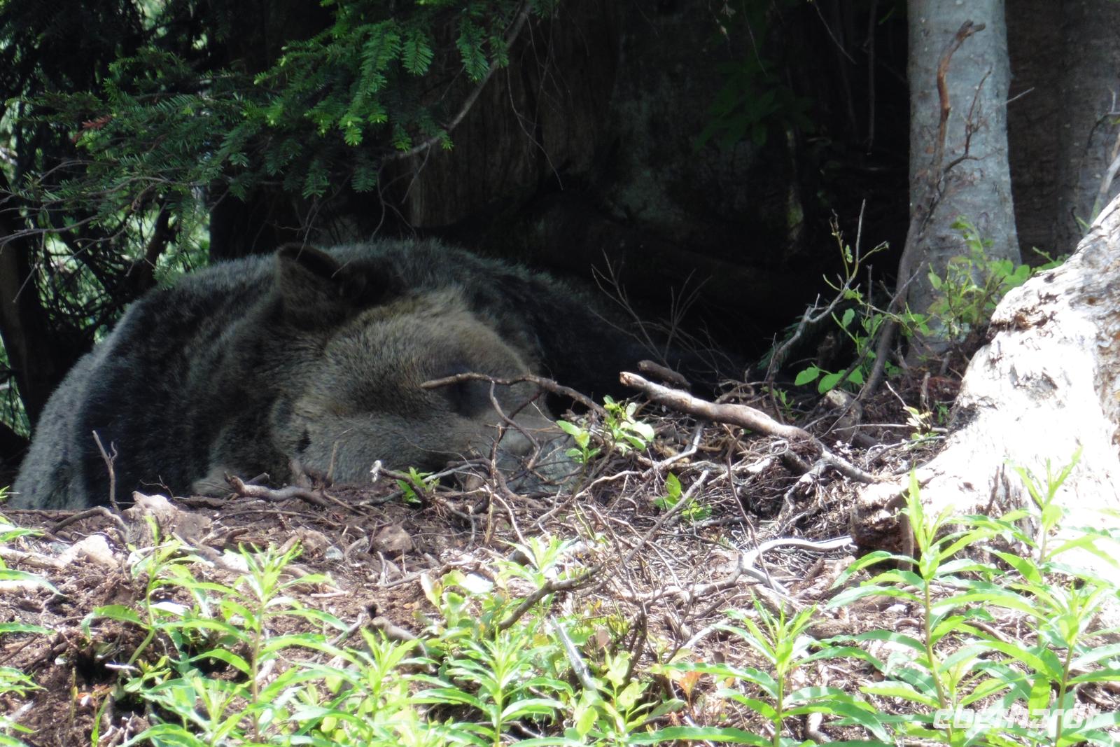 In Banff parken wir an der Seilbahnstation und laufen zu den Hot Springs, von weitem riechen wir schon die Schwefelbäder. Danach schlendern wir durch den kleinen Ort Banff, schauen nach Souvenirs oder trinken einen Kaffee. Am Abend kehren wir in Canmore in ein französisches Restaurant „Chez Francois" ein und lassen den Tag Revue passieren. Leider haben wir keinen Bären gesehen.