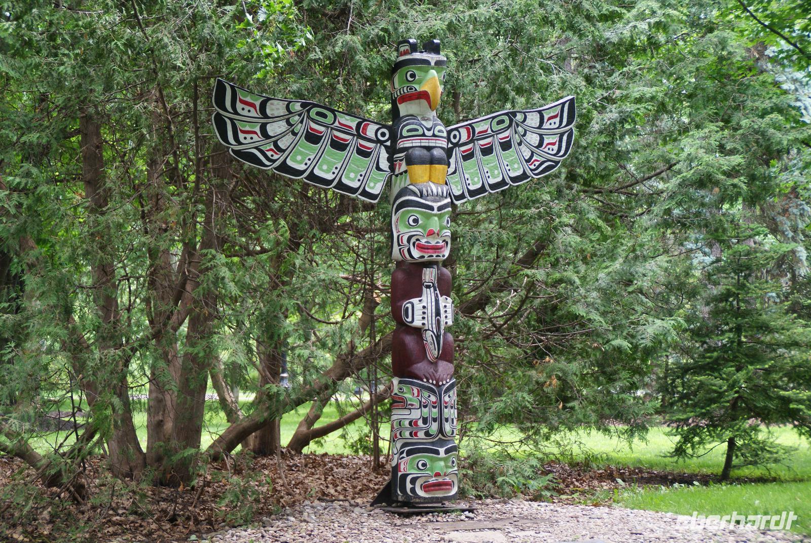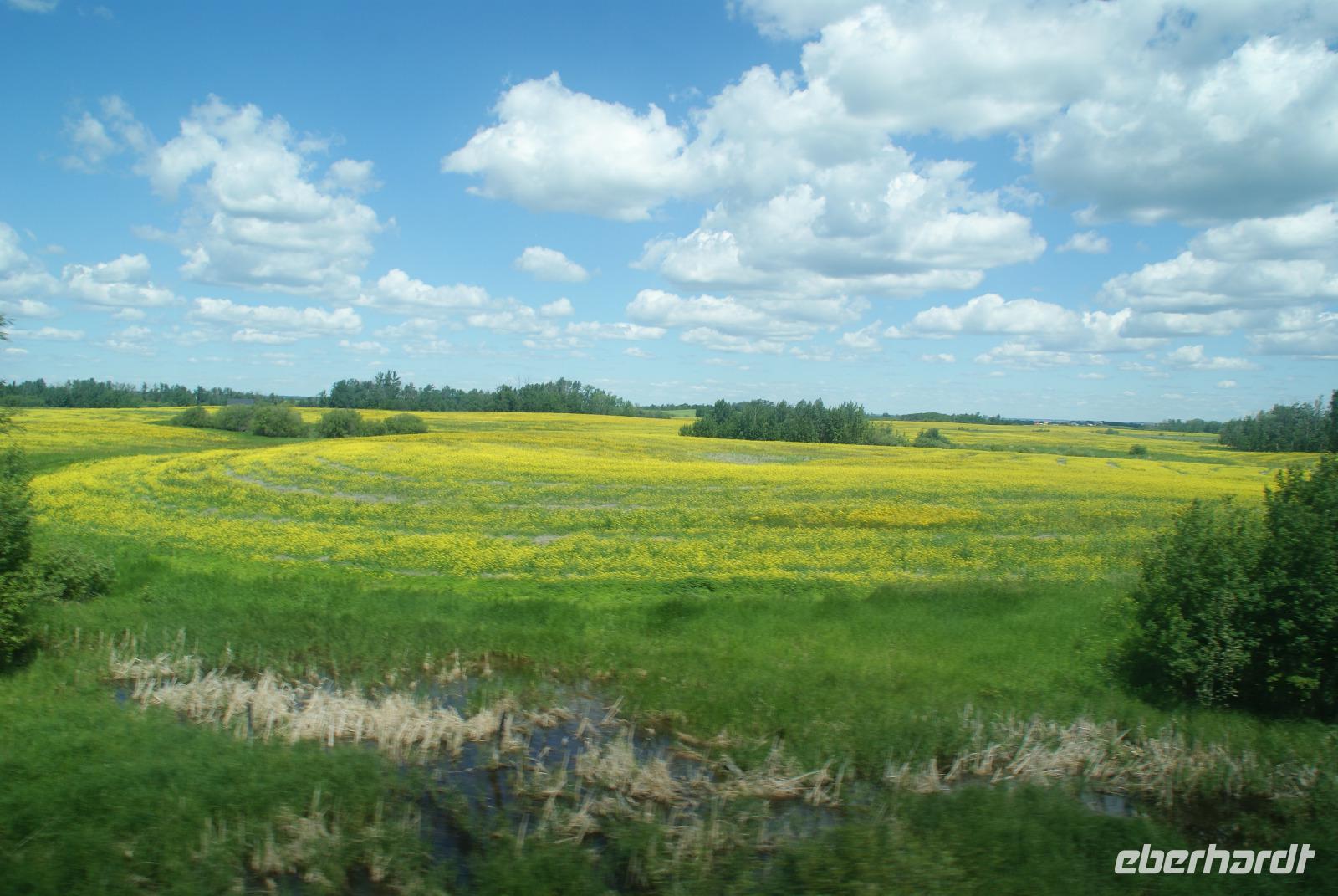 Heute stehen wir sehr zeitig auf, denn wir kommen am frühen Morgen in Winnipeg, der Hauptstadt der Provinz Manitoba an, wo wir ein paar Stunden Aufenthalt haben. Um 06.30 Uhr frühstücken wir gemeinsam im Speisewagen und haben auch zur frühen Stunde bereits die Auswahl vom kanadisch-deftigen bis hin zum gesunden Müslifrühstück. Mit Blick aus dem Fenster stellen wir fest, was wir für ein Glück mit dem Wetter haben und so zeigt sich uns Manitoba bei strahlendem Sonnenschein und schon angenehm milden Temperaturen. Um 08.30 Uhr gehen wir wohlgestärkt auf unsere Winnipeg Tour und schauen uns das französische Viertel Old St. Boniface an. Dazu spazieren wir über die imposante Brücke „Esplanade Riel", die als einzige Brücke Nordamerikas gilt, auf der man ein Restaurant finden kann. Diese wurde benannt nach dem Gründer Manitobas Luis Riel, dessen Denkmal wir in der Nähe der Kathedrale vorfinden werden. Von der einst schönen Kathedrale St. Boniface stehen leider nur noch die Grundmauern, da diese im Jahr 1968 abgebrannt ist. Jedoch kann man sich im Kircheninneren anhand eines Modells die frühere Kirche in kompletter Form ansehen. Vorbei an der einzigen französischsprachigen Universität West Kanadas spazieren wir zurück zum Zentrum. In den ehemaligen Markthallen „The Forks" findet so mancher noch ein Mitbringsel und mit Sicherheit einen sehr guten Kaffee. Zeit hätten wir noch gehabt, leider haben sich keine Gäste aus unserer Gruppe gefunden, die gerne an der öffentlichen, kostenfreien Aerobic Stunde vor der Markthalle teilnehmen wollten...Gegen Mittag gehen wir wieder an Bord des Canadians und werden von der neuen Crew mit einem leckeren Mittagessen verwöhnt. Besonders nette Gäste (so wie wir natürlich) bekommen auch wieder die erste Schicht, so dass es auch heute wieder hervorragend passt. Anschließend treffen sich die meisten im Dome Car, in einem der Panoramawagen des Zuges und wir lassen die Kanadische Natur mit wechselnder Fauna an uns vorbeiziehen. Es entstehen nette Gespräche und der Nachmittag nimmt gemütlich seinen Lauf. Abends wird uns nochmals ein tolles 3-gängiges Menü serviert und auch heute stellen wir die Uhren nochmals um eine Stunde zurück, wechseln somit von der Central Time in die Mountain Time. Wie des Öfteren auf der Strecke muss unser Canadian einem vorbeifahrenden Güterzug weichen und wir zählen 165 Waggons, getoppt wurde dies im Laufe der Fahrt von einem weiteren Zug mit 220 Waggons.