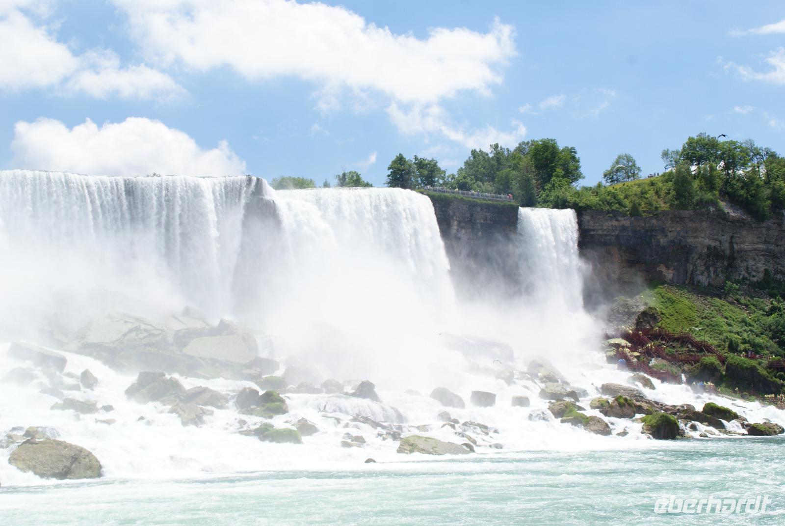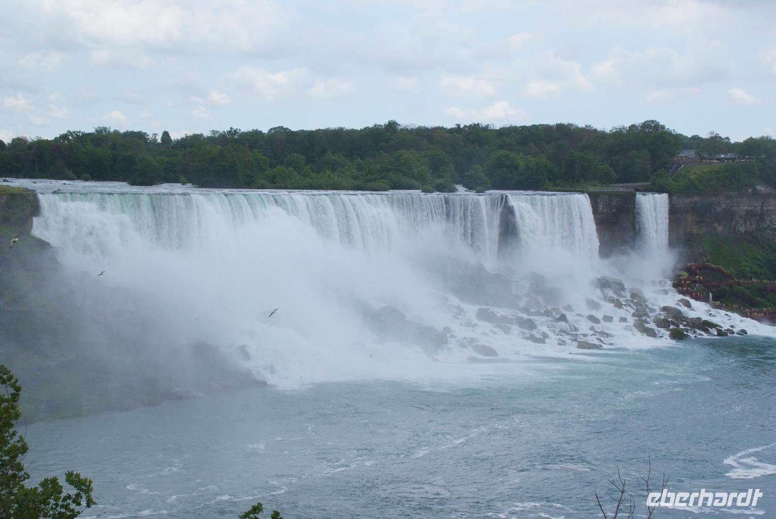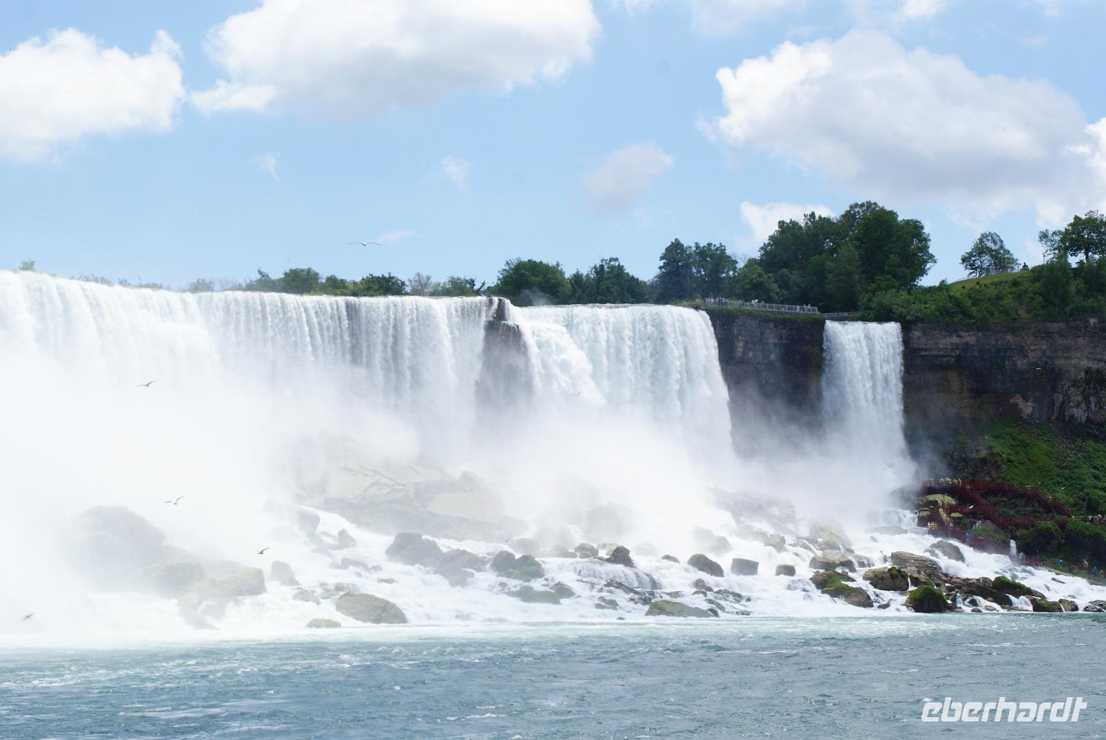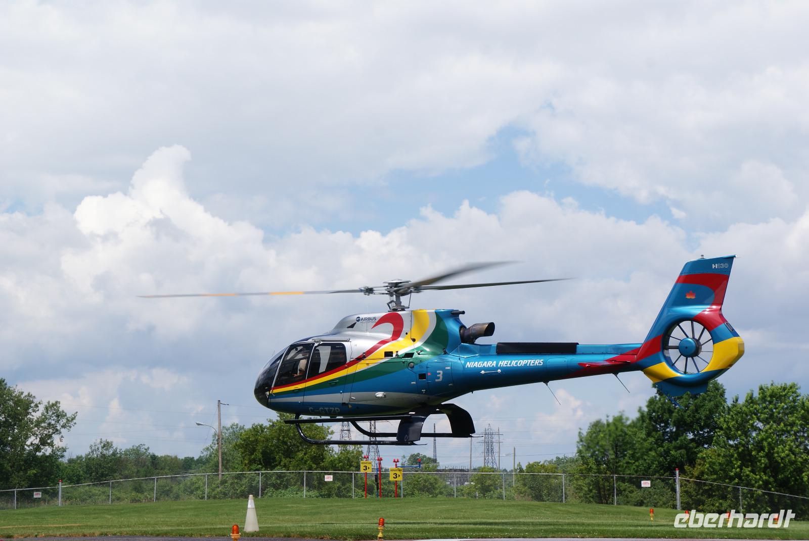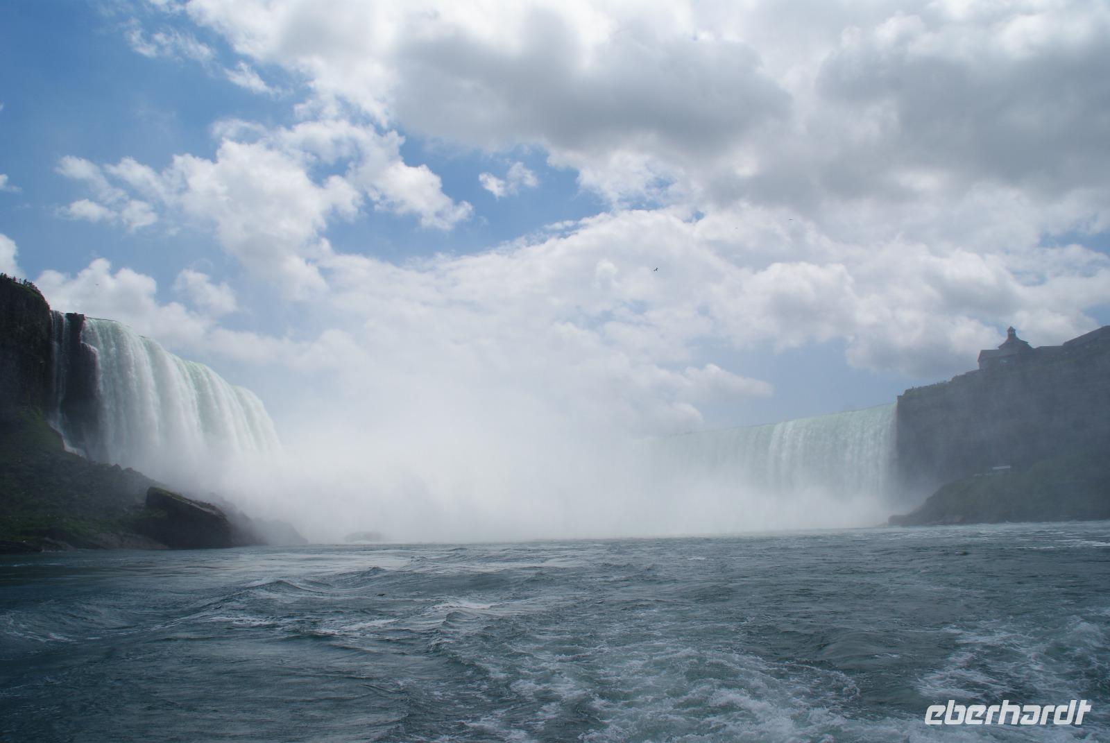 Nach dem Frühstück starten wir damit, unser Gepäck zum Bahnhof zu bringen, damit dieses bereits für abends im Canadian abgefertigt werden kann. Weiter geht's mit der Besichtigung Torontos von oben und es geht auf den berühmten CN Tower hoch hinauf. Es ist noch wenig los und wir genießen die Rundumsicht auf diese riesige Metropole. Reiseleiterin Barbara gibt uns einen Überblick, was wir tags zuvor auf unserer Stadttour bereits besichtigt haben, während wir auf der 324m hohen Plattform stehen. Wir verlassen Toronto und fahren Richtung Niagara Fälle. Viele von uns möchten auch den Helikopterflug über die Fälle wahrnehmen und so beginnen wir mit diesem Highlight. Strahlende Gesichter steigen anschließend aus den Helis und man ist sich einig, dass sich der Flug wirklich gelohnt hat. Ein weiterer Höhepunkt sollte folgen. Wir fahren mit dem Boot der Firma Hornblower auf dem Fluss sehr nah an die Fälle heran und amüsieren uns köstlich über unsere Optik. Alle im Müllsack-Rot verkleidet, soll uns das Regencape vor allzu viel Nässe schützen. Dies funktionierte nur bedingt, aber dank der Sonne im Anschluss sind auch wir schnell wieder trocken. Wir machen uns auf den Rückweg nach Toronto und fahren durch das bekannte Örtchen „Niagara on the lake" und sind begeistert, welch einen idyllischen und gepflegten Ort wir hier durchfahren. Mit sehr viel Stau auf unserem Rückweg erreichen wir Toronto genau pünktlich zum Abendessen und erhalten dieses besonders köstlich. Wir alle sind aufgeregt und voller Vorfreude auf die nächsten Tage. Die Zeit drängt ein wenig, denn der berühmte Canadian wartet nur ungern. Um 21.40 Uhr gehen alle Passagiere an Bord und 22.00 Uhr geht die Reise los. Leider müssen wir uns hier von unserer tollen Reiseleiterin Barbara verabschieden, die uns sehr beeindruckend die letzten beiden Tage geführt hat. Gerne erinnern wir uns an von ihr vorgetragenes Zitat: