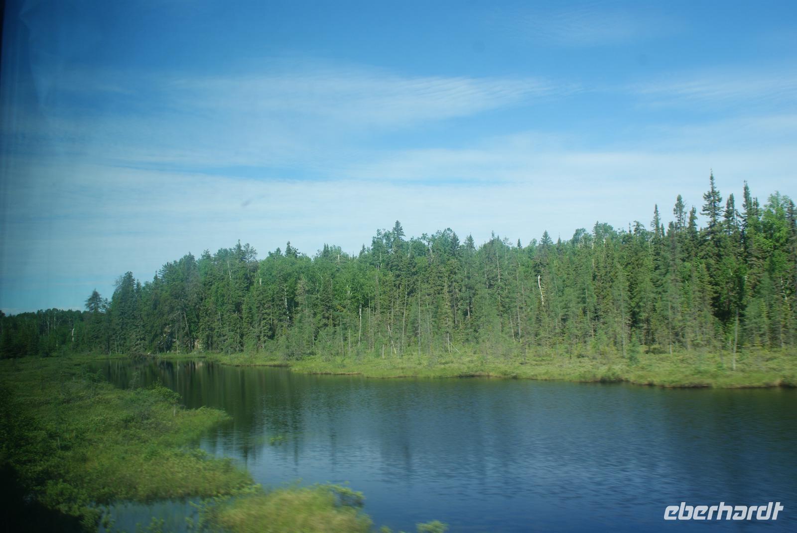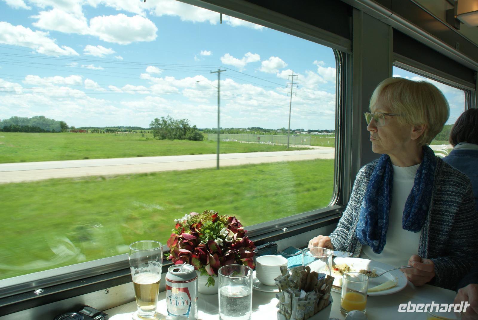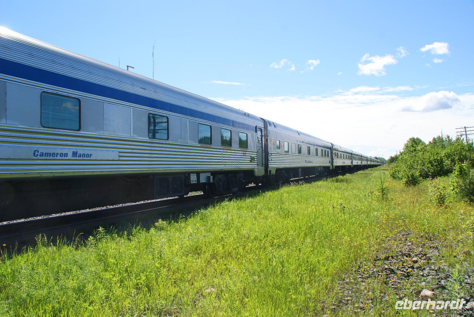 In den Schlaf geschaukelt erleben wir unsere erste Nacht an Bord und sehen uns zum Frühstück wieder. Es erfolgt ein deftiges, kanadisches Frühstück und so gestärkt könnten wir sicher mit den Kanadischen Holzfällern mithalten! Wir genießen im Activity Car oder in unseren Kabinen die wunderschöne Natur der Provinz Ontario, die uns mit viel Sonne empfängt. Es vergeht ein schöner, erholsamer Tag an Bord und wir genießen ein vorzügliches Mittagessen, welches uns in 3 Gängen im Speisewagen serviert wird. Erneut sind wir von der Freundlichkeit des Kanadischen Servicepersonals beeindruckt und vor allem von der Qualität der Speisen, die hier im Zug auf engem Raum für die Küche stets frisch erzeugt werden. Am frühen Nachmittag halten wir in Hornepayne und dürfen uns 20 Minuten außerhalb des Zuges die Beine vertreten. Es entstehen tolle Aufnahmen vom Zug, der sich nun in seiner gesamten Dimension zeigt. Ein Wahnsinn: 22 Waggons sind an die Lok angehangen und es werden 222 Gäste transportiert, die man während der Fahrt nicht im Geringsten wahr nimmt, es verteilt sich alles bestens. Um 16 Uhr treffen wir uns zur Bierprobe im Panoramawagen und wir lassen uns die verschiedenen Sorten schmecken, genießen die herrliche Landschaft, die vorüberzieht und lauschen den Klängen der beiden Musiker, die uns ein Ständchen bringen. Manche von uns haben sogar das Glück eine Elchkuh mit Kalb unweit der Strecke zu sehen....Am Abend erfolgt ein wunderbares Abendessen und wir sind uns alle einig, dass dieser Zug mit all seinen Besonderheiten wirklich einmalig ist und den Gästen hier viel geboten wird. Zum Schlafengehen stellen wir die Uhr um eine Stunde zurück und wechseln von der Eastern Time zur Central Time.