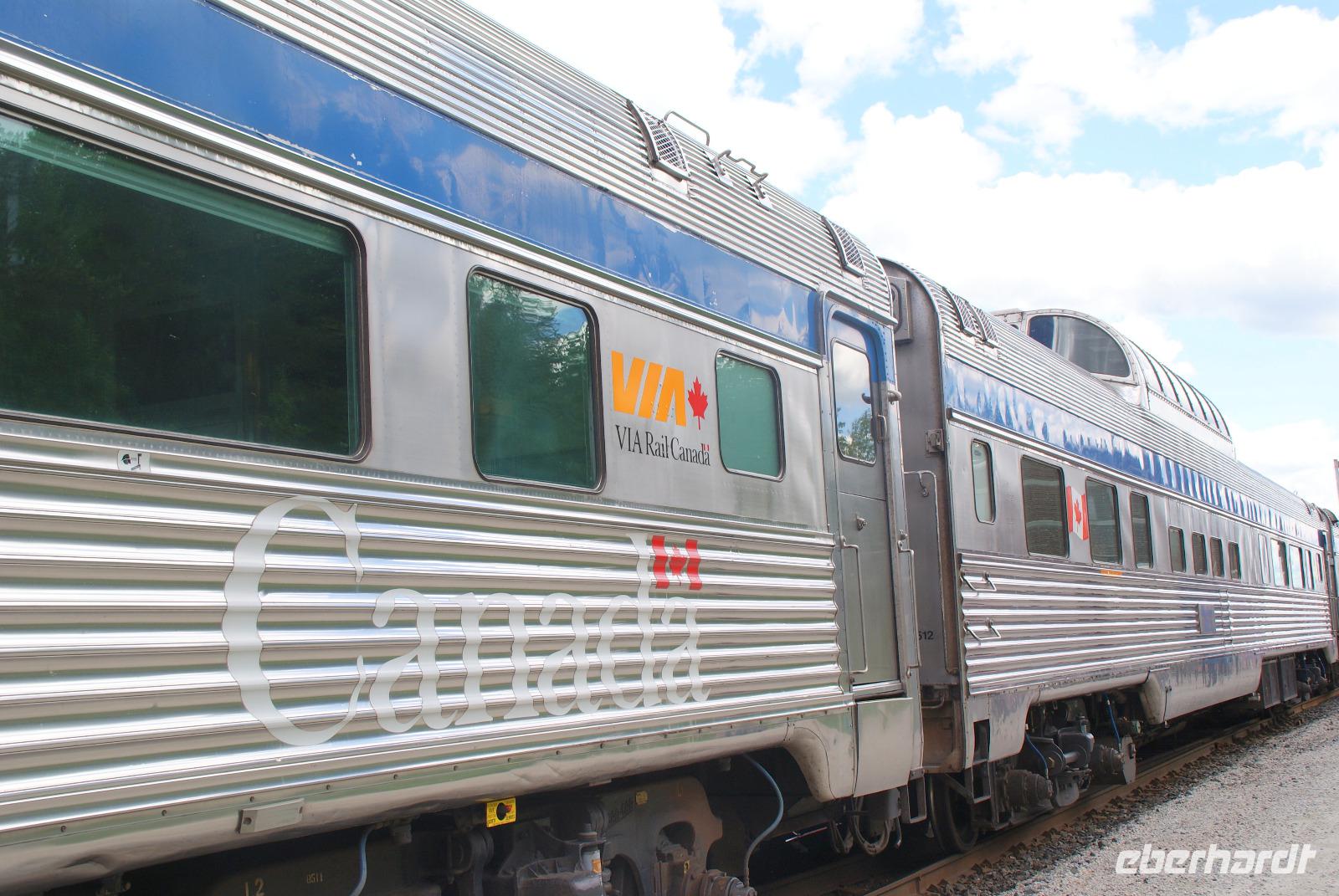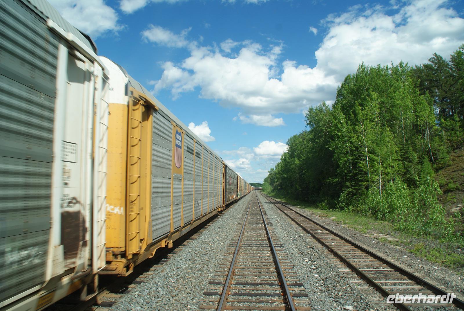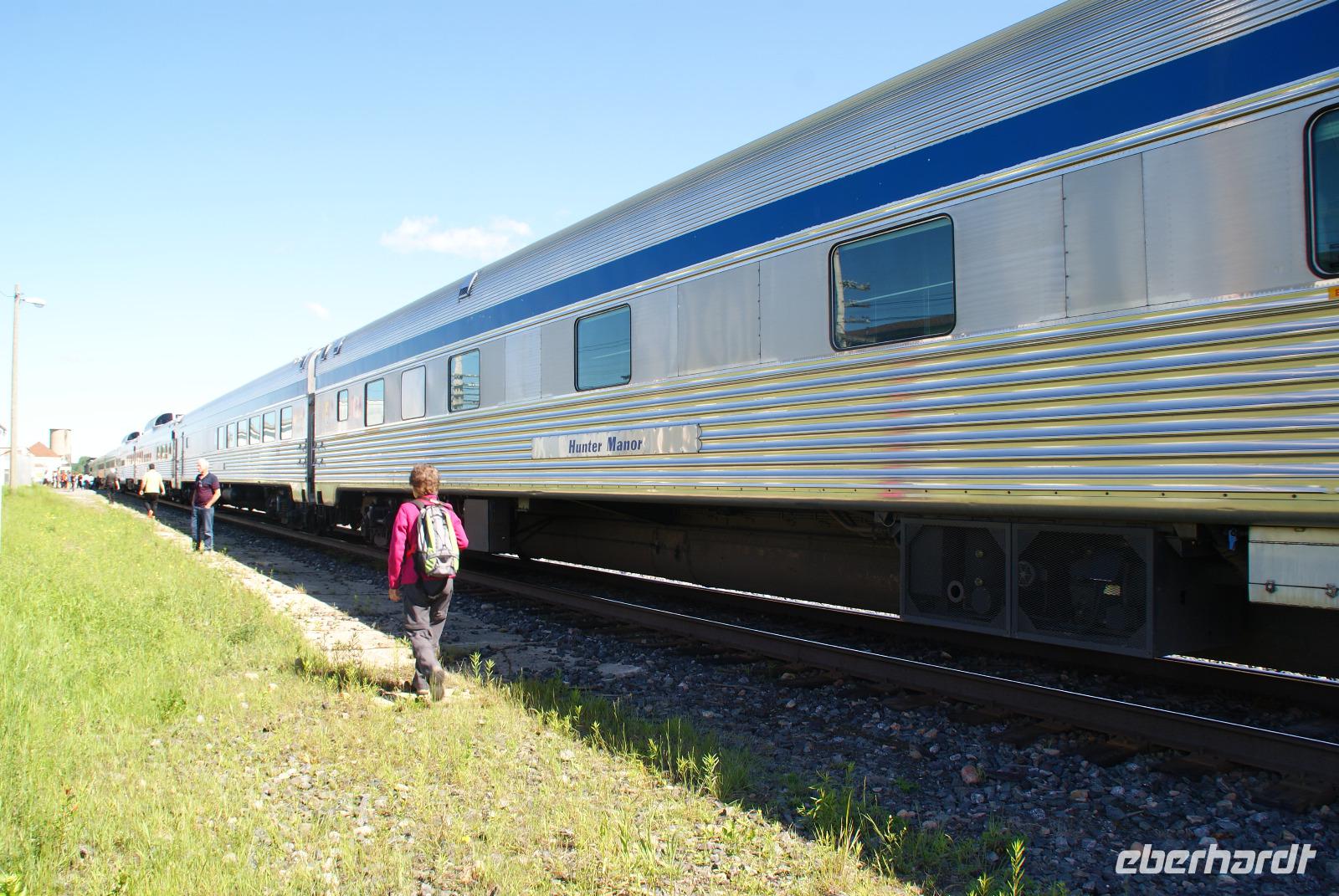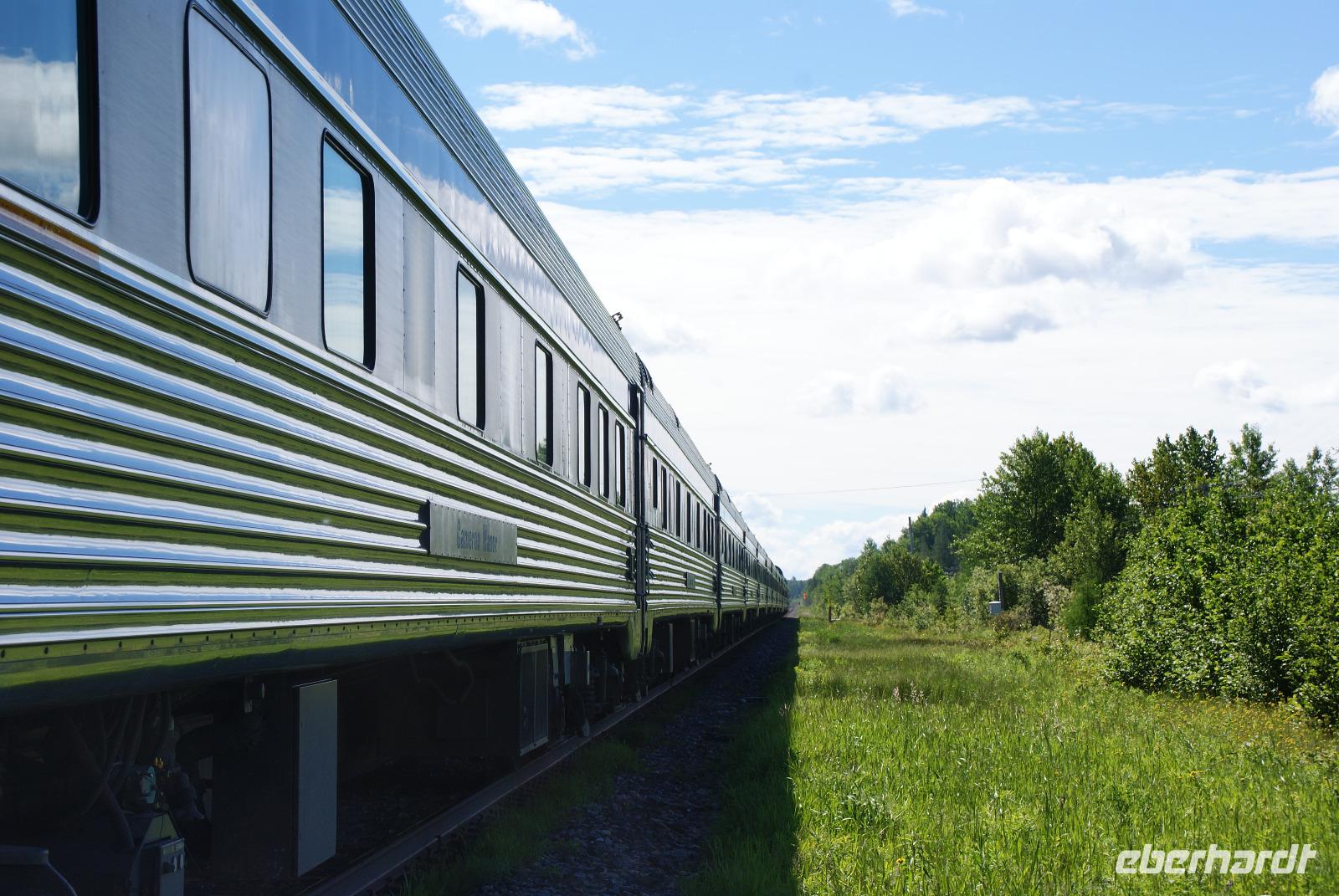Als wir morgens in unseren Betten wach werden, erschleicht uns das Gefühl, dass wir irgendwie noch nicht so weit sind, wie wir eigentlich sein sollten. Leider bestätigt sich diese Vermutung und bedingt durch einen Zugunfall vor uns auf der Strecke hängen wir beachtliche Stunden. Wir gewöhnen uns an den Gedanken- was bleibt uns übrig. So genießen wir weitere Stunden an Bord und lassen die kanadische Landschaft an uns vorbeiziehen.