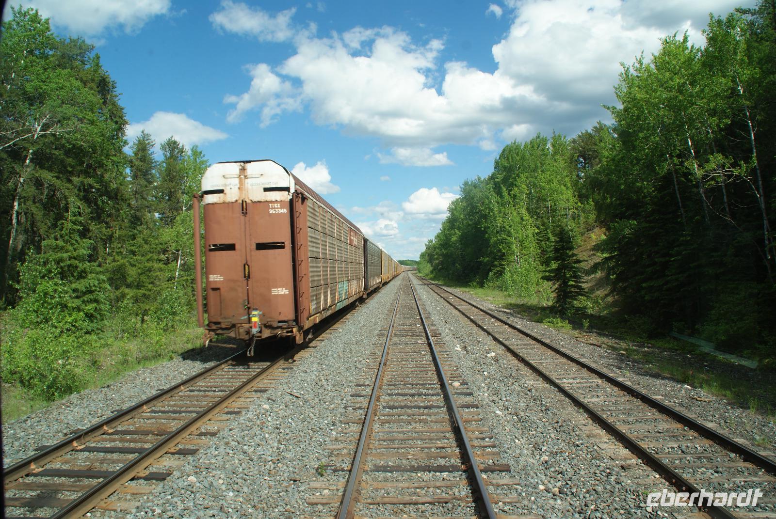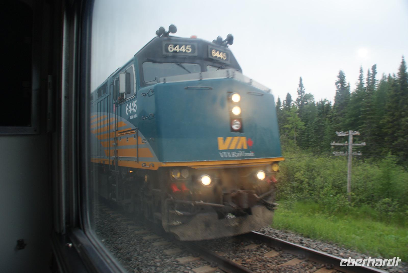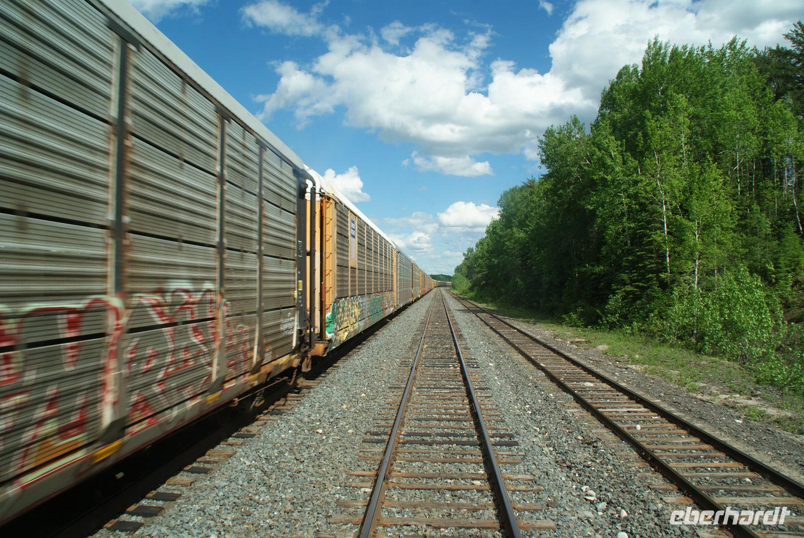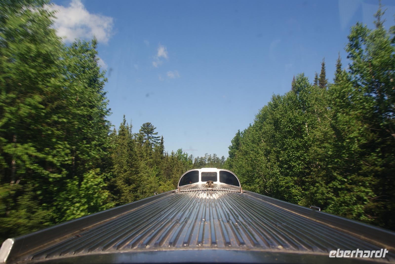 Als wir morgens in unseren Betten wach werden, erschleicht uns das Gefühl, dass wir irgendwie noch nicht so weit sind, wie wir eigentlich sein sollten. Leider bestätigt sich diese Vermutung und bedingt durch einen Zugunfall vor uns auf der Strecke hängen wir beachtliche Stunden. Wir gewöhnen uns an den Gedanken- was bleibt uns übrig. So genießen wir weitere Stunden an Bord und lassen die kanadische Landschaft an uns vorbeiziehen.