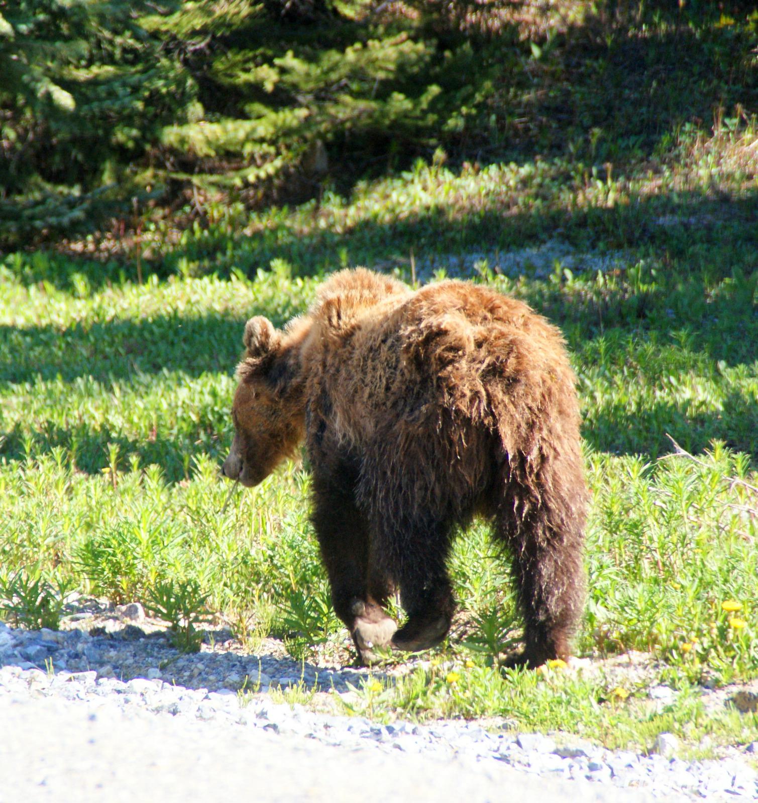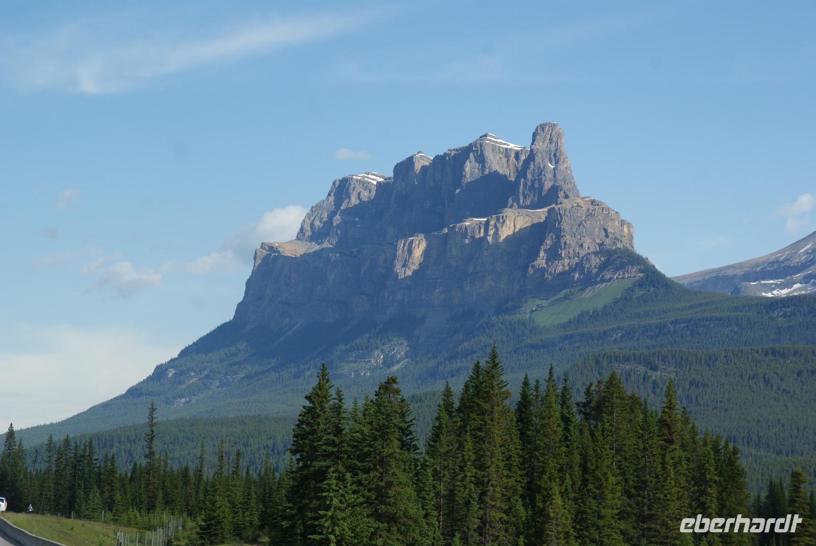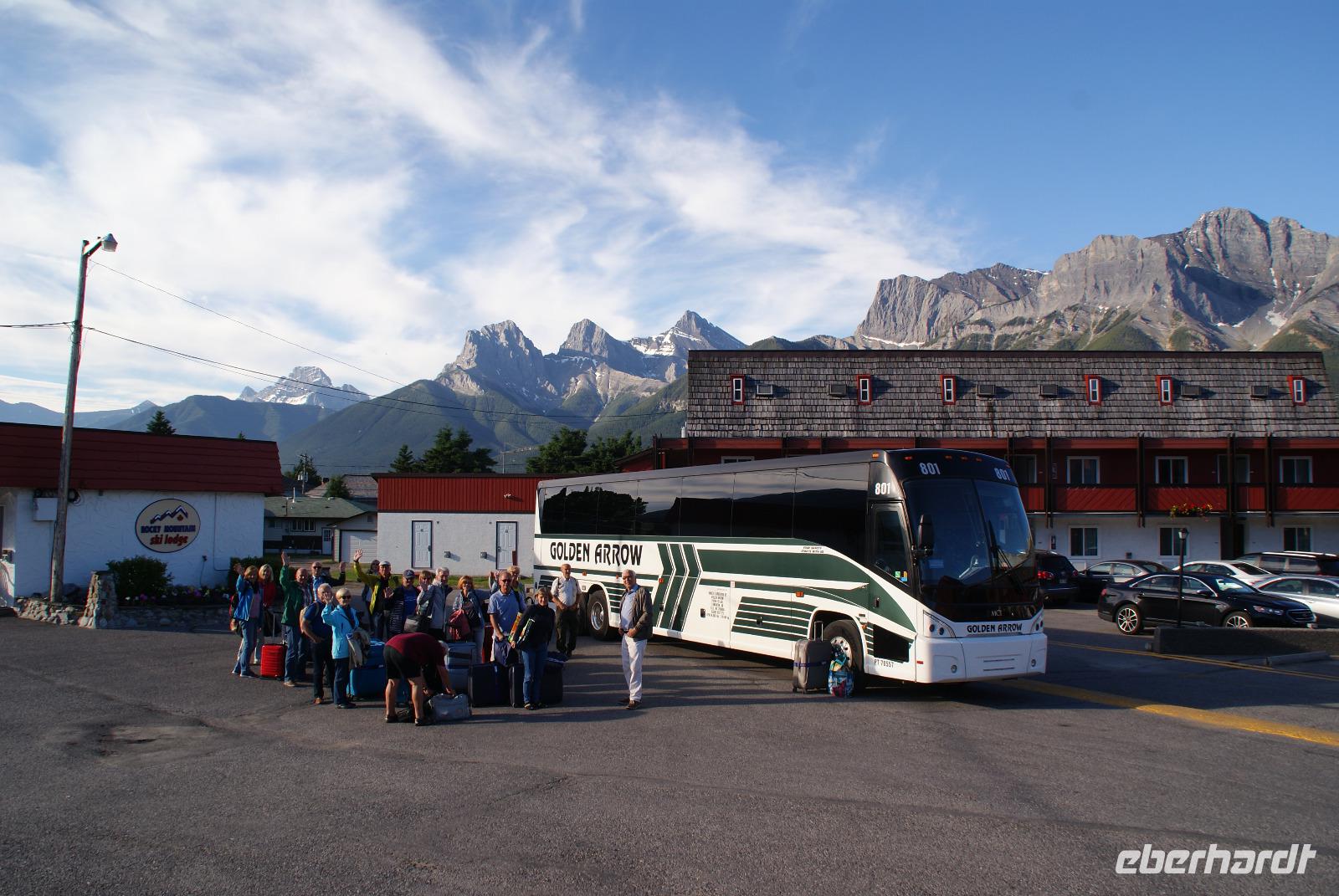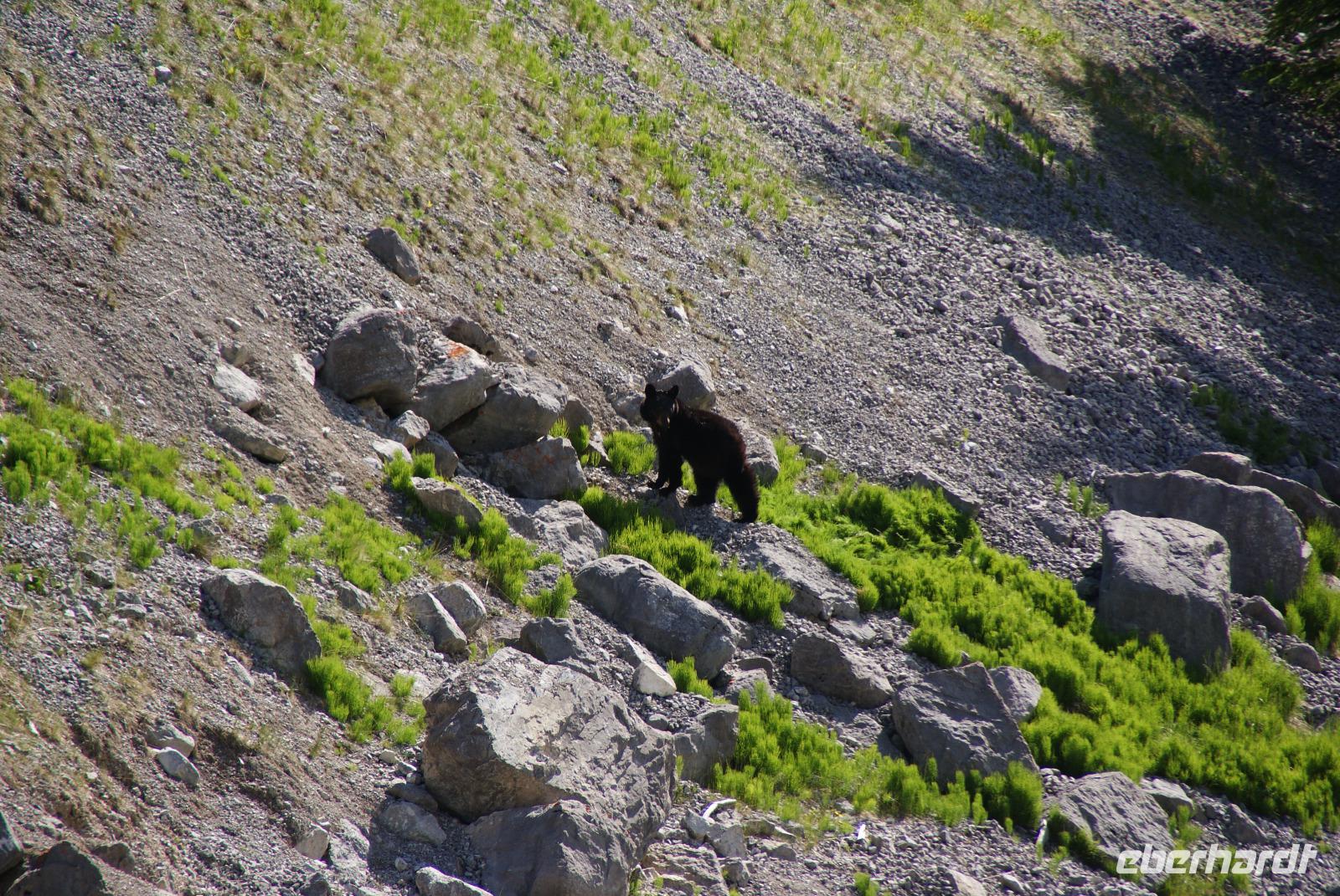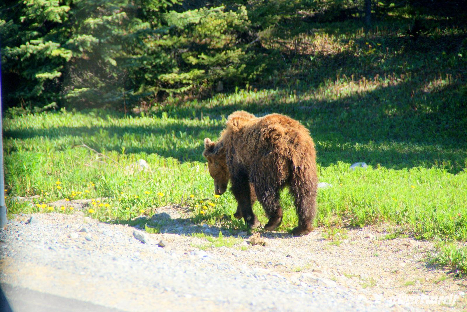 Ein schöner Morgen mit viel Sonnenschein erwartet uns. Wir frühstücken nochmals im Sage Bistro und begeben uns anschließend auf die Rückfahrt nach Jasper, wo wir wieder den Canadian nach Vancouver nehmen werden. Es folgt ein Fotostopp und nochmals ergibt sich die Möglichkeit den gewaltigen „Castle Mountain" aus unmittelbarer Nähe aufzunehmen. Über den Trans-Canada Highway und Icefield Parkway geht unsere Reise weiter. Plötzlich sehen wir einen großen PKW Auflauf auf dem Highway und sind uns sicher-Bär in Sicht.