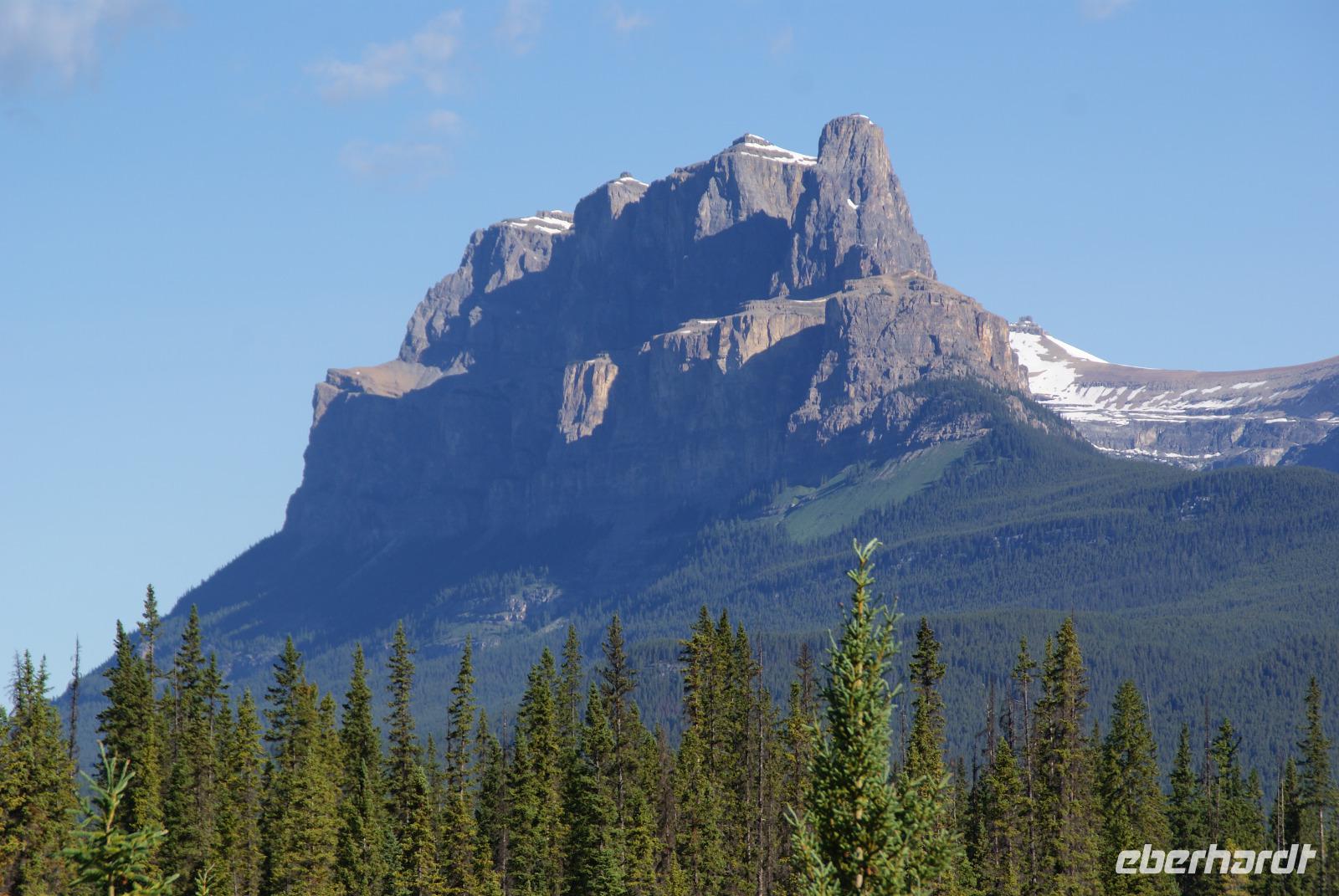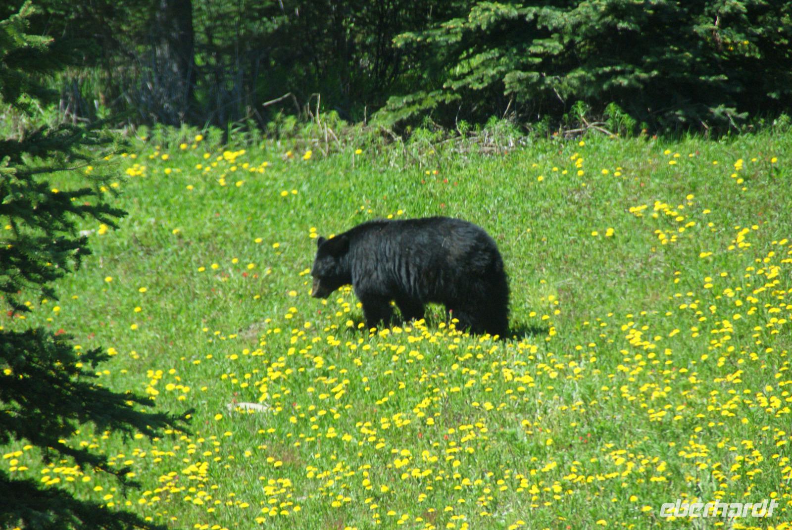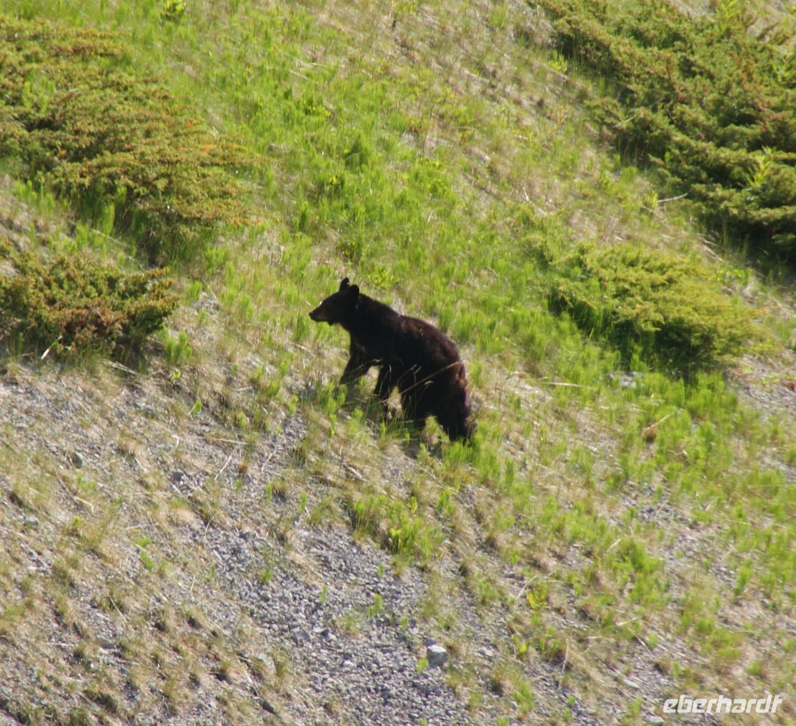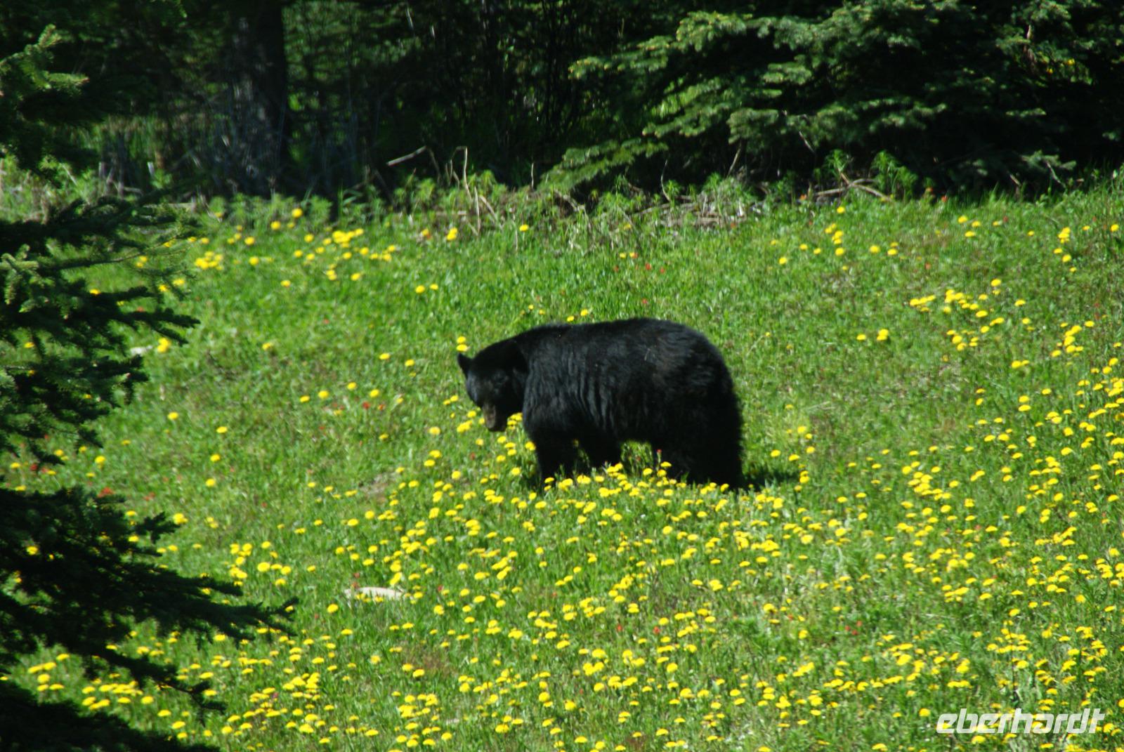 Ein schöner Morgen mit viel Sonnenschein erwartet uns. Wir frühstücken nochmals im Sage Bistro und begeben uns anschließend auf die Rückfahrt nach Jasper, wo wir wieder den Canadian nach Vancouver nehmen werden. Es folgt ein Fotostopp und nochmals ergibt sich die Möglichkeit den gewaltigen „Castle Mountain" aus unmittelbarer Nähe aufzunehmen. Über den Trans-Canada Highway und Icefield Parkway geht unsere Reise weiter. Plötzlich sehen wir einen großen PKW Auflauf auf dem Highway und sind uns sicher-Bär in Sicht.