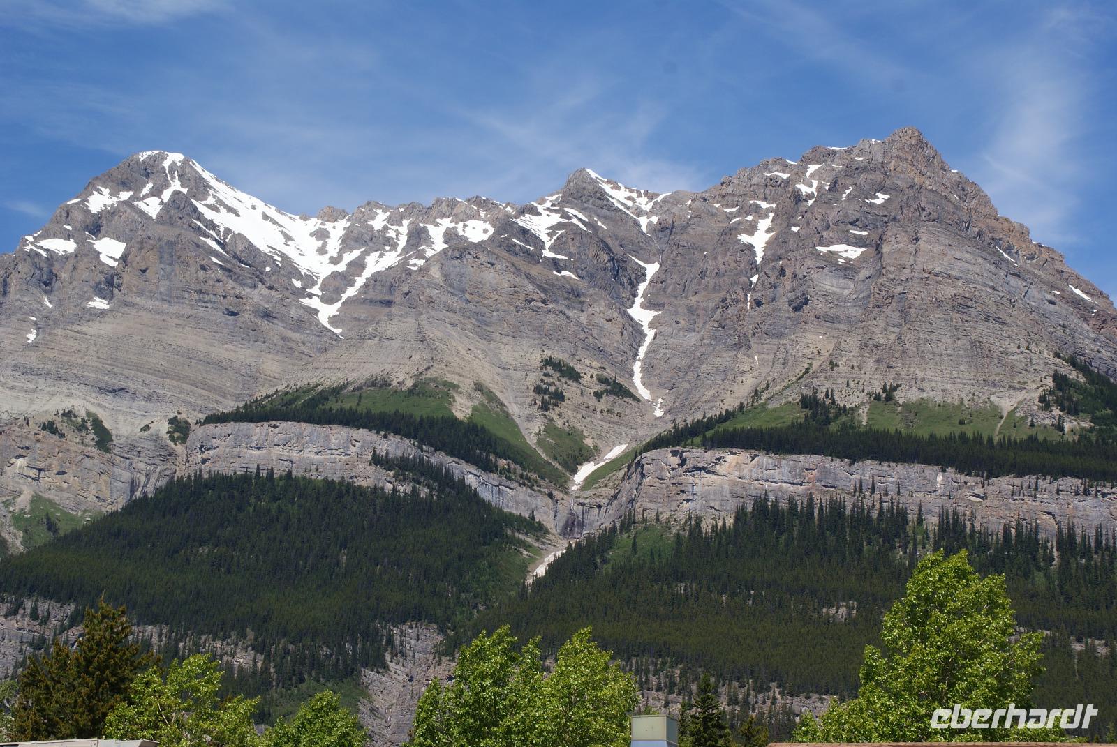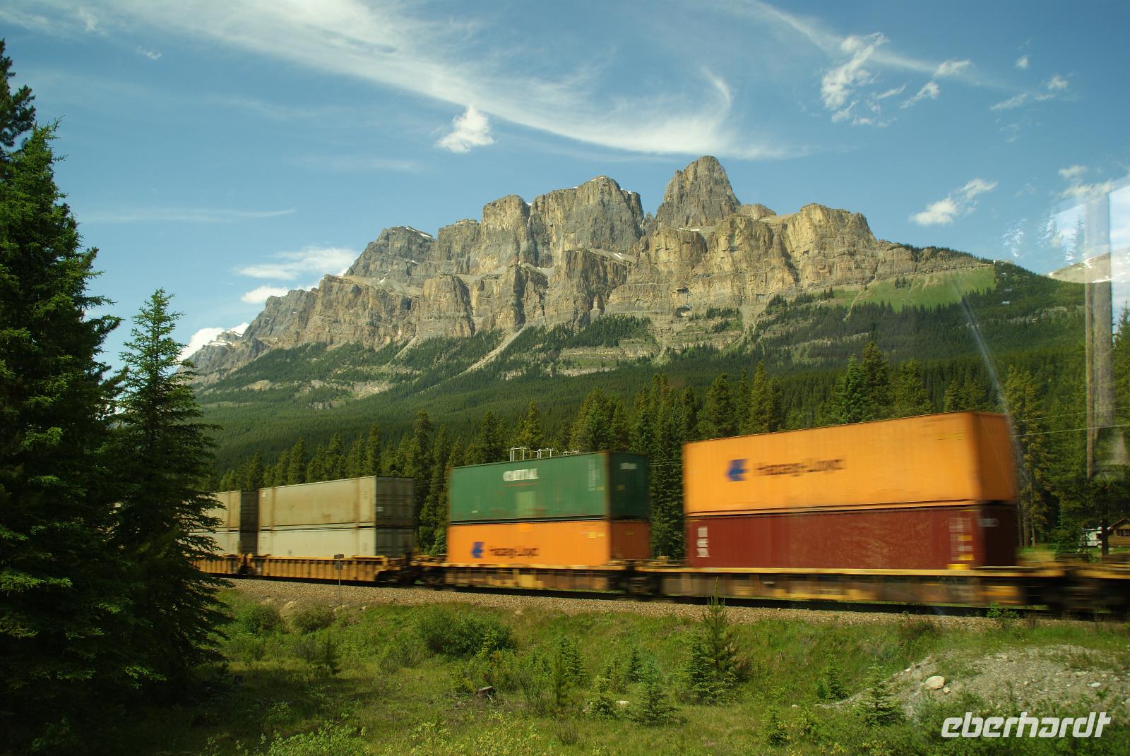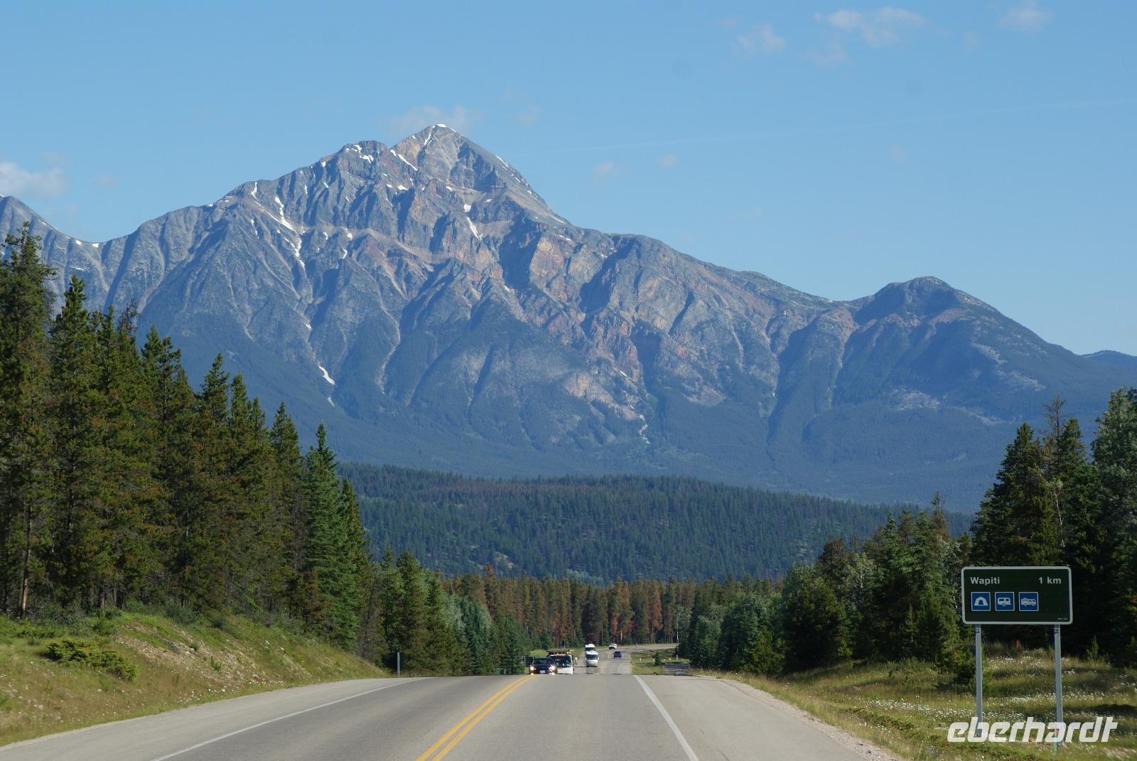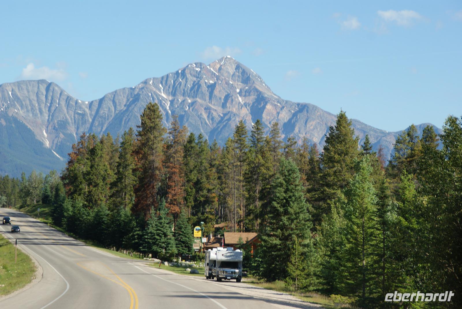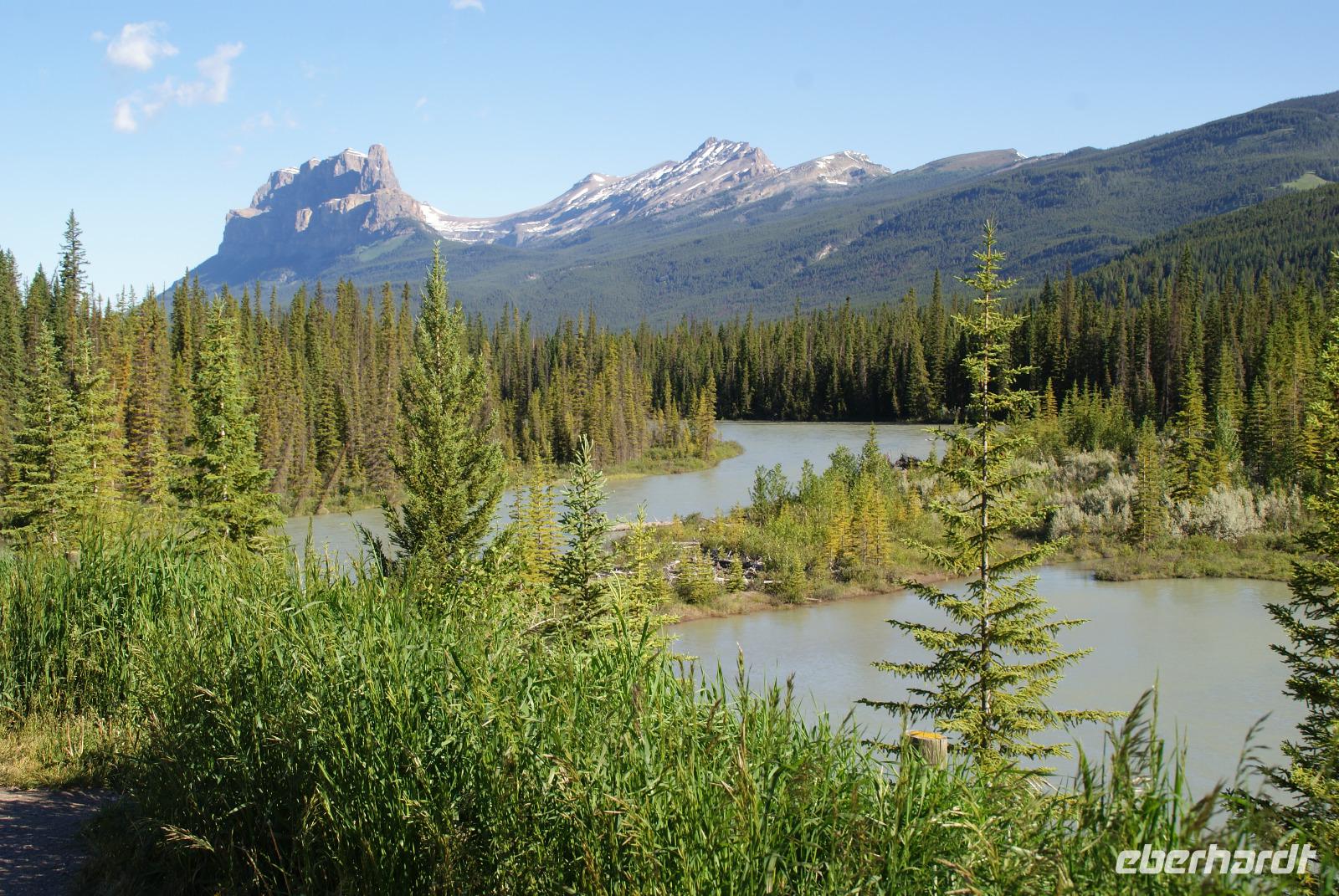 Ein schöner Morgen mit viel Sonnenschein erwartet uns. Wir frühstücken nochmals im Sage Bistro und begeben uns anschließend auf die Rückfahrt nach Jasper, wo wir wieder den Canadian nach Vancouver nehmen werden. Es folgt ein Fotostopp und nochmals ergibt sich die Möglichkeit den gewaltigen „Castle Mountain" aus unmittelbarer Nähe aufzunehmen. Über den Trans-Canada Highway und Icefield Parkway geht unsere Reise weiter. Plötzlich sehen wir einen großen PKW Auflauf auf dem Highway und sind uns sicher-Bär in Sicht.