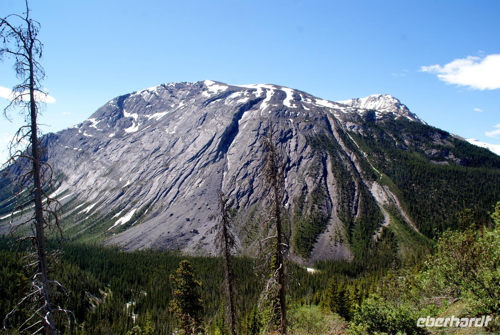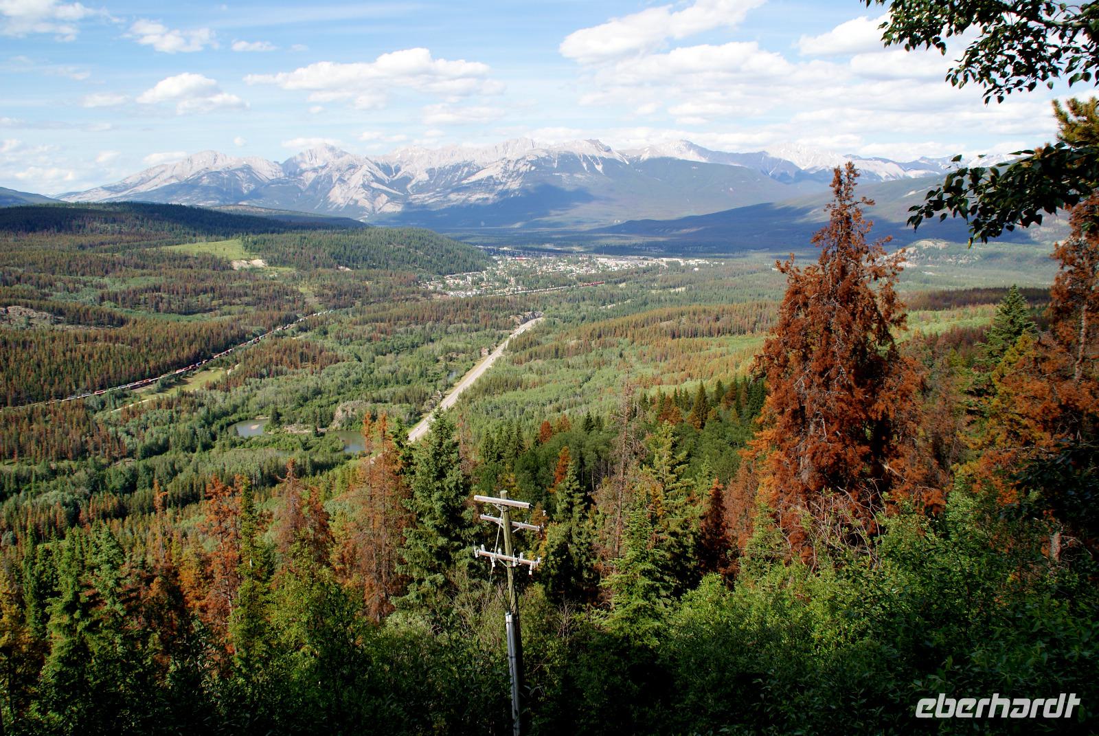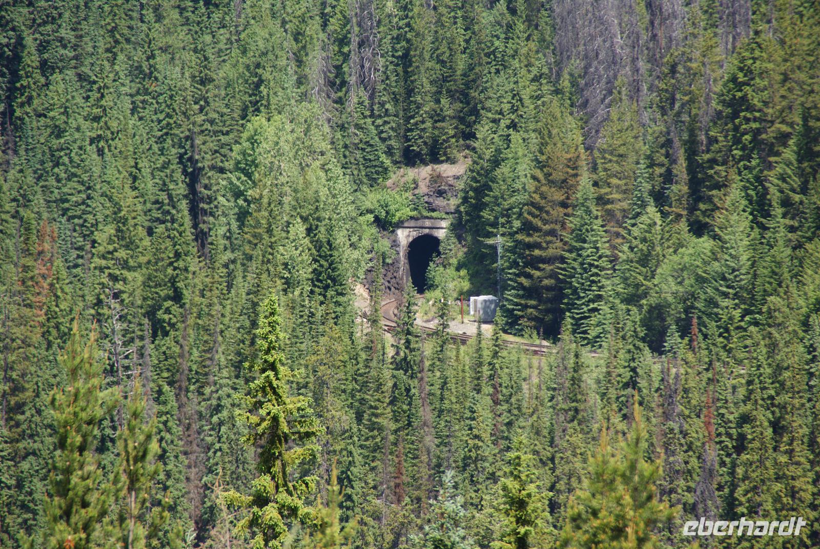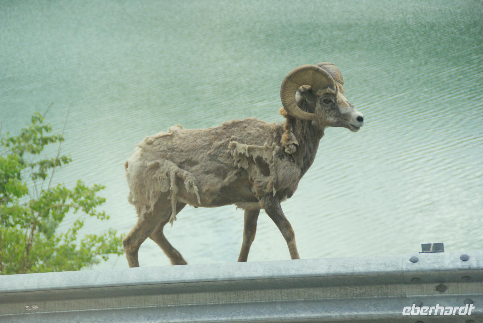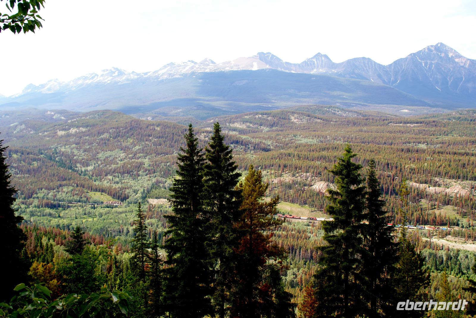 Ein schöner Morgen mit viel Sonnenschein erwartet uns. Wir frühstücken nochmals im Sage Bistro und begeben uns anschließend auf die Rückfahrt nach Jasper, wo wir wieder den Canadian nach Vancouver nehmen werden. Es folgt ein Fotostopp und nochmals ergibt sich die Möglichkeit den gewaltigen „Castle Mountain" aus unmittelbarer Nähe aufzunehmen. Über den Trans-Canada Highway und Icefield Parkway geht unsere Reise weiter. Plötzlich sehen wir einen großen PKW Auflauf auf dem Highway und sind uns sicher-Bär in Sicht.