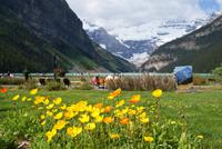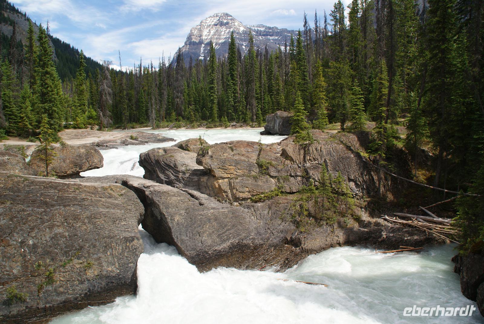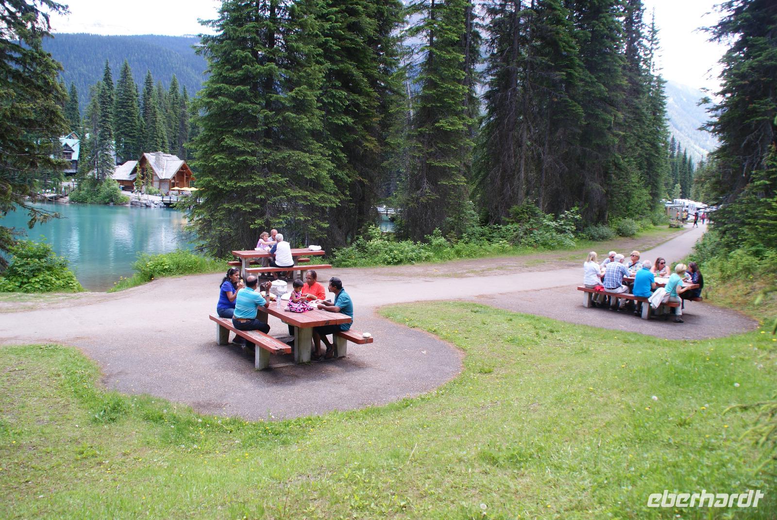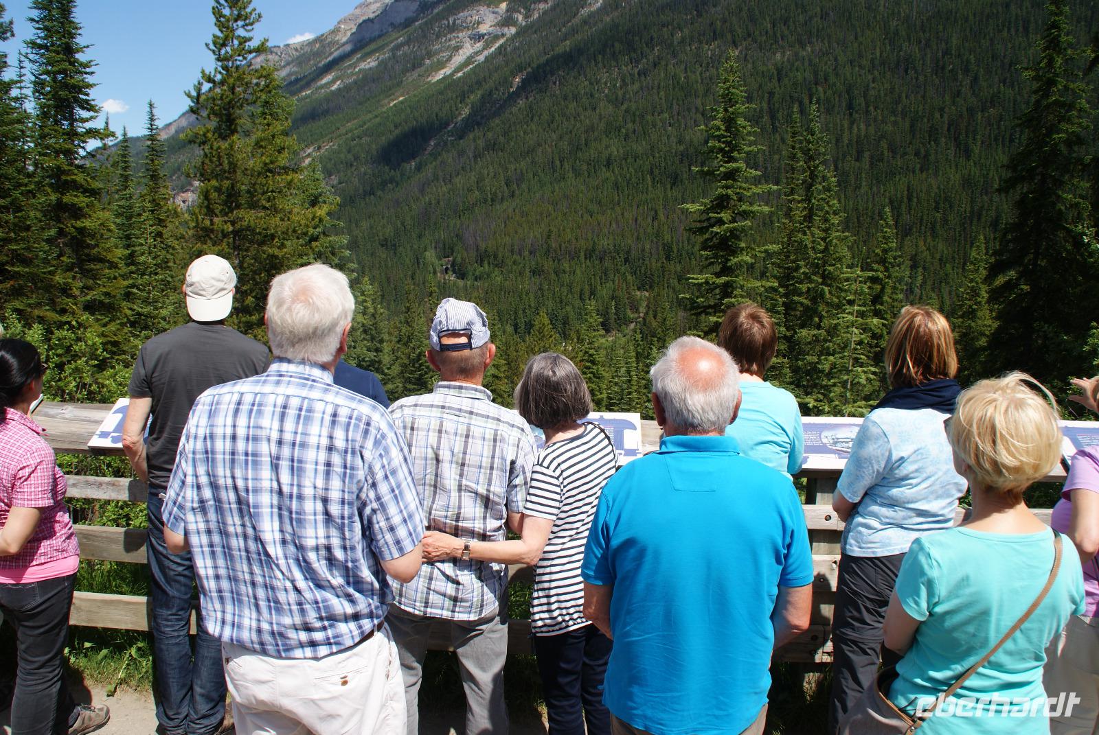 Hurra-es gibt frisches, deutsches Brot mit Aufschnitt und Käse zum Frühstück im Sage Bistro und wir sind schon mal begeistert. Gut gestärkt beginnen wir unseren heutigen Tag mit einer Fahrt entlang des Bow Rivers und halten als erstes am Moraine Lake. Um eine besonders schöne Sicht auf den See und das „Tal der zehn Gipfel" zu bekommen, wandern wir den Gebirgspfad nach oben. Angekommen bietet sich uns eine traumhafte Kulisse. Wir können uns nicht satt sehen, einfach wunderbar. Die schneebedeckten Berge, dazu das smaragd-farbene Wasser, idyllischer geht es beinahe nicht mehr...(wenn da nicht die anderen Touristen wären, die das auch so finden wie wir...). Als nächstes Ziel erreichen wir Lake Louise mit dem gleichnamigen Hotel, das ebenfalls zur Fairmont Kette gehört. Wieder eine tolle Kulisse mit Bergwelt und See, dessen Farbe uns verzaubert. Auch hier sind wir (leider) nicht alleine und ziehen fort-auf zu neuen Abenteuern. Ein weiterer Halt am Spiraltunnel erfolgt und alle zücken die Kameras, in der Hoffnung, dass ein Güterzug einfährt...leider haben wir die Rechnung ohne die Eisenbahn gemacht und natürlich lässt sich gerade jetzt kein Zug blicken...Was soll's, wir fahren weiter zu unserem Mittagsstopp am Emerald Lake und machen ein leckeres Picknick umgeben von idyllischer Natur. Danach spazieren wir zur „Natural Bridge" und staunen über die Wassermassen, die sich unterhalb der Naturbrücke durchzwängen und erst recht über deren Geschwindigkeit. Für heute haben wir genug Natur, Berge, Seen und Wasserfälle und freuen uns auf das quirlige Banff, in dem wir unsere Freizeit genießen, die Stadt und die Geschäfte erkunden. Am Abend erfolgt ein leckeres Abendessen im „Patrinos" und die meisten von uns sitzen danach noch in gemütlicher Runde draußen vor dem Hotel. Herrlich, es ist bis 22.30 Uhr taghell, dazu noch diese milden Temperaturen. Können wir die Zeit nicht einfach anhalten?