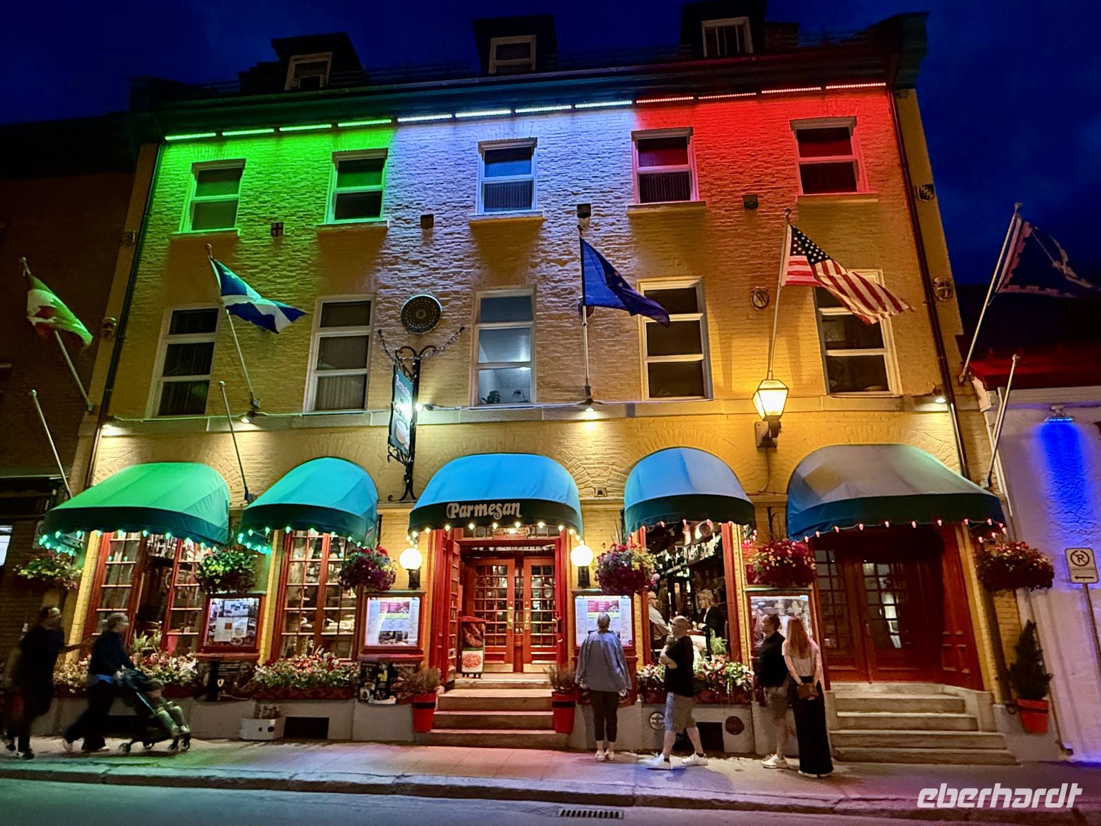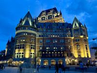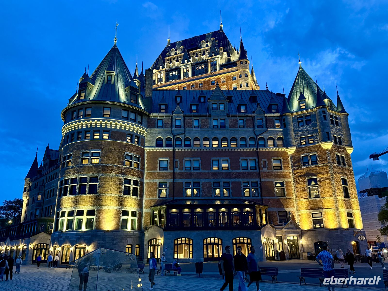 In Québec City angekommen, wartete unsere lokale Stadtführerin Nadia bereits sehnsüchtig auf uns. Am späten Nachmittag checkten wir im Hotel ein. Nach einer kurzen Erholungspause und etwas Zeit zum Frischmachen traf sich ein Teil der Gruppe zum gemeinsamen Abendessen in einem Restaurant in der Altstadt. Im Anschluss daran machten wir noch einen kleinen Stadtrundgang durch das abendliche Québec. Die historische Altstadt, ein UNESCO-Weltkulturerbe, war wunderschön beleuchtet und strahlte eine besondere Atmosphäre aus. Besonders beeindruckt waren wir vom Château Frontenac – dem berühmten Hotel, das majestätisch über der Stadt thront und als eines der meistfotografierten Hotels der Welt gilt.