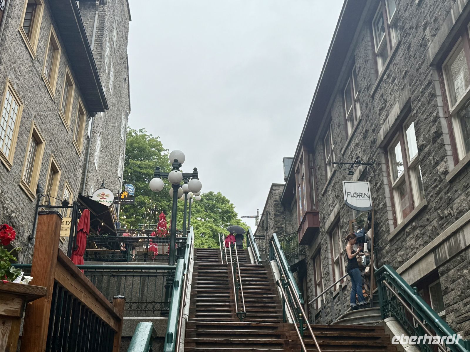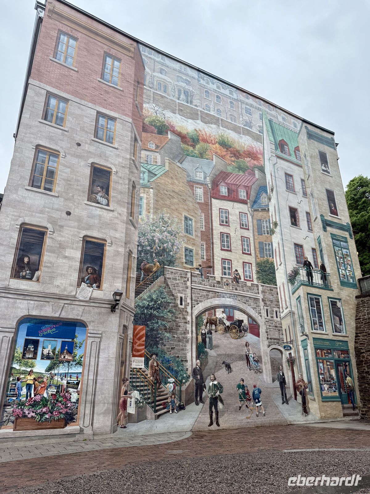 In der Unterstadt bestaunten wir das berühmte Wandgemälde „Fresque des Québécois“, das historische Szenen und bekannte Persönlichkeiten der Stadtgeschichte darstellt. Über die steile „Genickbruchtreppe“ (Escalier Casse-Cou), eine der ältesten Treppen der Stadt, ging es dann hinab zur Petit-Champlain-Straße – einer der ältesten Einkaufsstraßen Nordamerikas mit charmanten Boutiquen und Cafés.