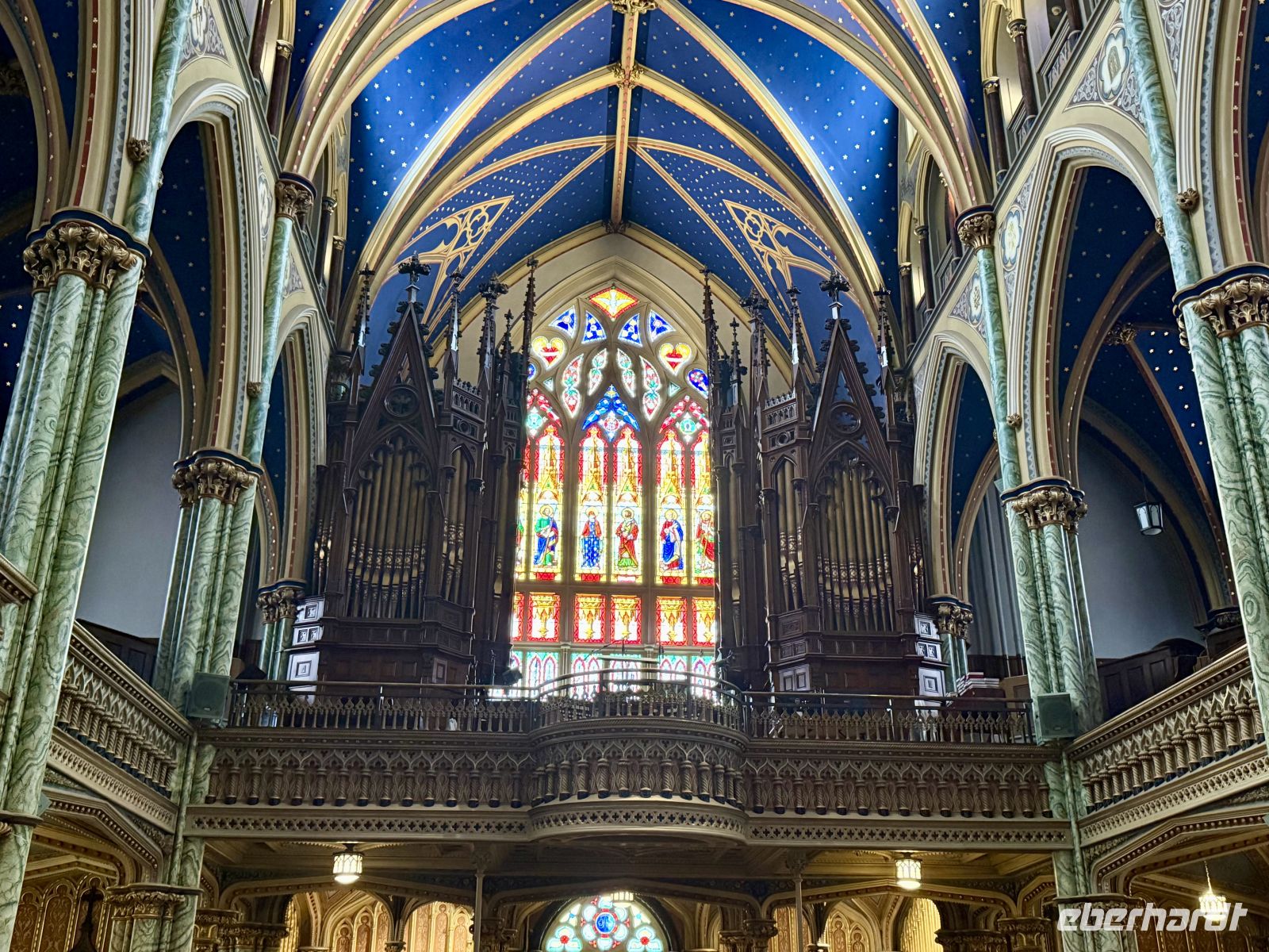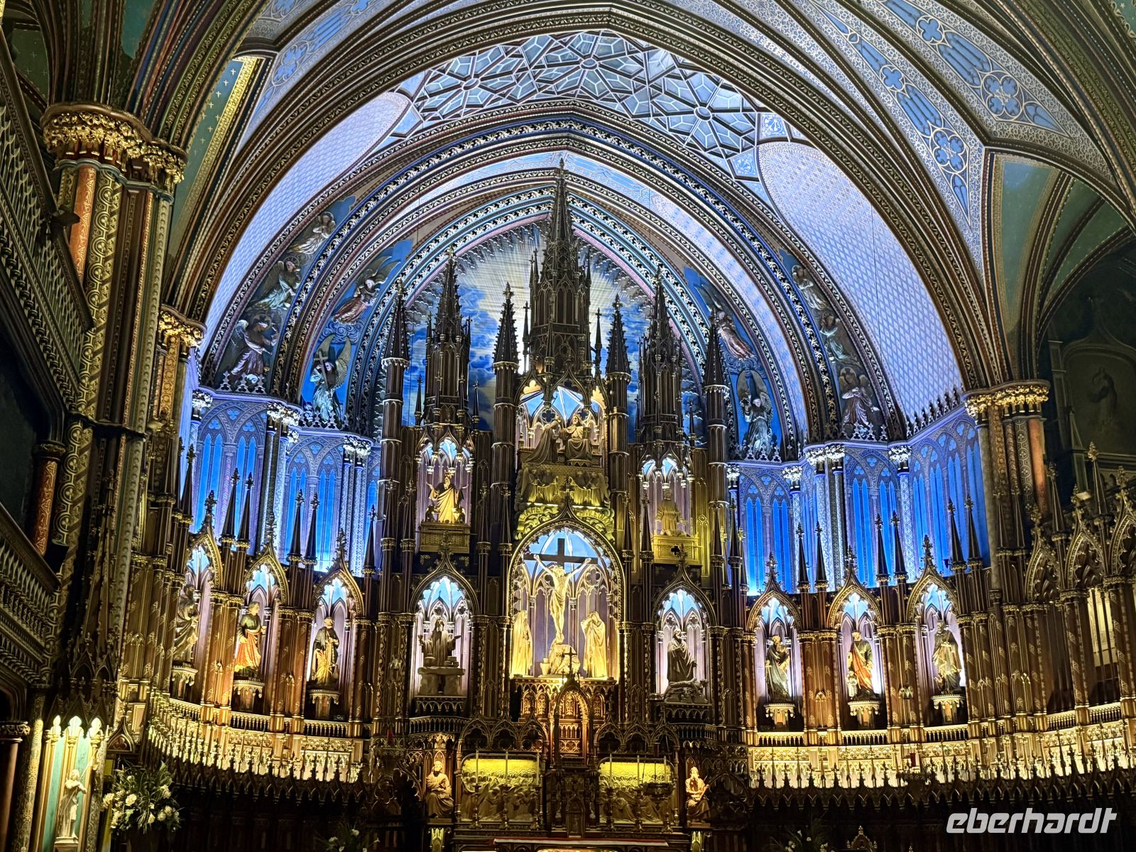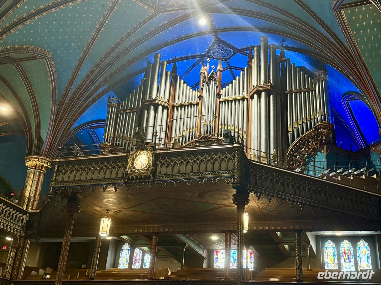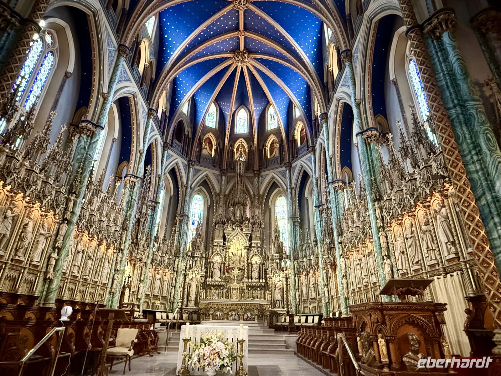 In Montréal angekommen, verabschiedeten wir uns von unserer charmanten Stadtführerin Nadia und begrüßten wieder Louis, der uns bereits in Montréal erwartet hatte. Es folgte eine informative Stadtrundfahrt durch Montréal, die größte Stadt der Provinz Québec und eine der größten frankophonen Städte der Welt. Montréal liegt auf einer Insel im gleichnamigen Fluss und ist ein spannender Mix aus europäischer Geschichte und moderner Urbanität. Wir machten einen Fotostopp, von dem aus man einen herrlichen Blick über die Skyline von Montréal genießen konnte. Danach fuhren wir weiter zur berühmten Basilika Notre-Dame. Die Notre-Dame-Basilika wurde im Jahr 1829 fertiggestellt und ist somit fast 200 Jahre alt. Obwohl sie nicht als Kathedrale gilt, beeindruckt sie mit ihrer prachtvollen neogotischen Architektur und ihrer riesigen Orgel mit über 7.000 Pfeifen. Das kunstvoll gestaltete Innere mit geschnitzten Holzarbeiten, Buntglasfenstern und einer leuchtend blauen Decke zählt zu den schönsten Kirchenräumen Nordamerikas.