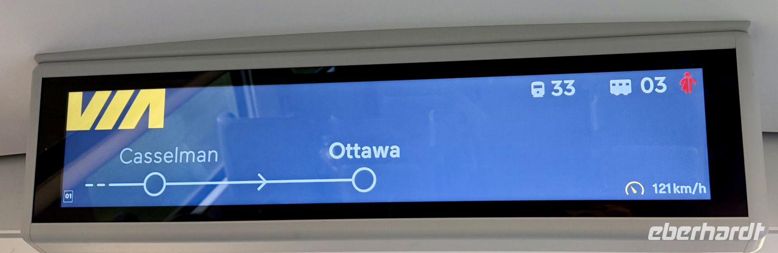Der „Canadian“ verkehrt planmäßig zweimal pro Woche: ab Toronto sonntags und mittwochs, ab Vancouver montags und donnerstags. Insgesamt kann der Zug bis zu 260 Passagiere aufnehmen; auf unserer Fahrt waren etwa 200 Gäste an Bord. Der Zug bestand aus 20 Wagen, darunter Schlafwagen, Speisewagen, Aussichtswagen mit Glaskuppeln („Dome Cars“) sowie Loungewagen.