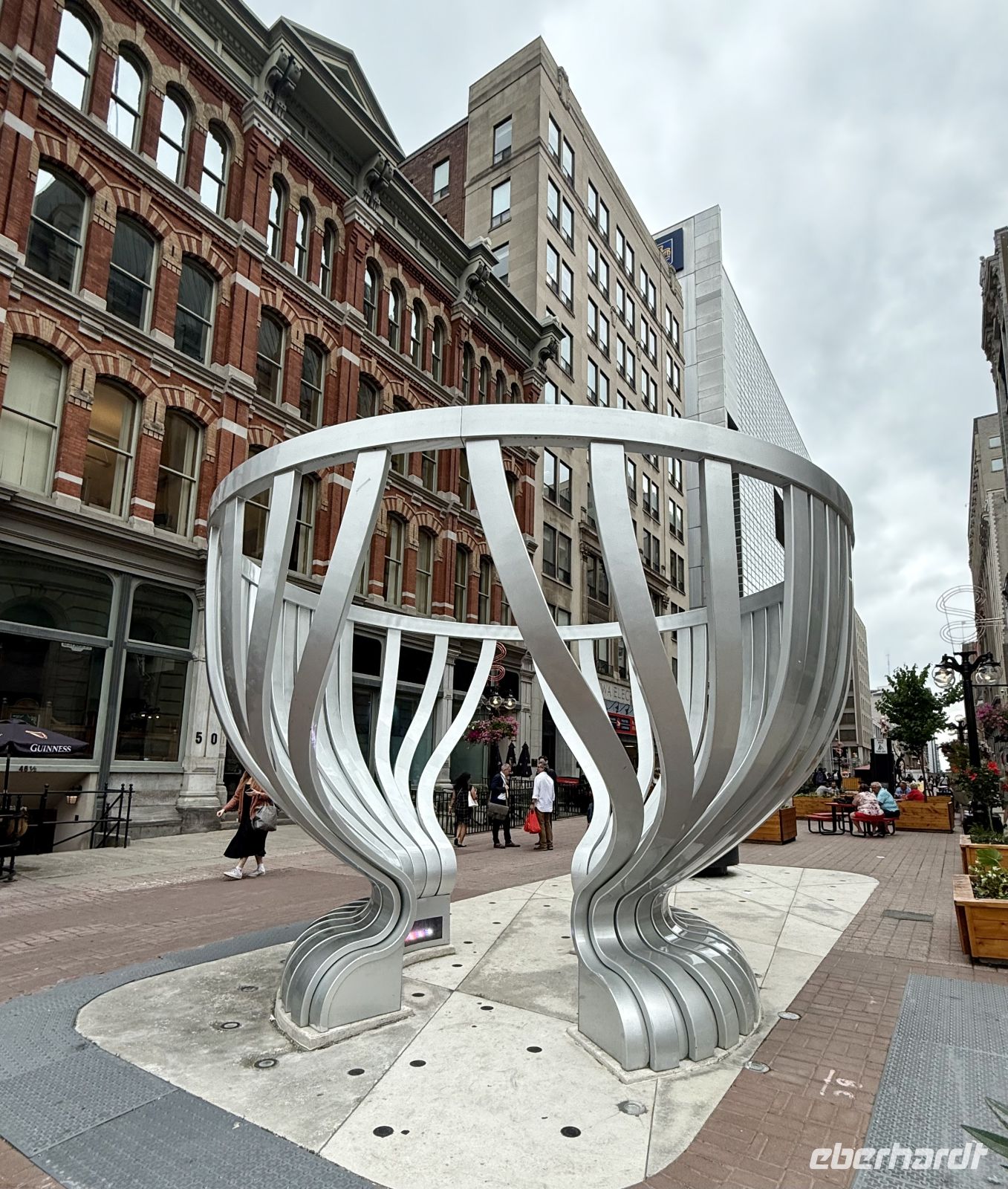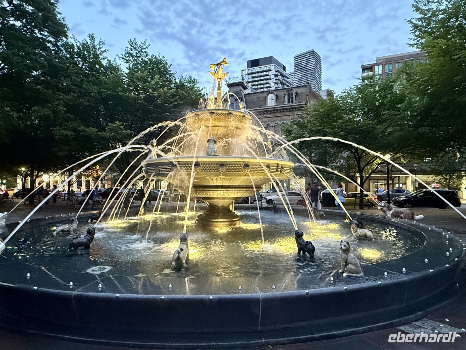 Am Abend fuhren wir mit dem Bus zu einem Restaurant, wo wir gemeinsam ein leckeres Abendessen genossen. Danach unternahmen wir noch einen kleinen Spaziergang zum sogenannten Hundebrunnen („Dog Fountain“) im Berczy Park – ein ungewöhnlicher und charmant gestalteter Brunnen, dessen Hauptfigur ein großer Knochen ist, umgeben von 27 kleineren Hunden, die scheinbar das Zentrum anbellen. Ein Katzenskulptur thront am Rand – der heimliche Star des Brunnens.