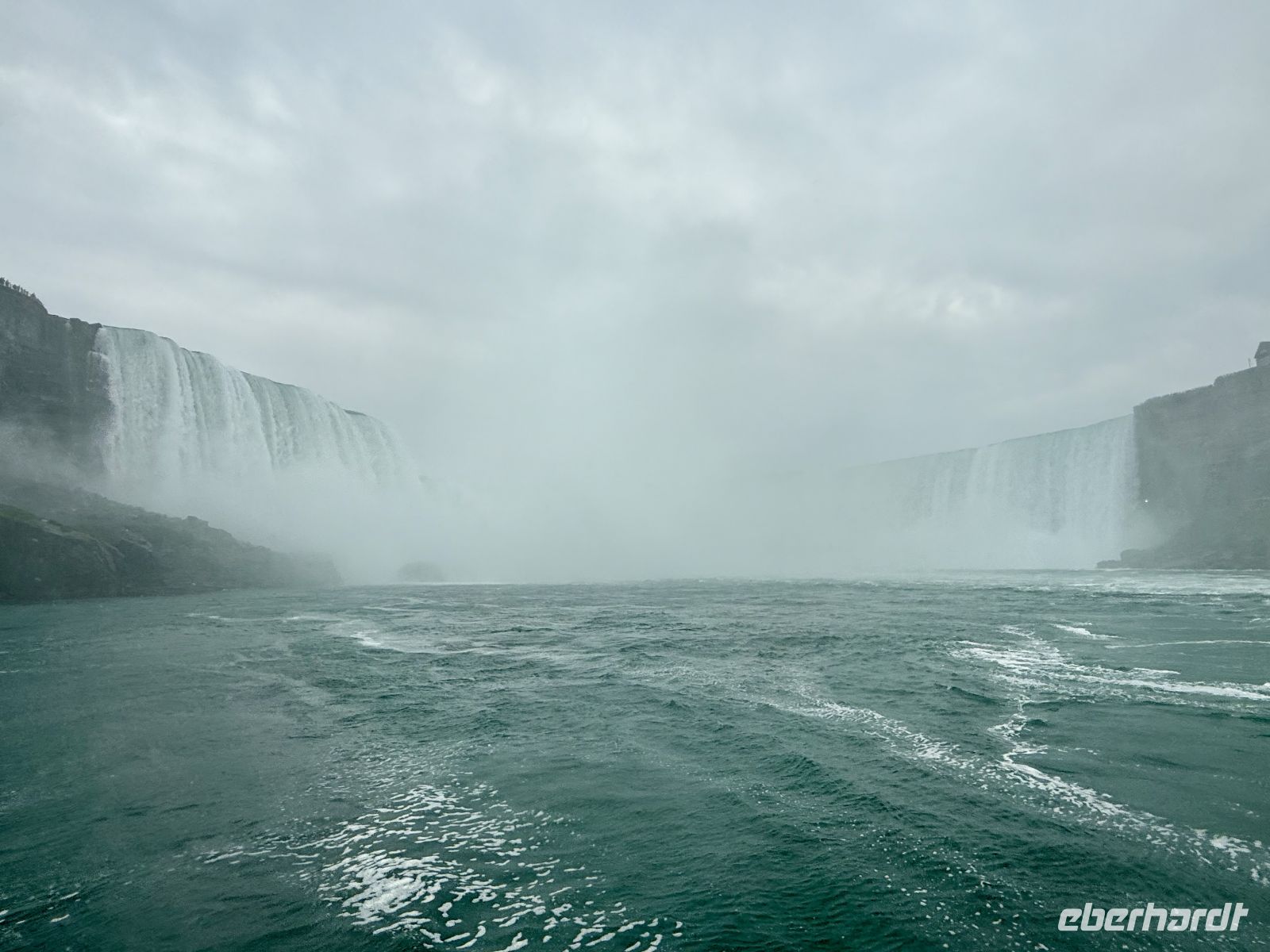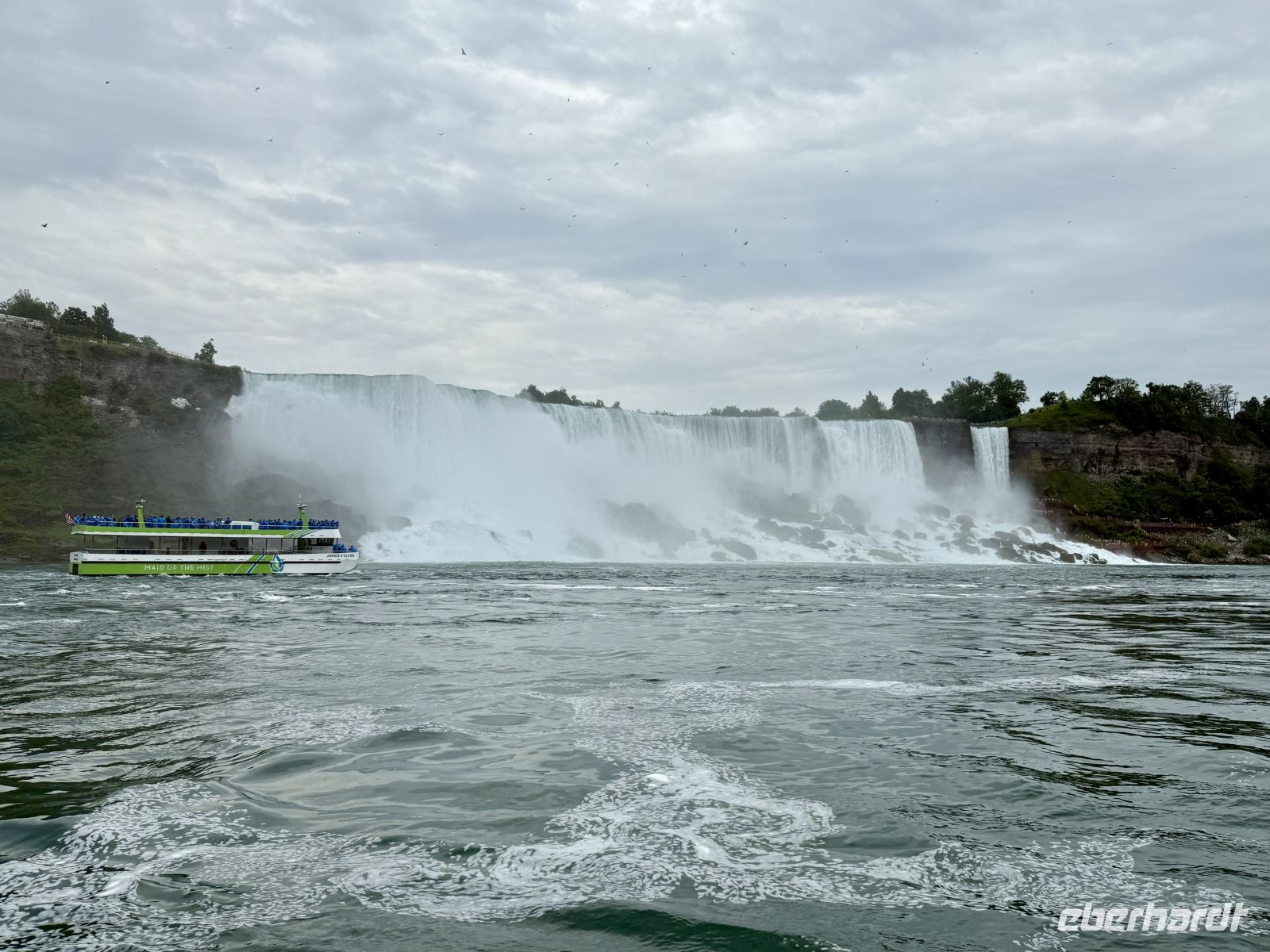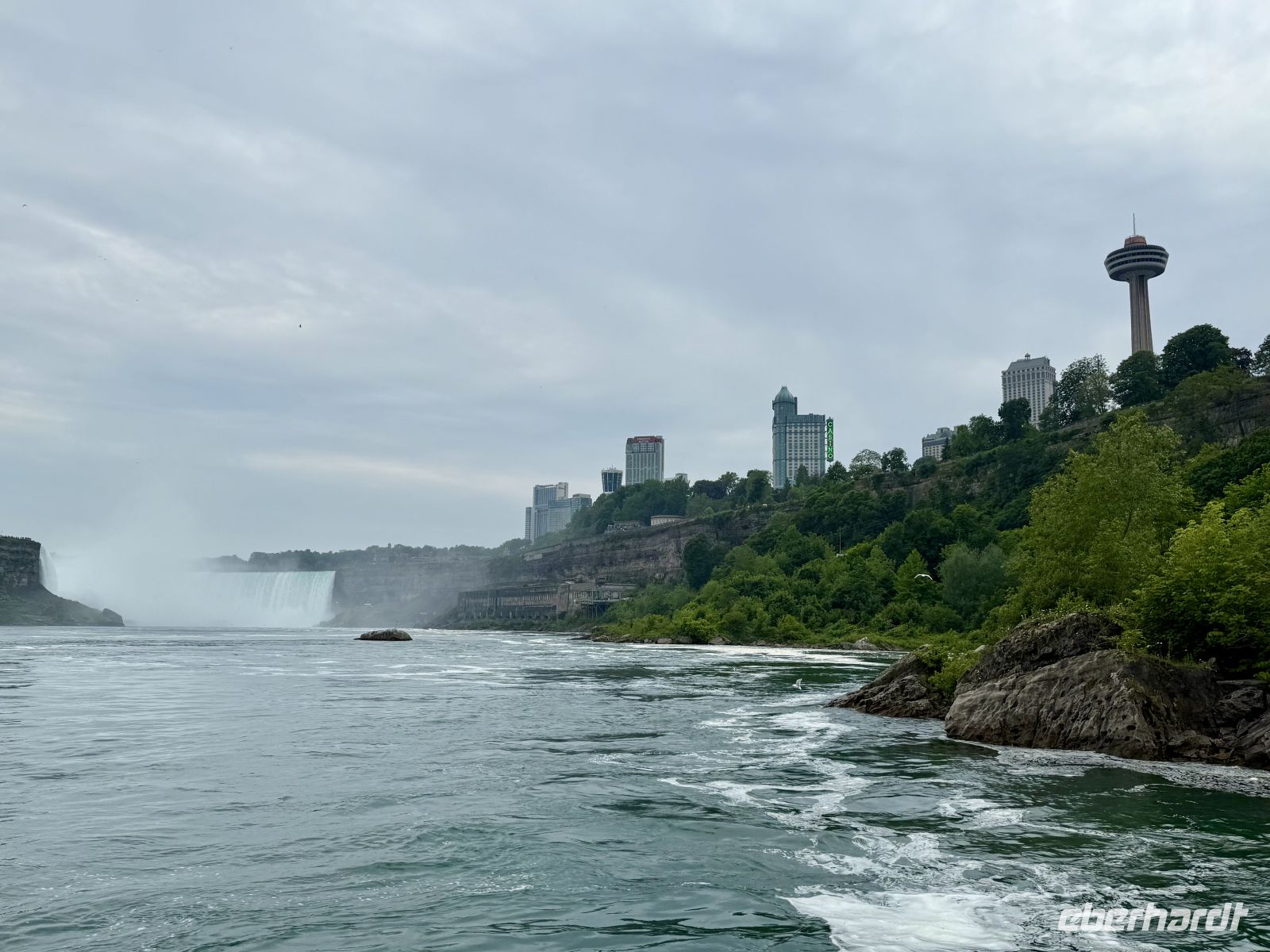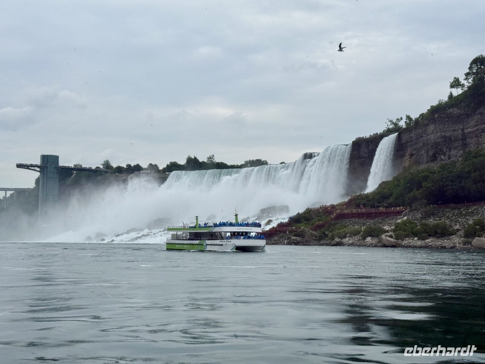 Nach unserer Ankunft an den Niagarafällen begaben wir uns direkt zum Bootsanleger, um das Naturspektakel aus nächster Nähe zu erleben. An Bord eines der berühmten Ausflugsboote fuhren wir ganz nah an die tosenden Wassermassen heran – ein atemberaubendes Erlebnis! Die Niagarafälle bestehen aus drei Teilen: den Horseshoe Falls (auf kanadischer Seite), den American Falls und den kleineren Bridal Veil Falls (beide auf US-amerikanischer Seite). Der gewaltige Wasserstrom, der hier über die Kante stürzt, erzeugt eine Gischt, die uns angenehm erfrischte – eine willkommene Abkühlung an diesem Tag. Es war für uns alle sehr beeindruckend, diese Naturgewalt aus nächster Nähe zu erleben.
